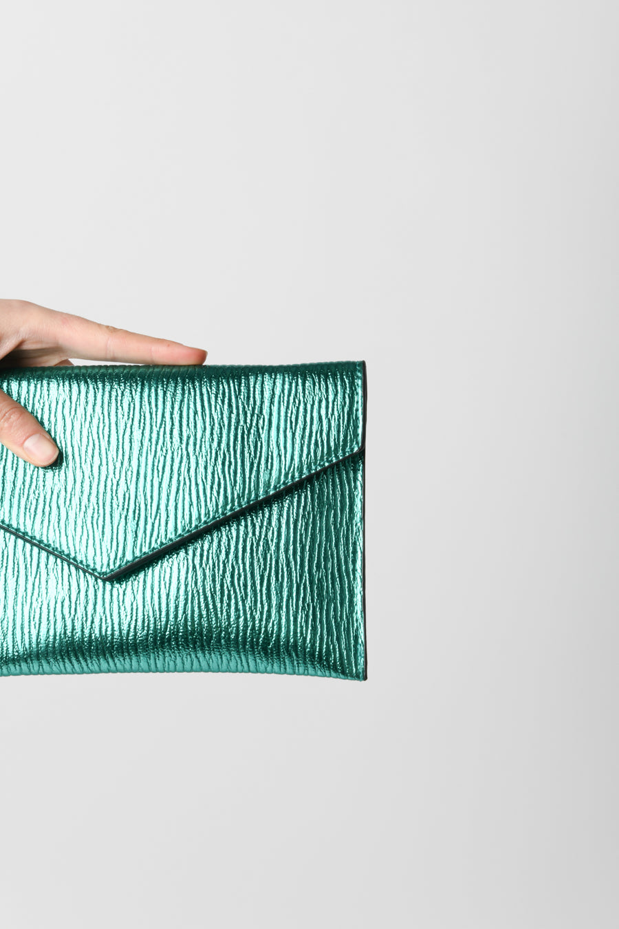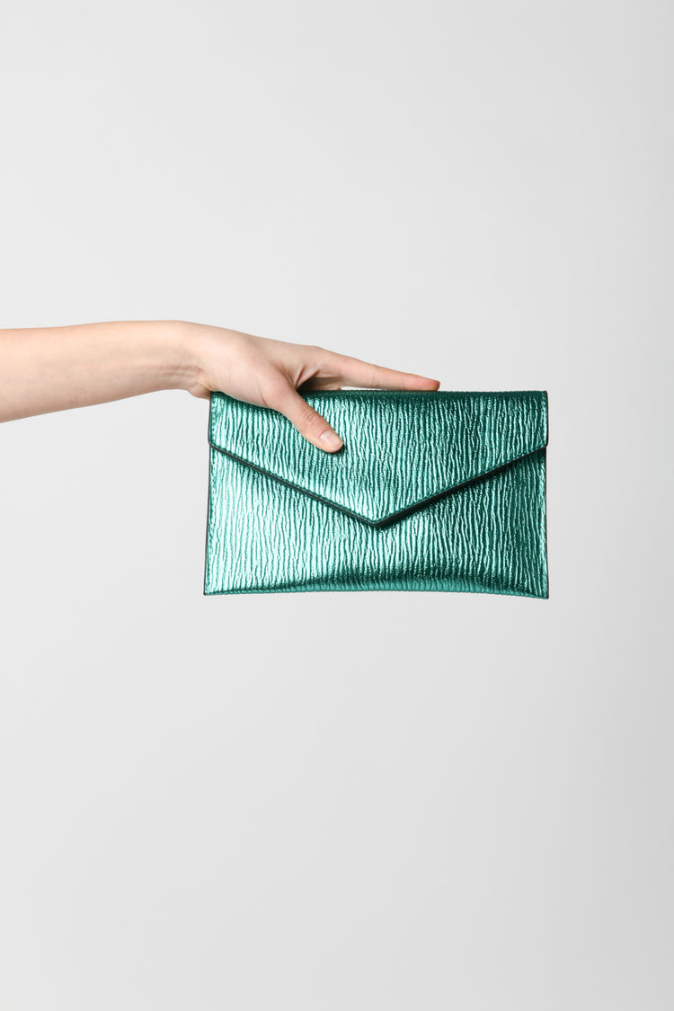 Pochette in similpelle verde laminata e testurizzata con risvolto a busta e chiusura magnetica nascosta.