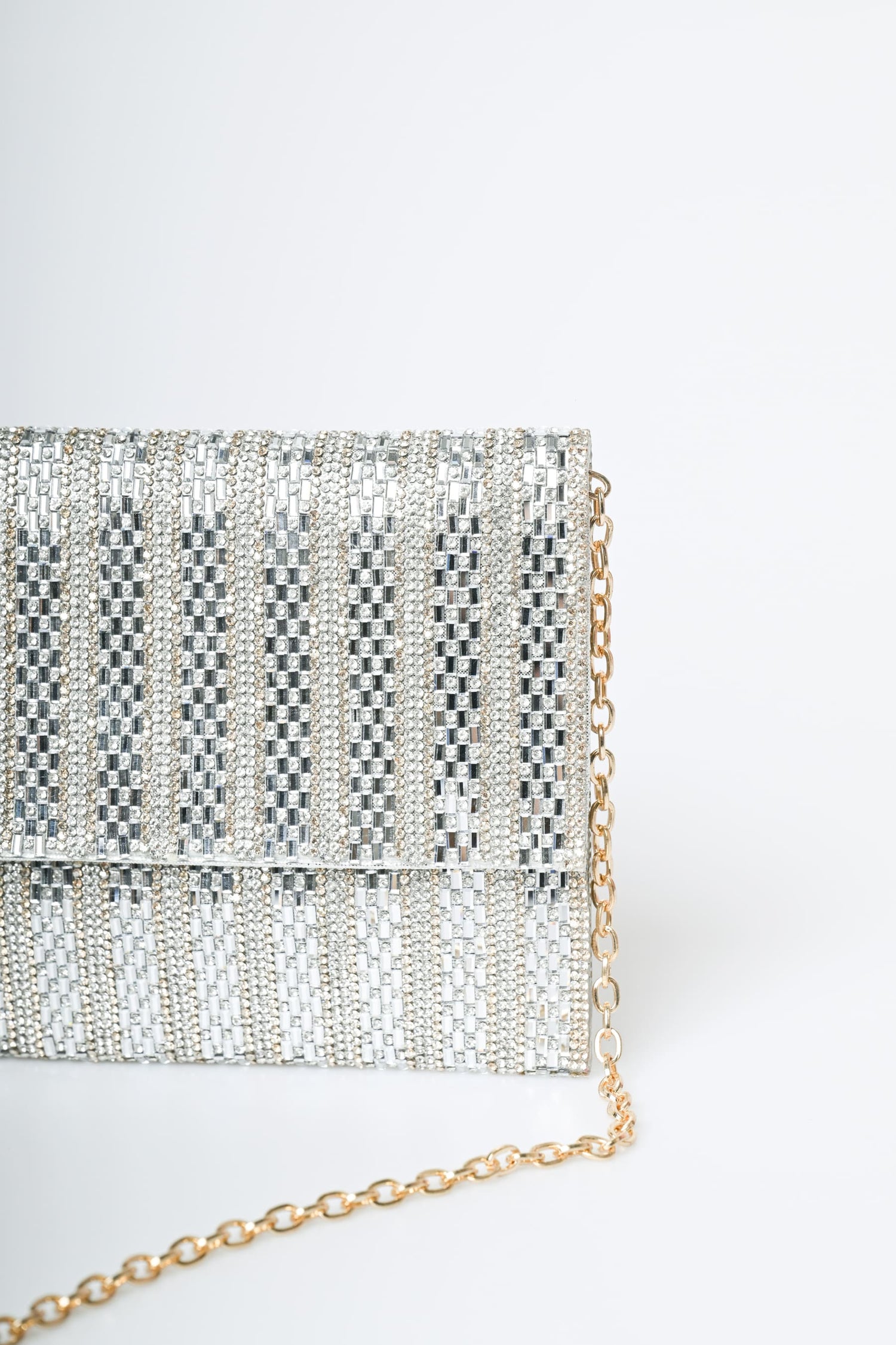 Pochette piatta impreziosita da righe in strass nei toni dellargento con risvolto e tracolla a catenella rimovibile in metallo dorato.