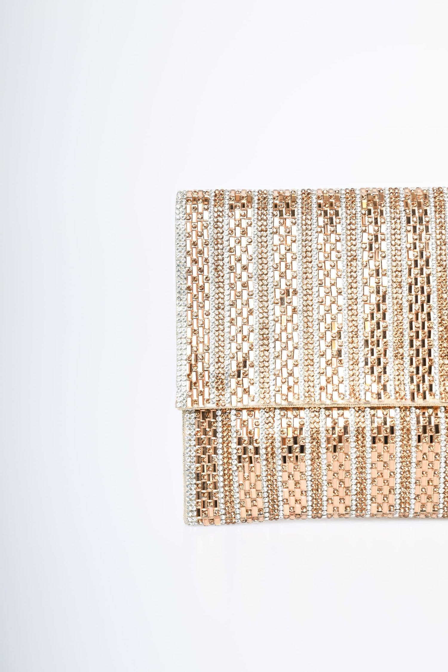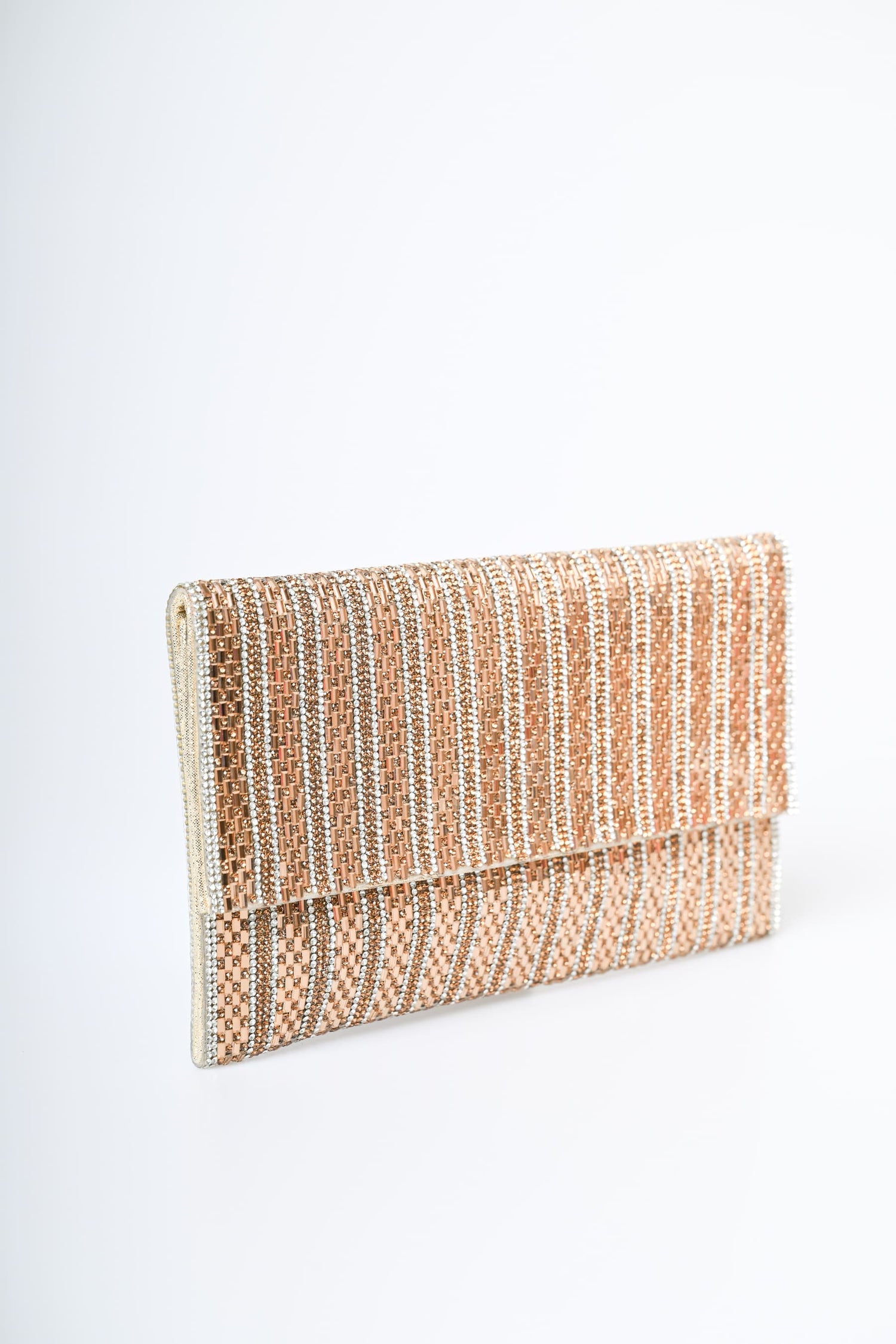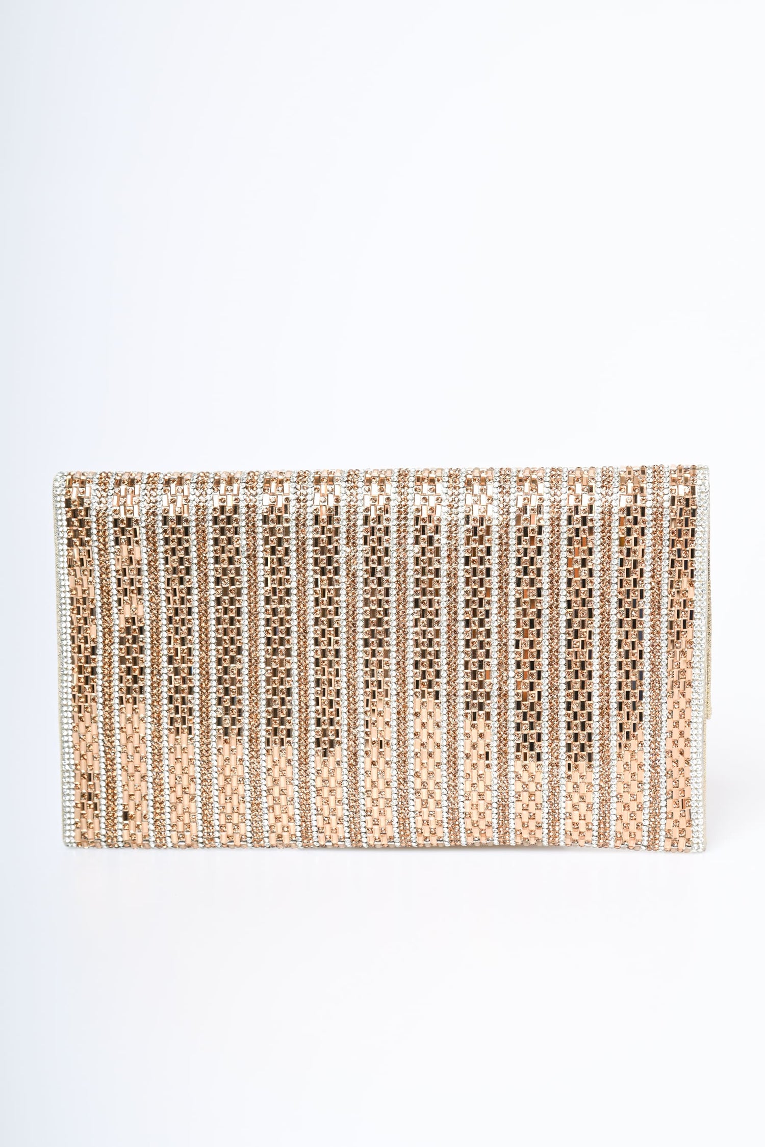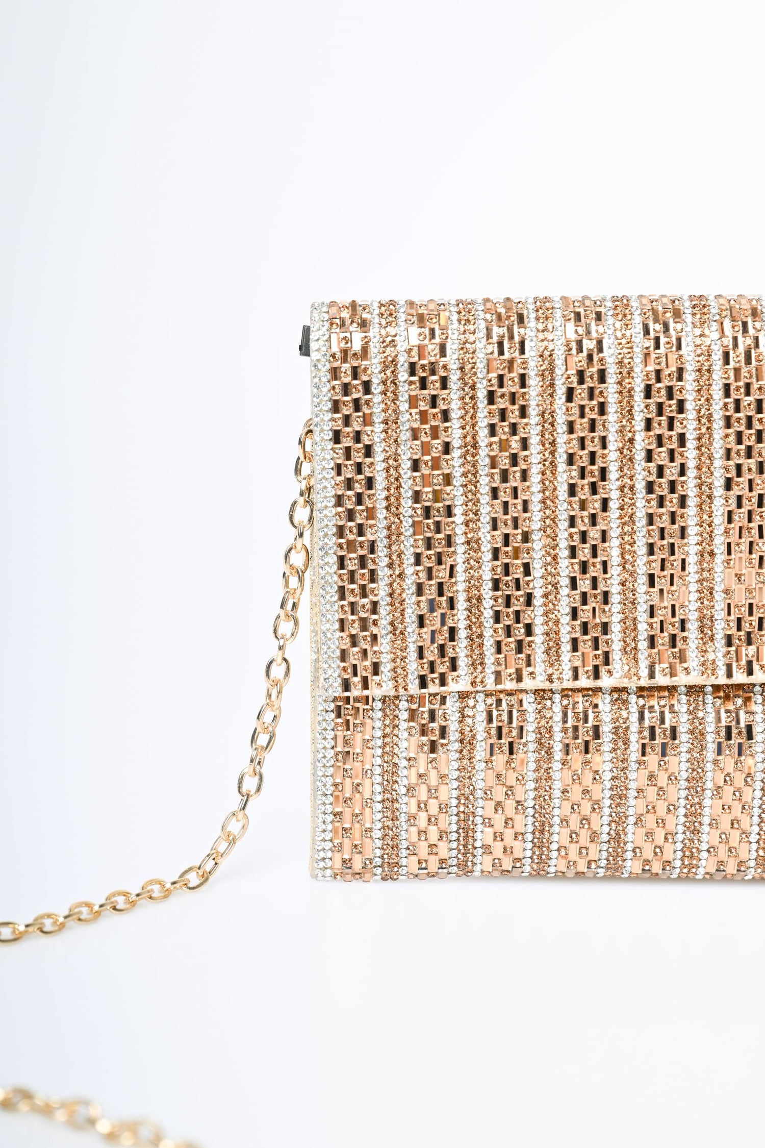 Pochette piatta impreziosita da righe in strass nei toni delloro e argento con risvolto e tracolla a catenella rimovibile in metallo dorato.