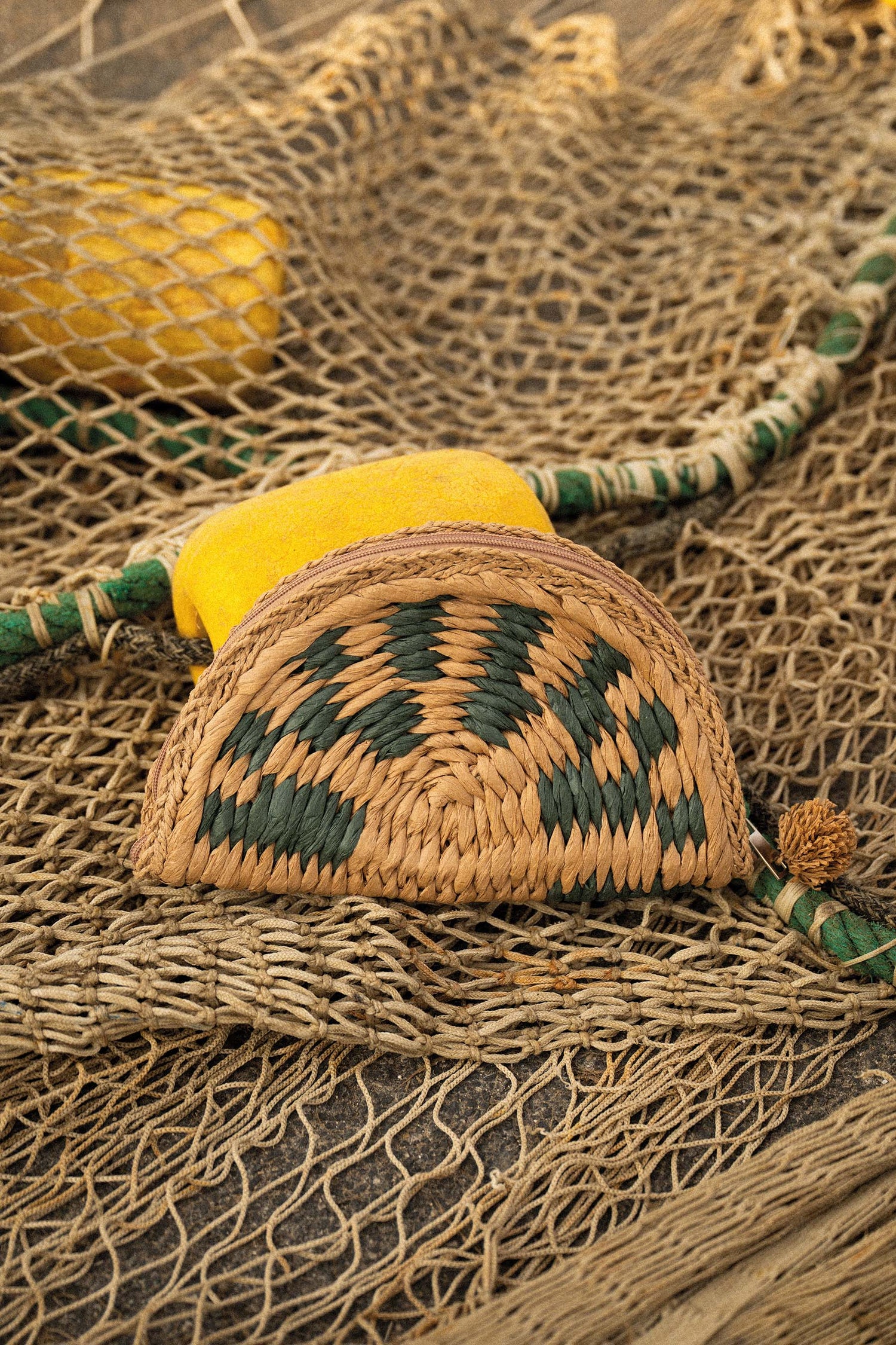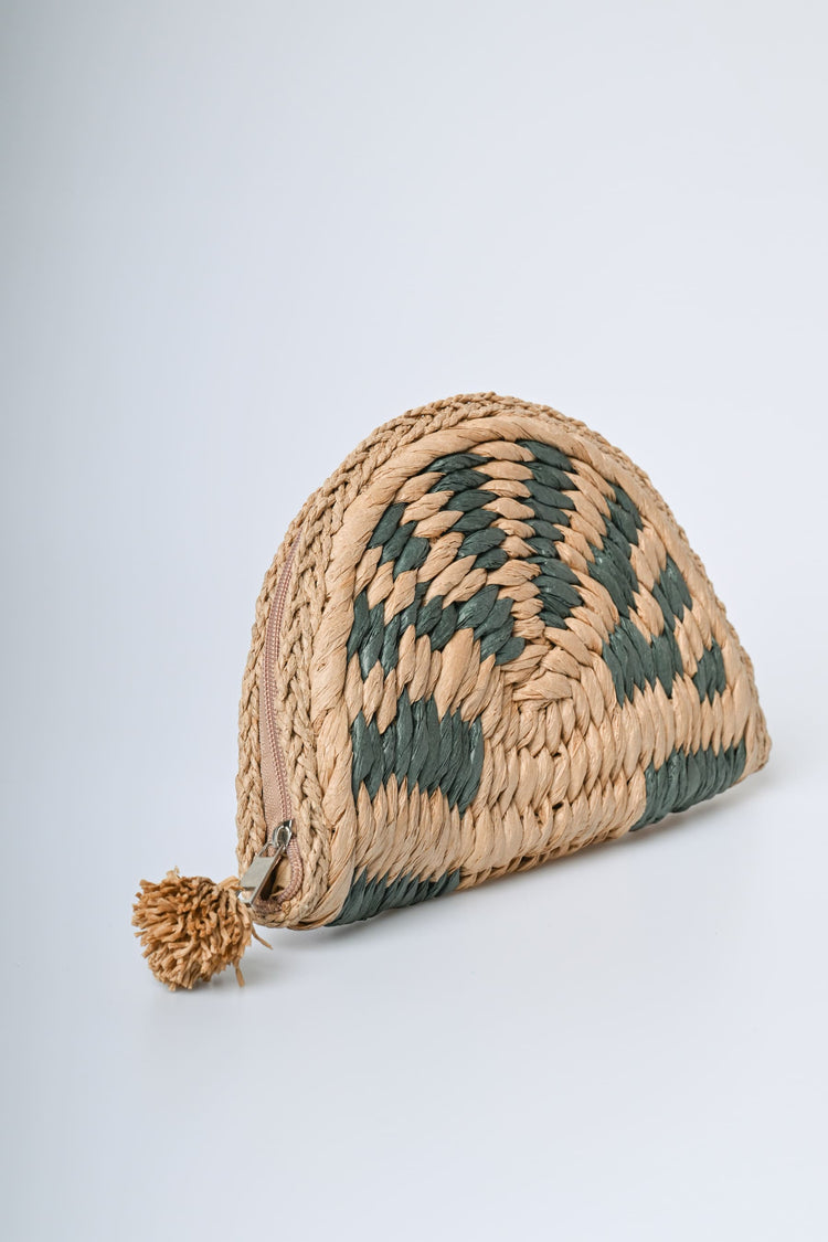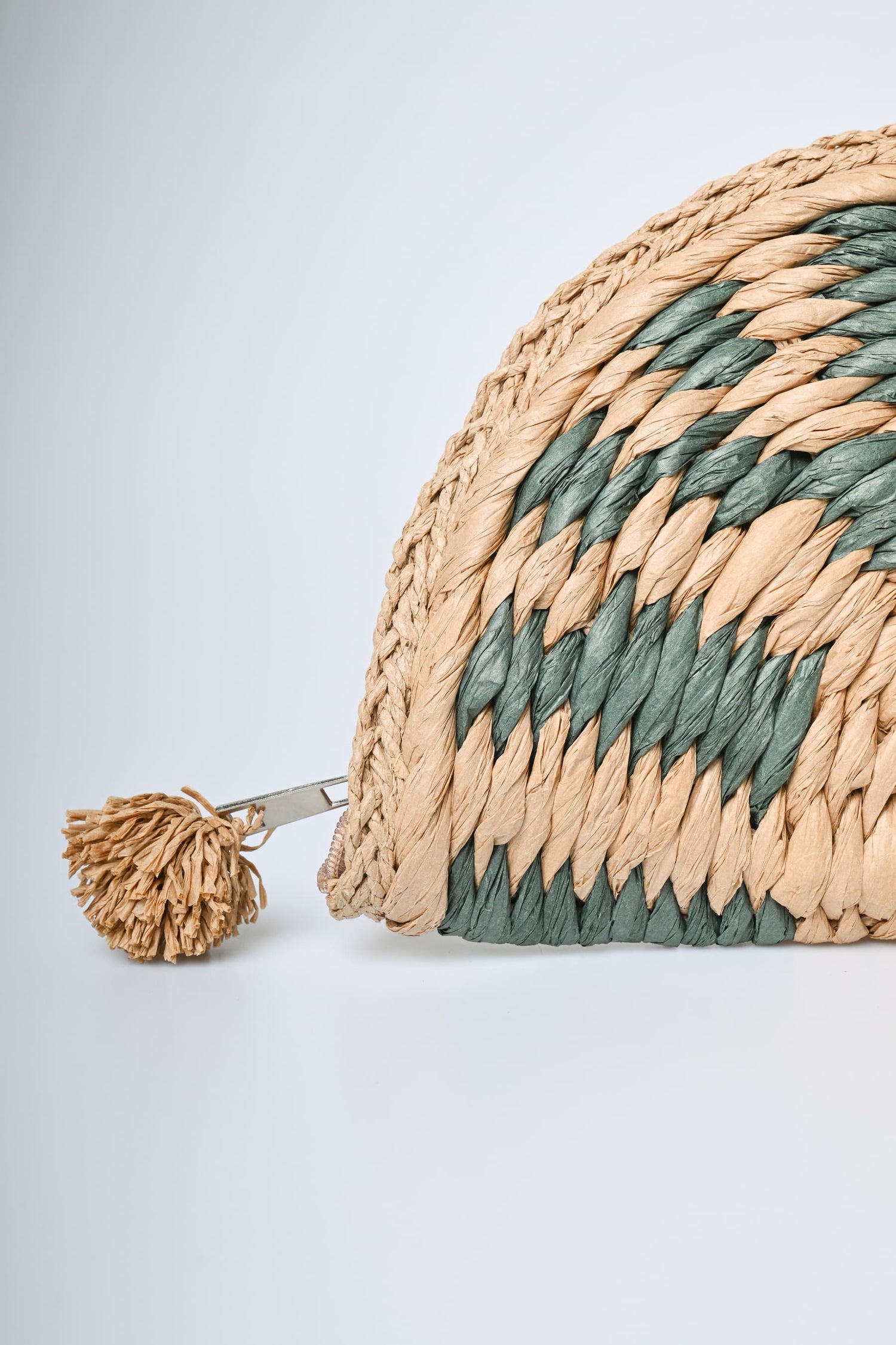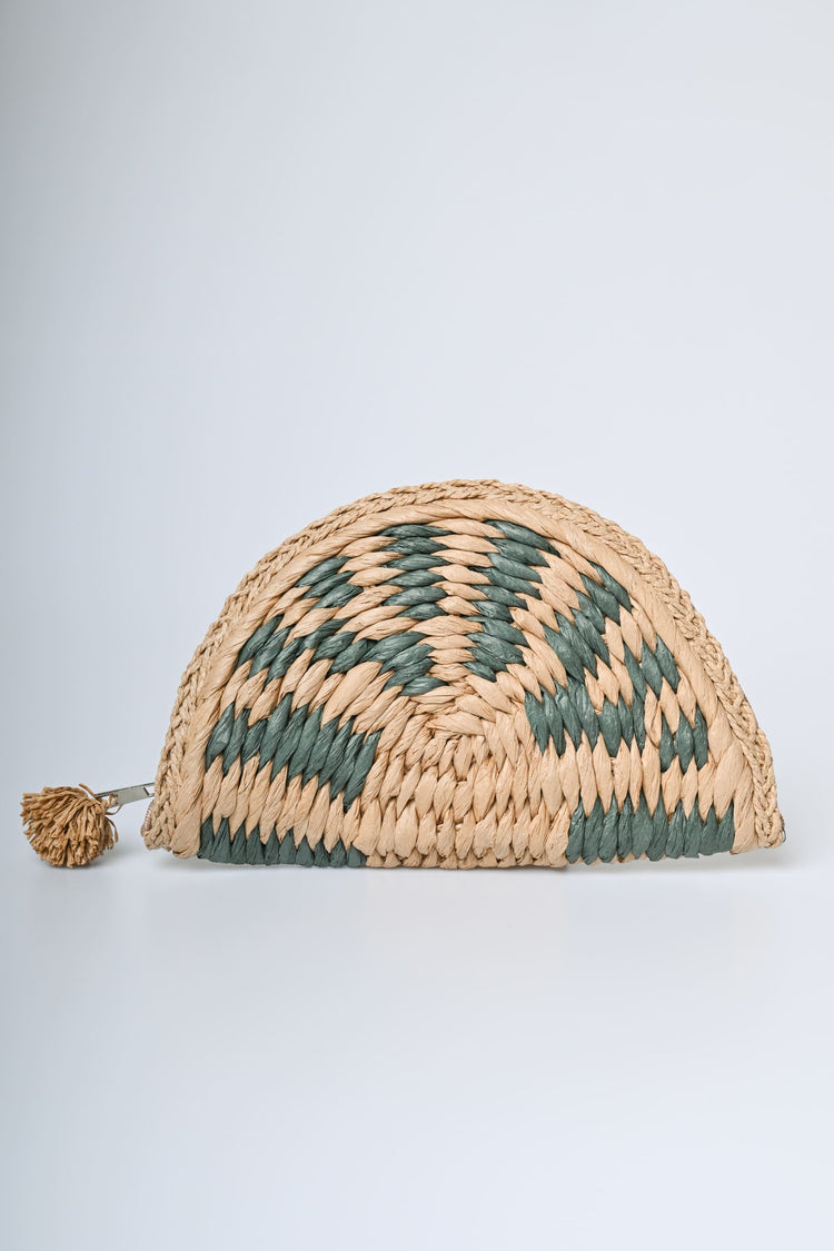 Pochette a mezzaluna in rafia intrecciata beige e verde con zip di chiusura e charm sfrangiato.