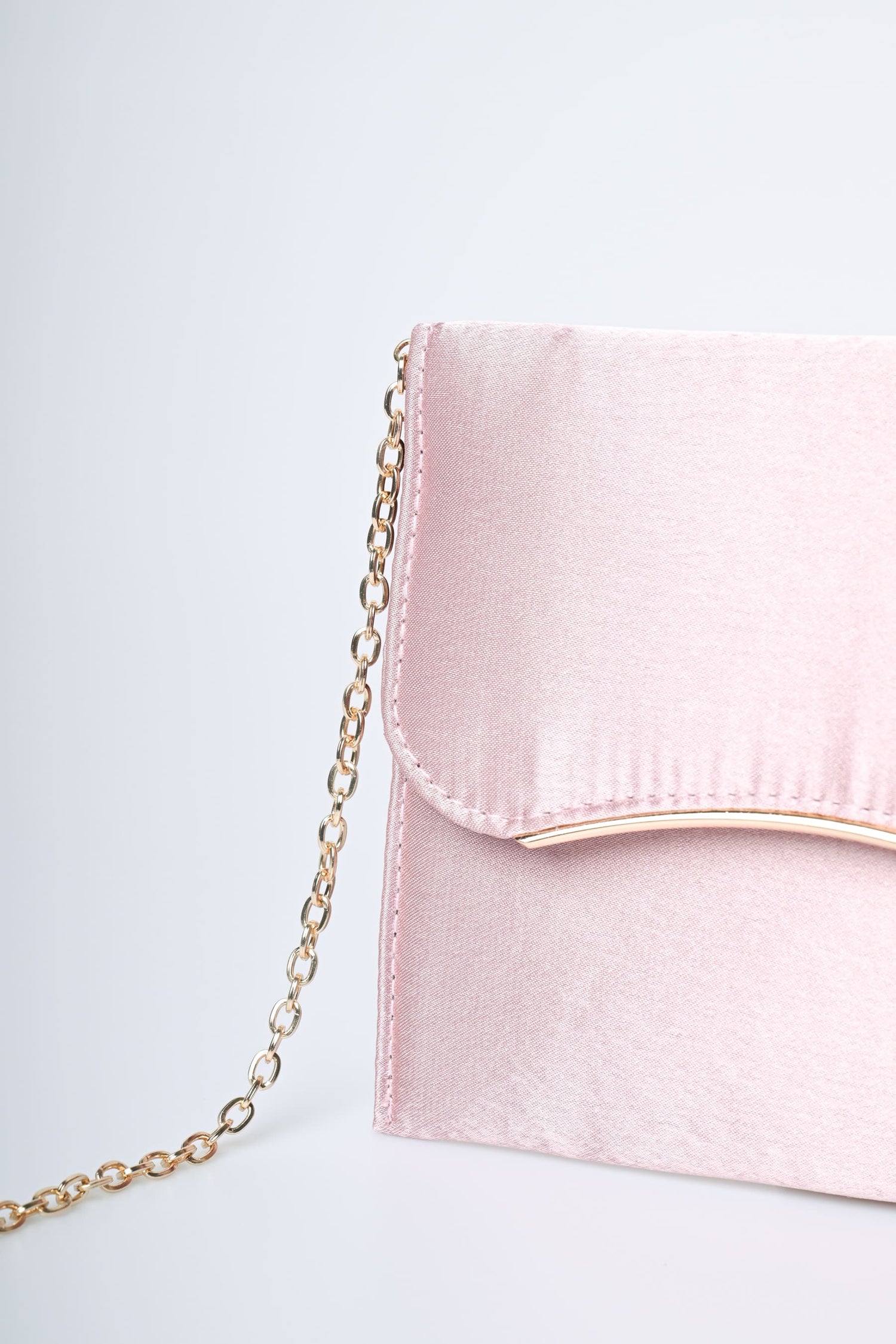 Pochette in raso rosa con tracolla rimovibile a catenella, risvolto ondulato con profilo rigido in metallo, chiusura magnetica nascosta e hardware in metallo dorato.