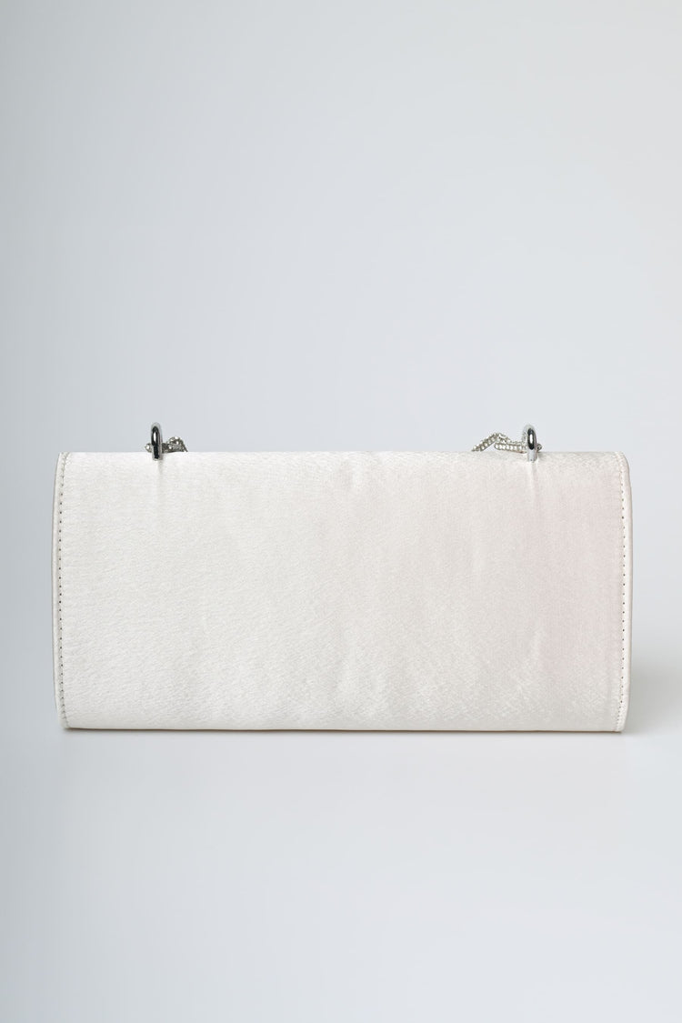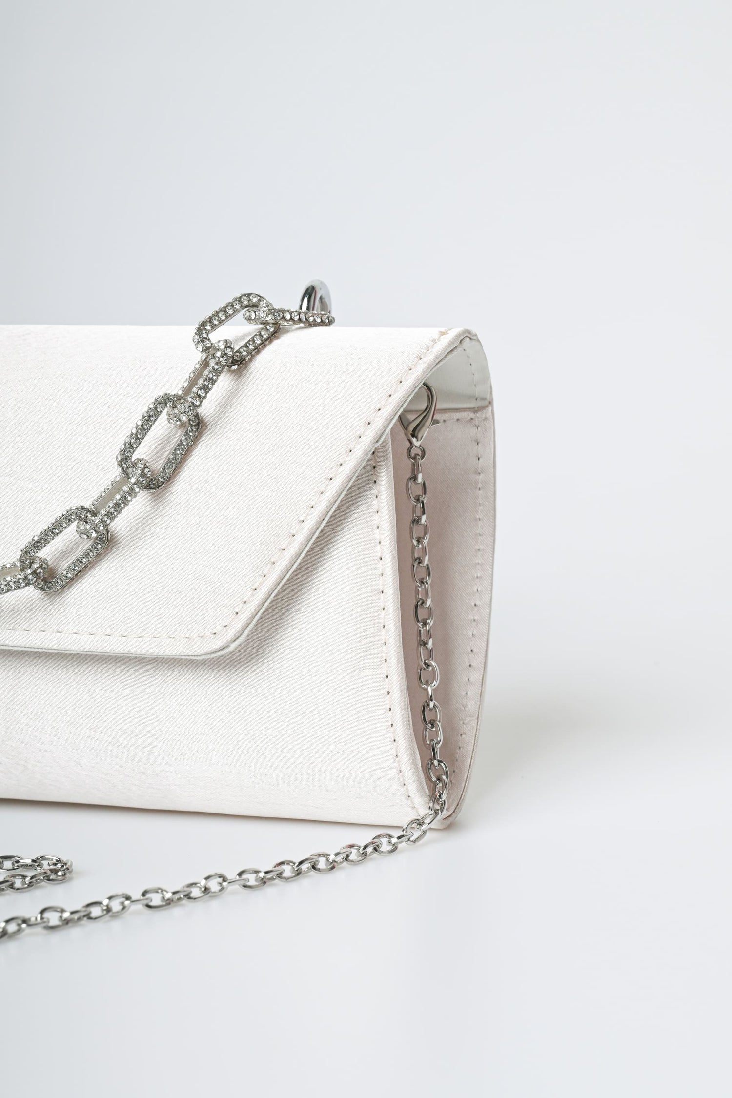 Pochette in raso bianco con manico gioiello a catena impreziosito da strass, chiusura magnetica nascosta, tracolla a catenella rimovibile e hardware in metallo argentato.