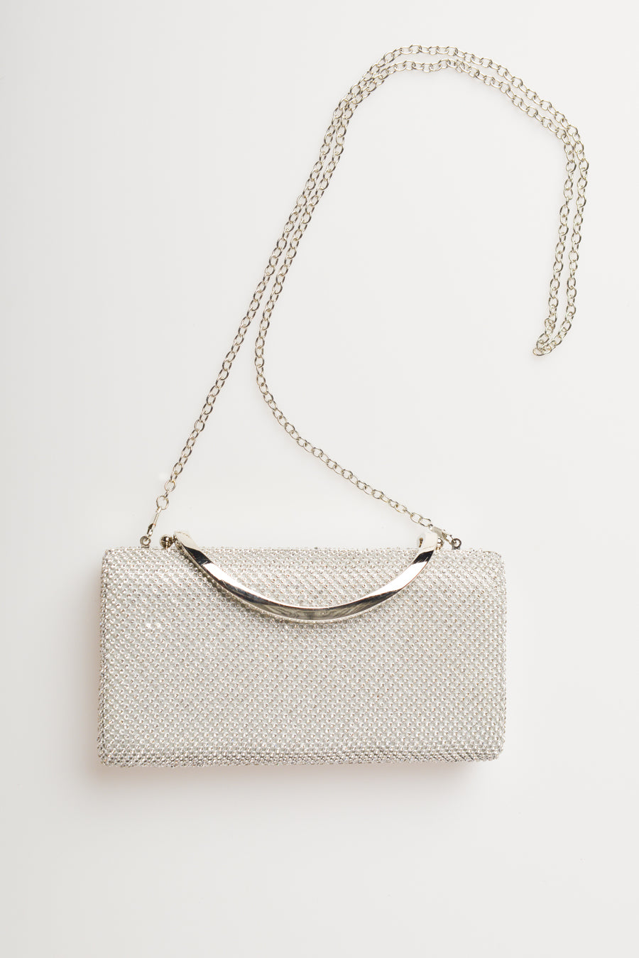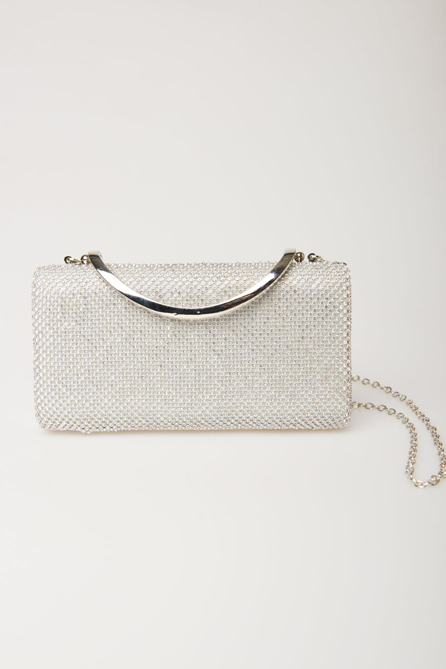 Pochette rigida e rettangolare bianca con decorazione strass all-over argento, chiusura a scatto, manico superiore in metallo argentato e tracolla sottile a catenella.