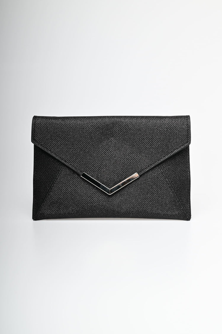 Pochette piatta a busta in similpelle nera con risvolto a V sottolineato da tab in metallo argentato e chiusura nascosta.