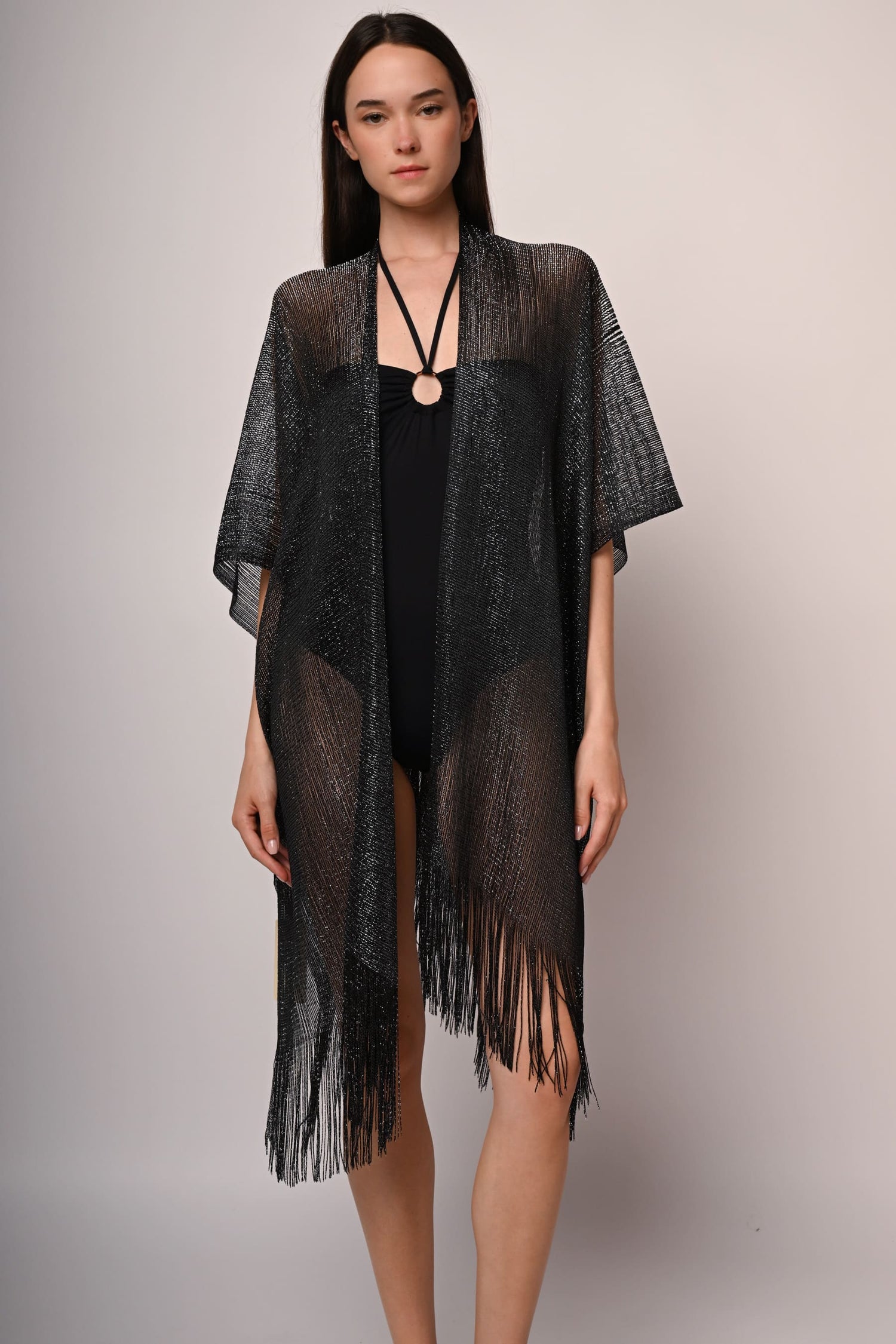 Copricostume a poncho aperto in mesh lurex nera con frange decorative allorlo.