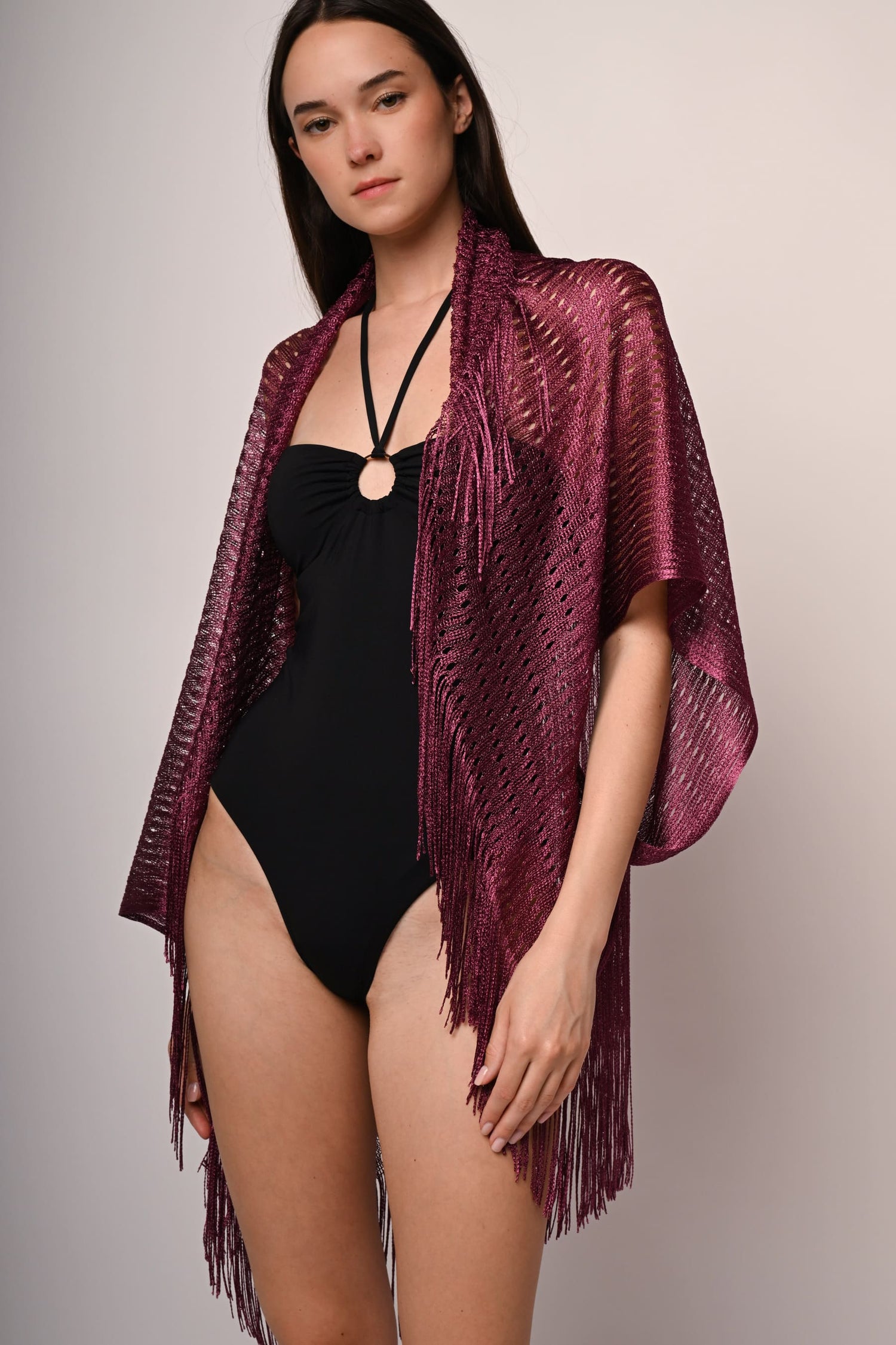 Poncho copricostume in maglia traforata fucsia scuro con frange lungo i bordi.