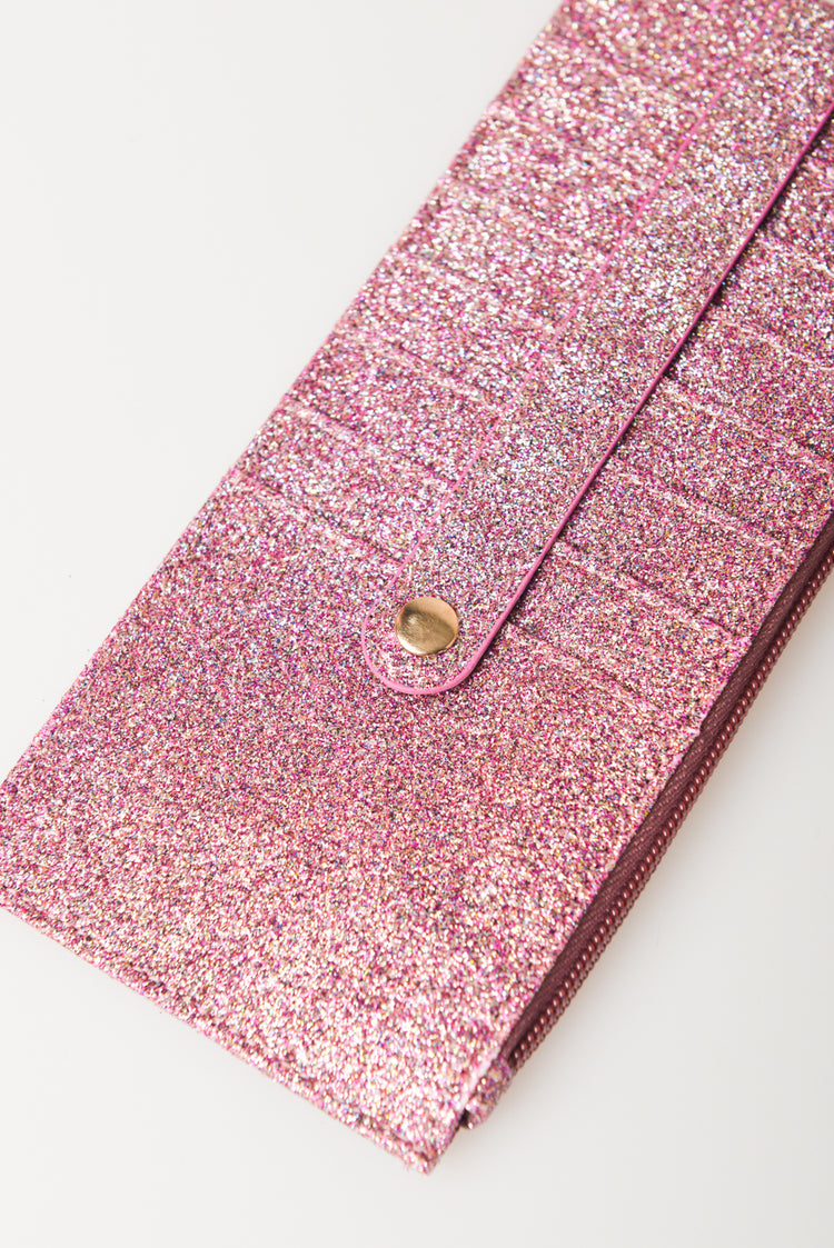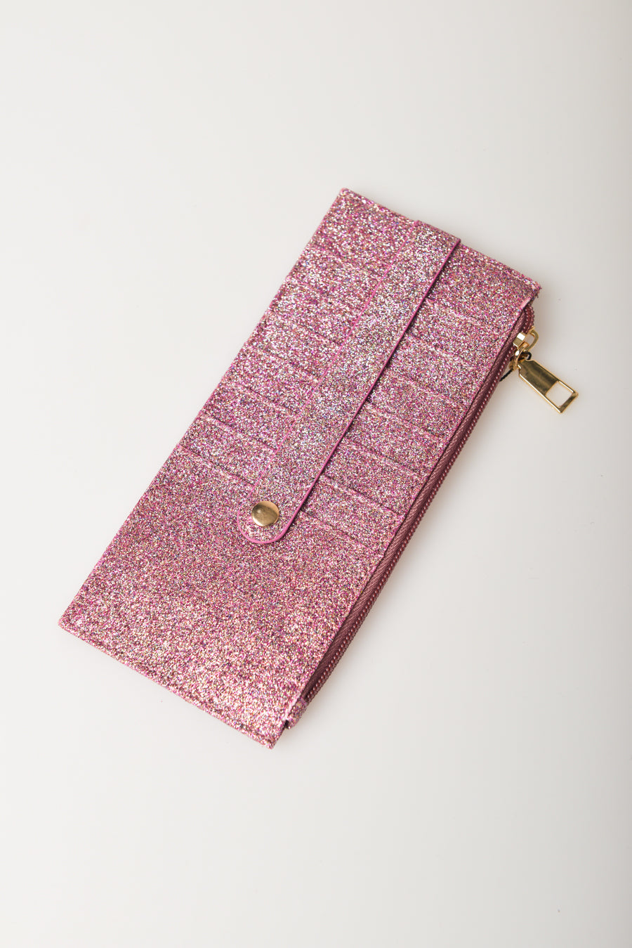 Portacarte in similpelle glitterata rosa con numerose fessure per carte, cinturino chiuso da bottone e tasca chiusa da zip dorata.