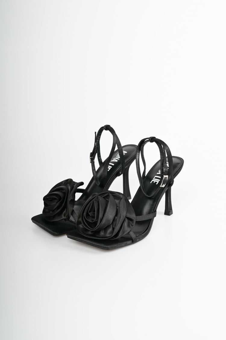 Sandali in raso nero con cinturini sottili, rosa decorativa in tessuto sul davanti, punta quadrata, fibbia regolabile alla caviglia, fodera, soletta e suola in similpelle e tacco alto.