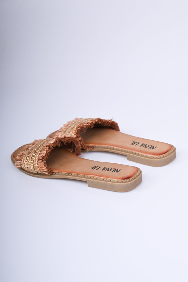 Sandali flat con fascia nei toni del marrone rosato impreziosita da ricami dorati e frange, punta a mandorla e suola in gomma con tacco basso.