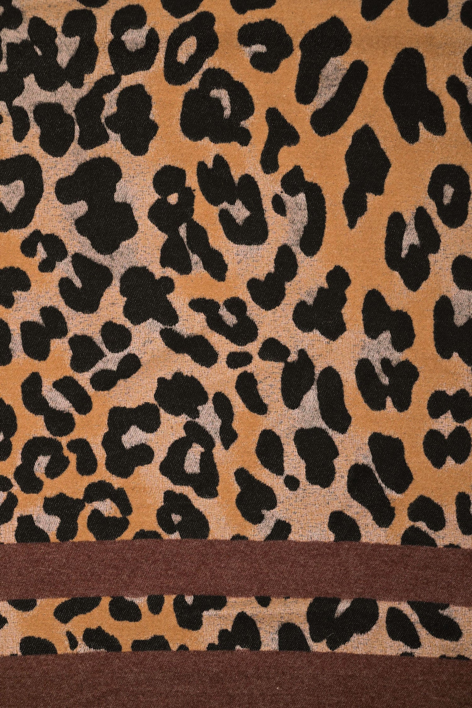 Sciarpa a motivo leopardato nei toni del beige e nero con bande a contrasto marroni e finiture sfrangiate.