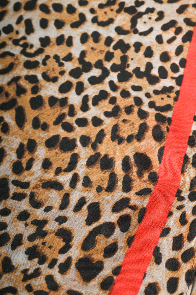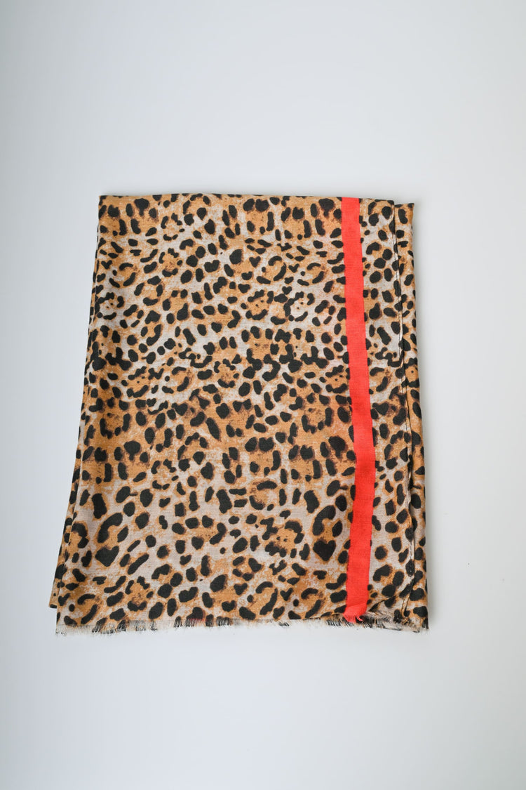 Sciarpa a stampa leopardata nei toni del nero, beige e marrone con striscia rossa e finiture sfrangiate.