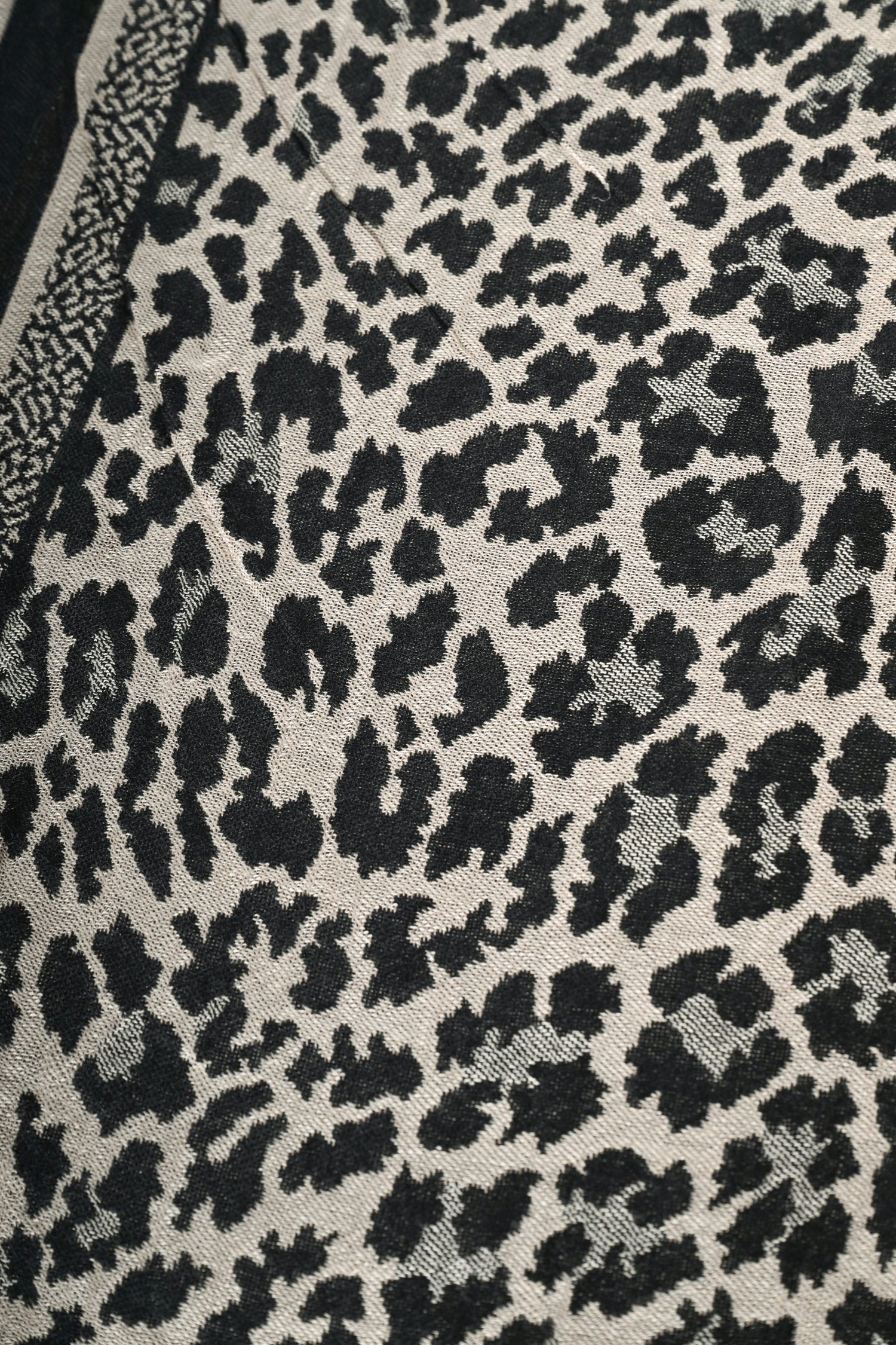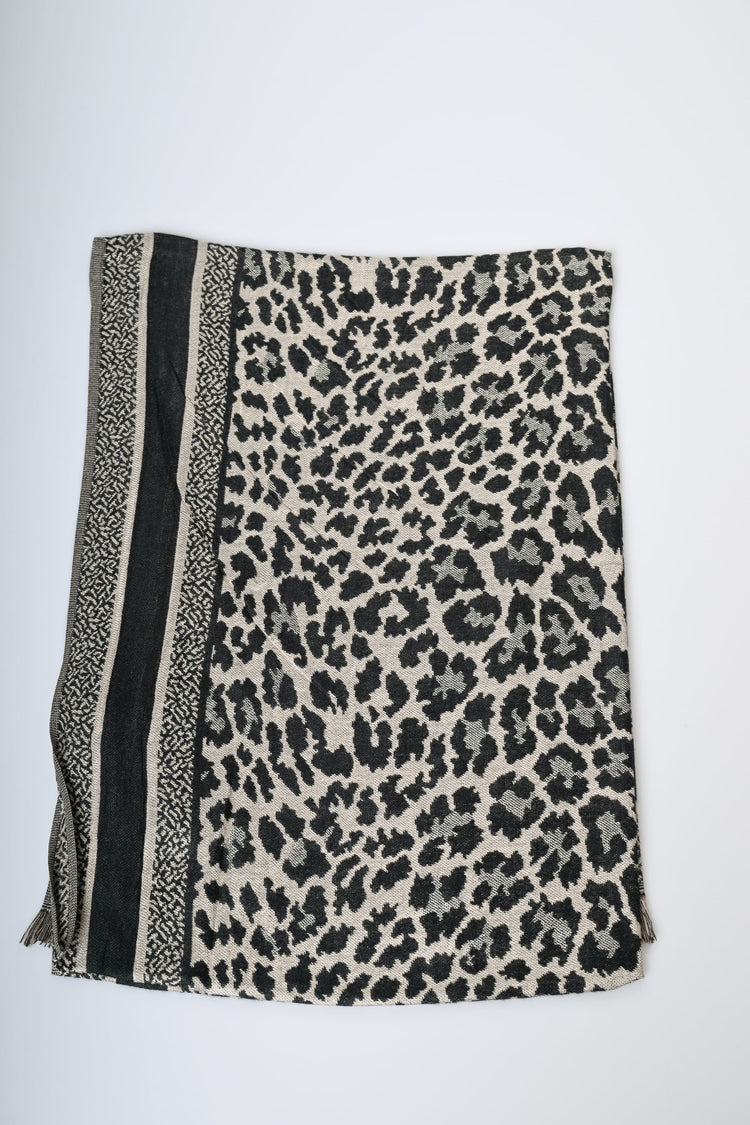 Sciarpa in jacquard di viscosa con motivo leopardato nei toni del beige e nero, bordi a righe e orli a frange.