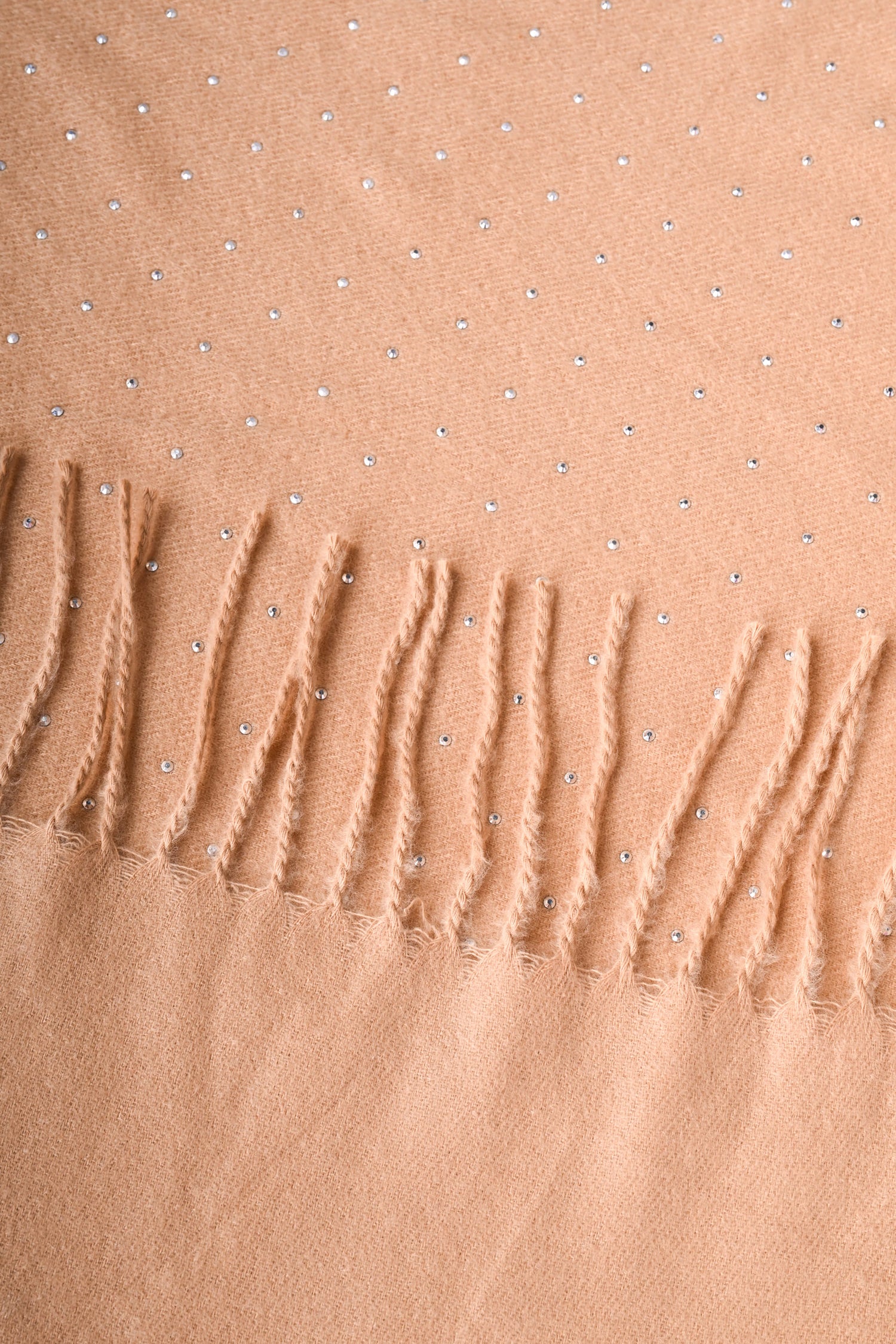 Sciarpa in tessuto nuance blush scuro con mini borchie decorative e finiture a frange.