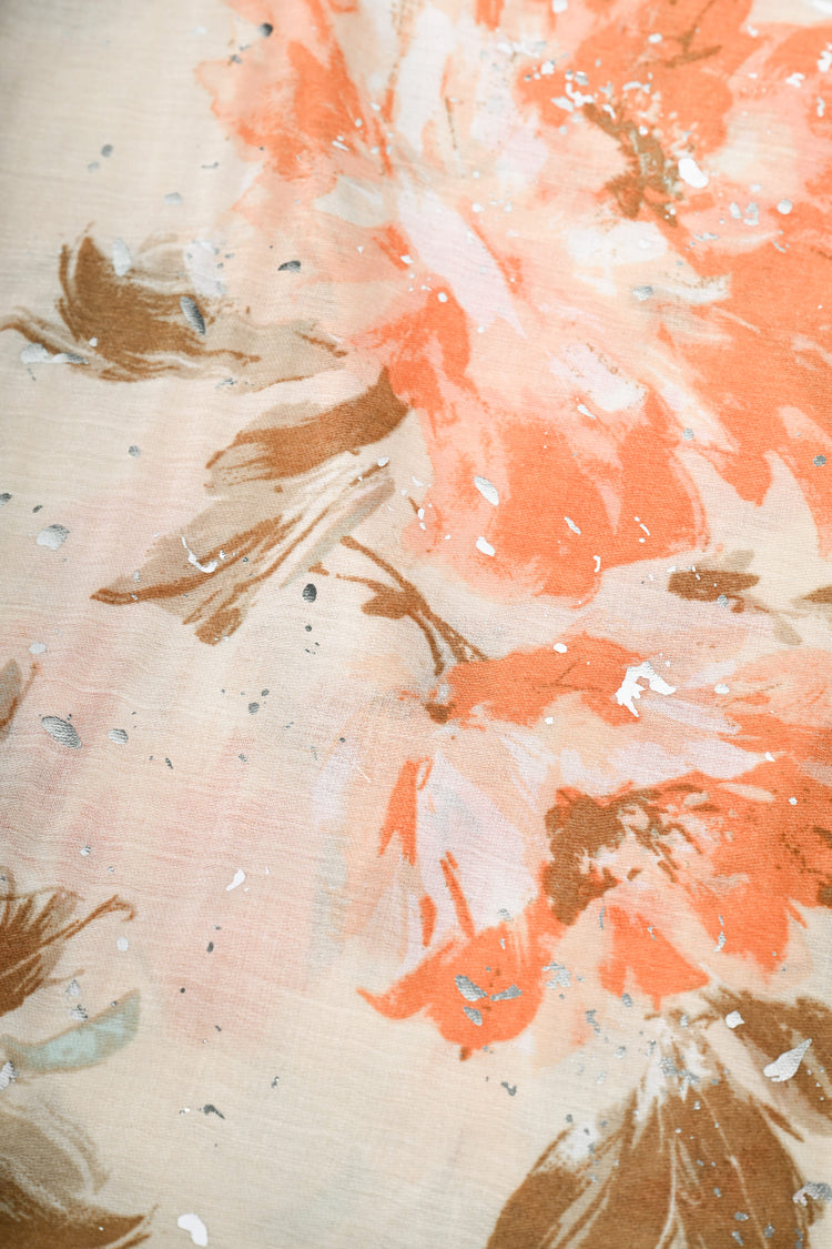 Sciarpa a stampa floreale nei toni dellarancio su fondo beige con finiture a frange.