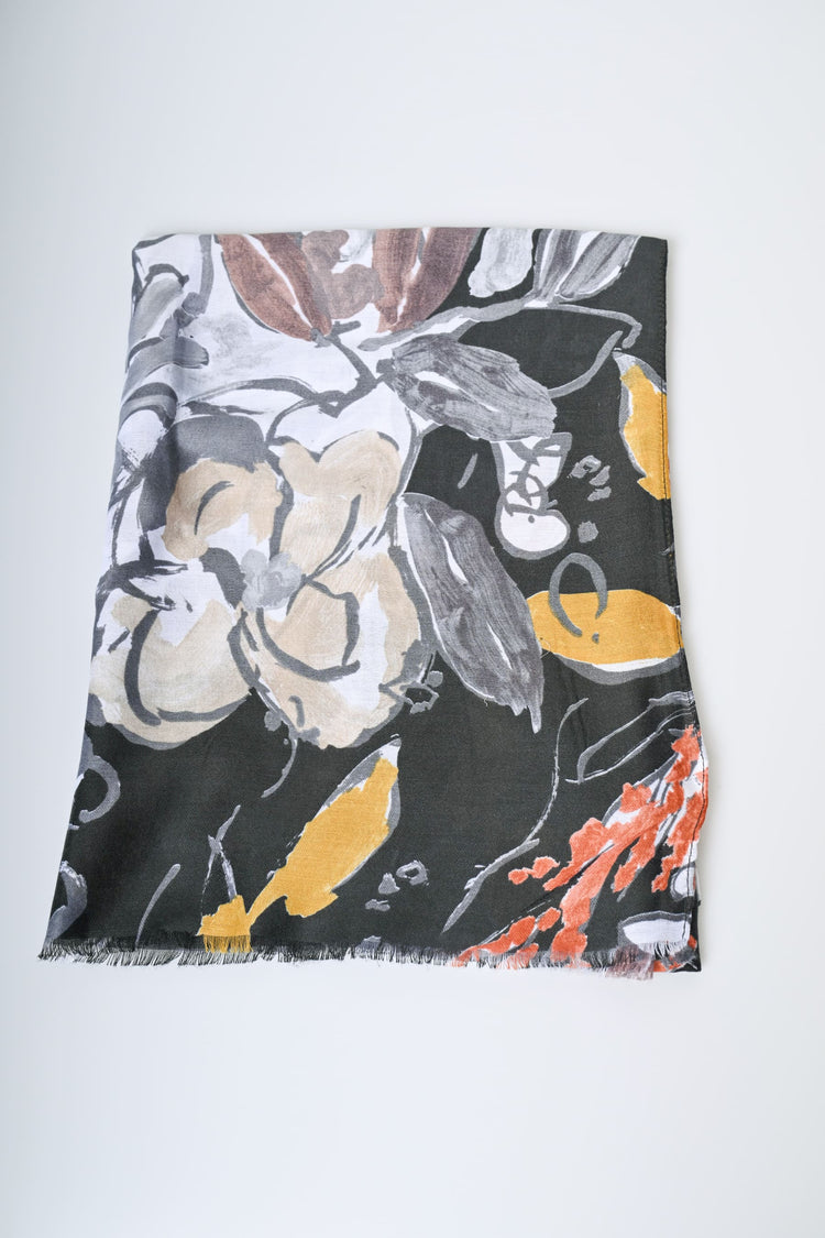 Sciarpa a stampa floreale artistica multicolor su fondo nero con finiture sfrangiate.