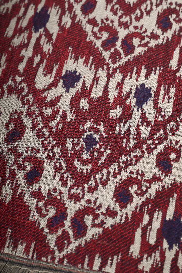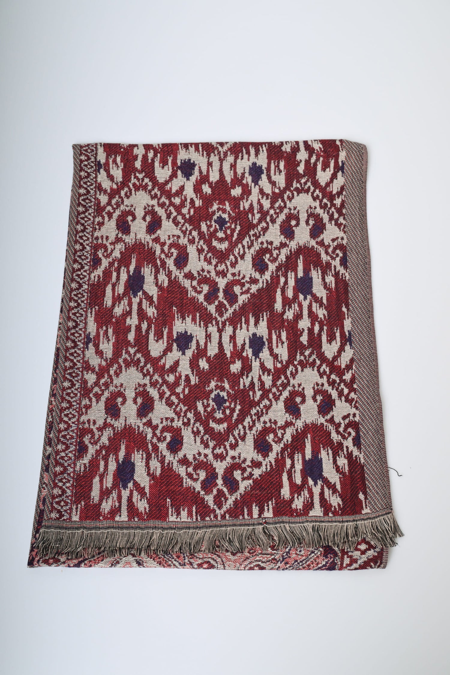 Sciarpa in jacquard di viscosa con motivo etnico multicolor su fondo bordeaux e orli a frange.