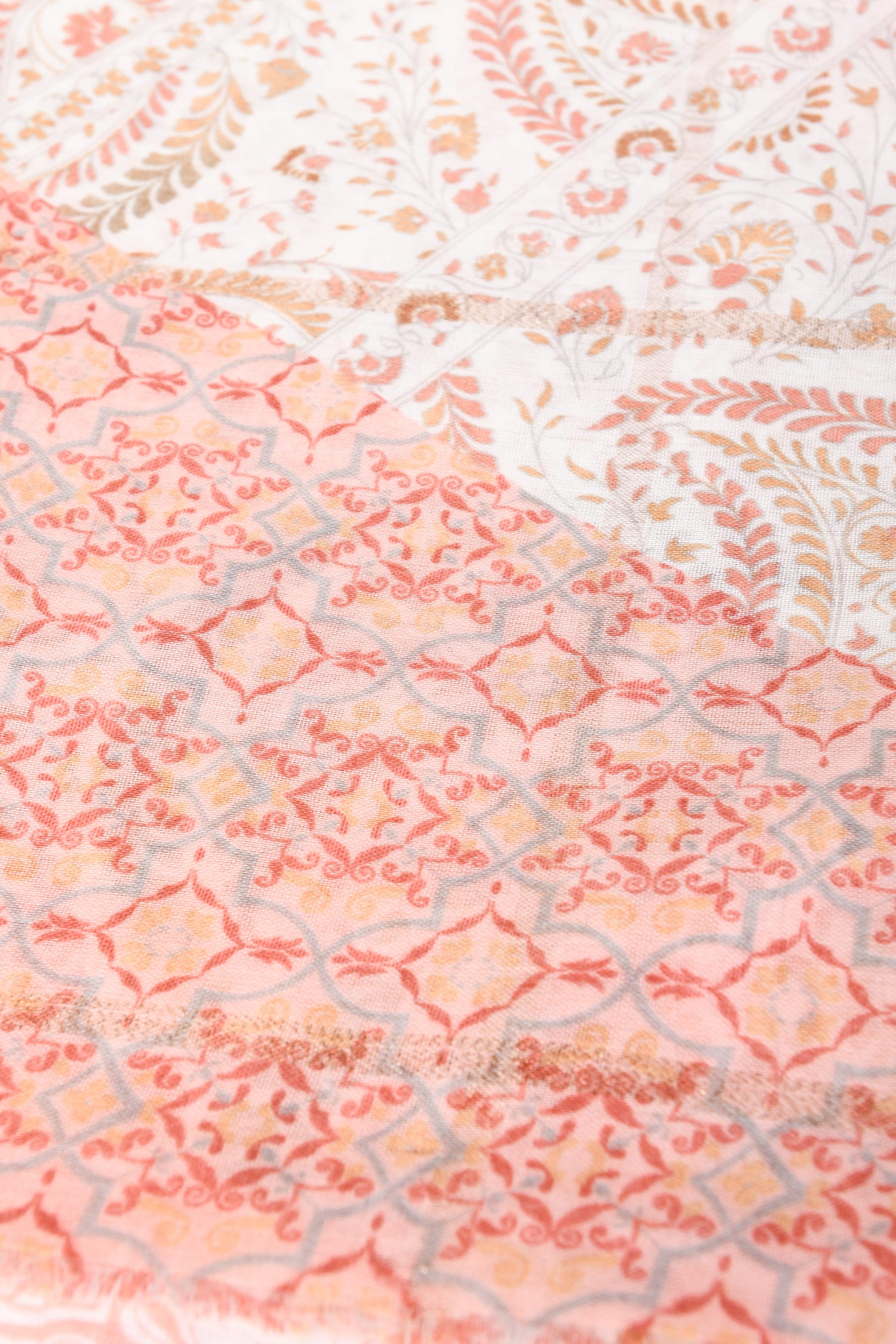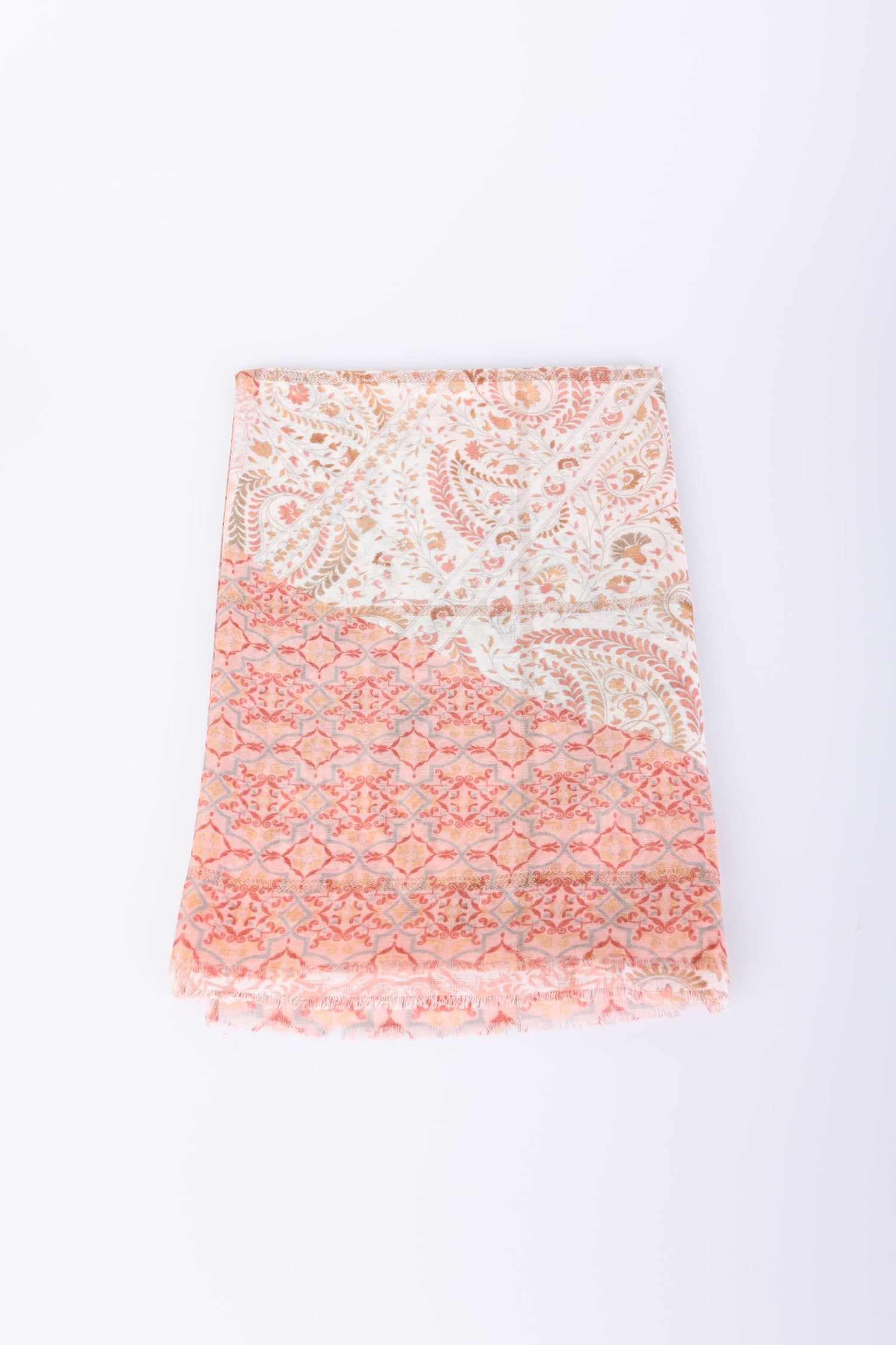 Sciarpa a stampa patchwork con motivi etnici e paisley nei toni del rosa, beige e bianco e finiture sfrangiate.