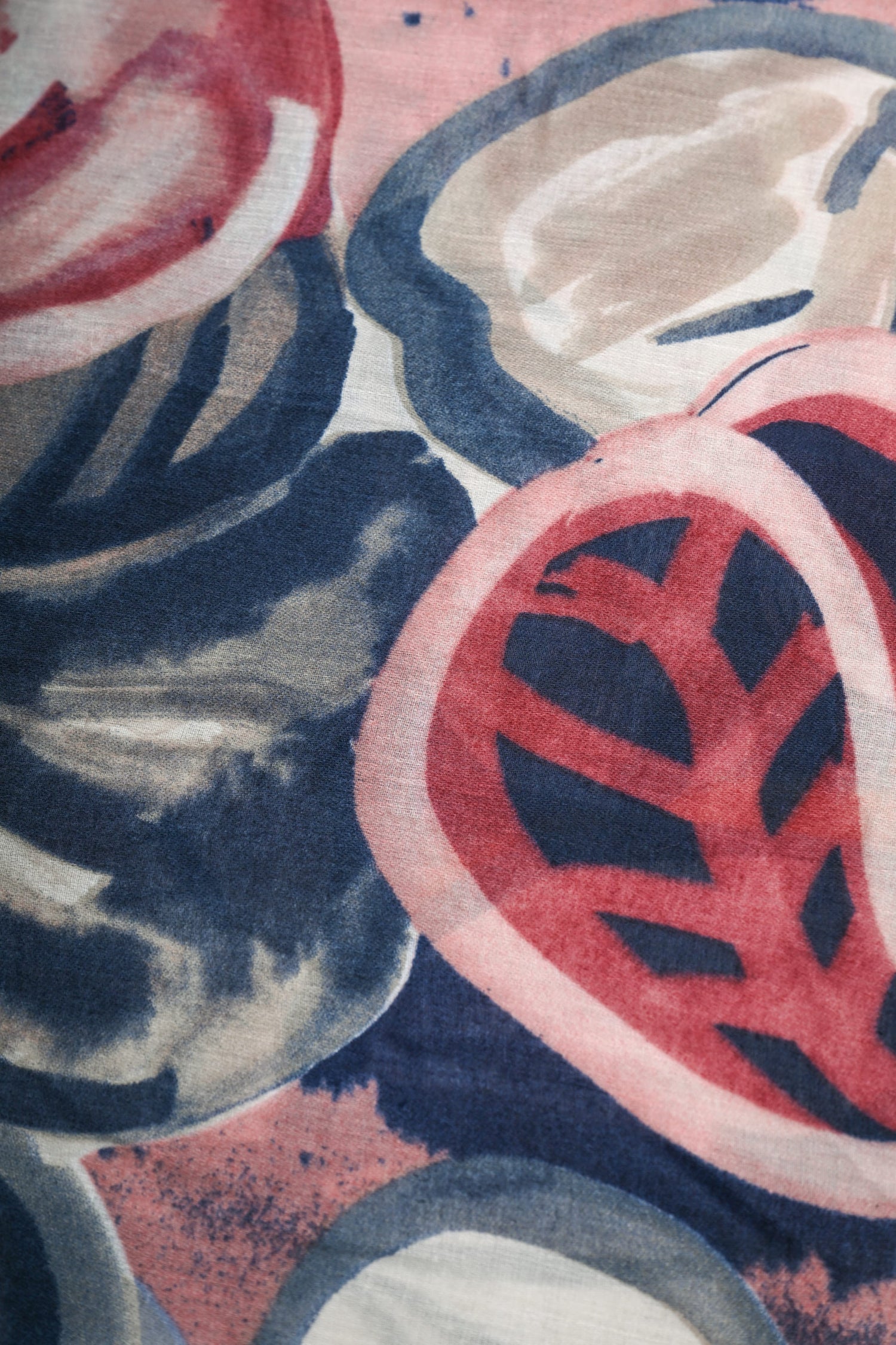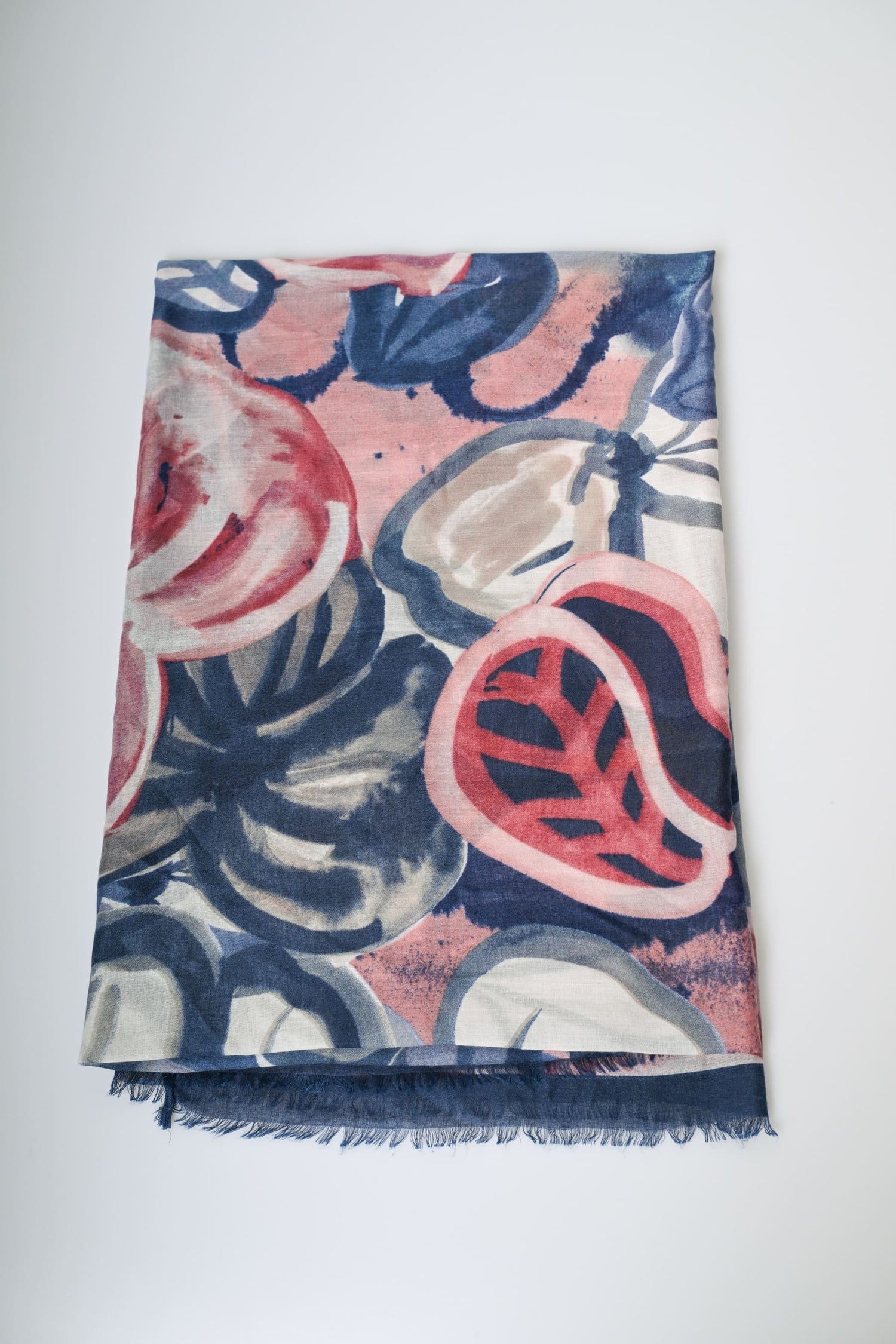 Sciarpa a stampa floreale artistica multicolor con finiture sfrangiate.