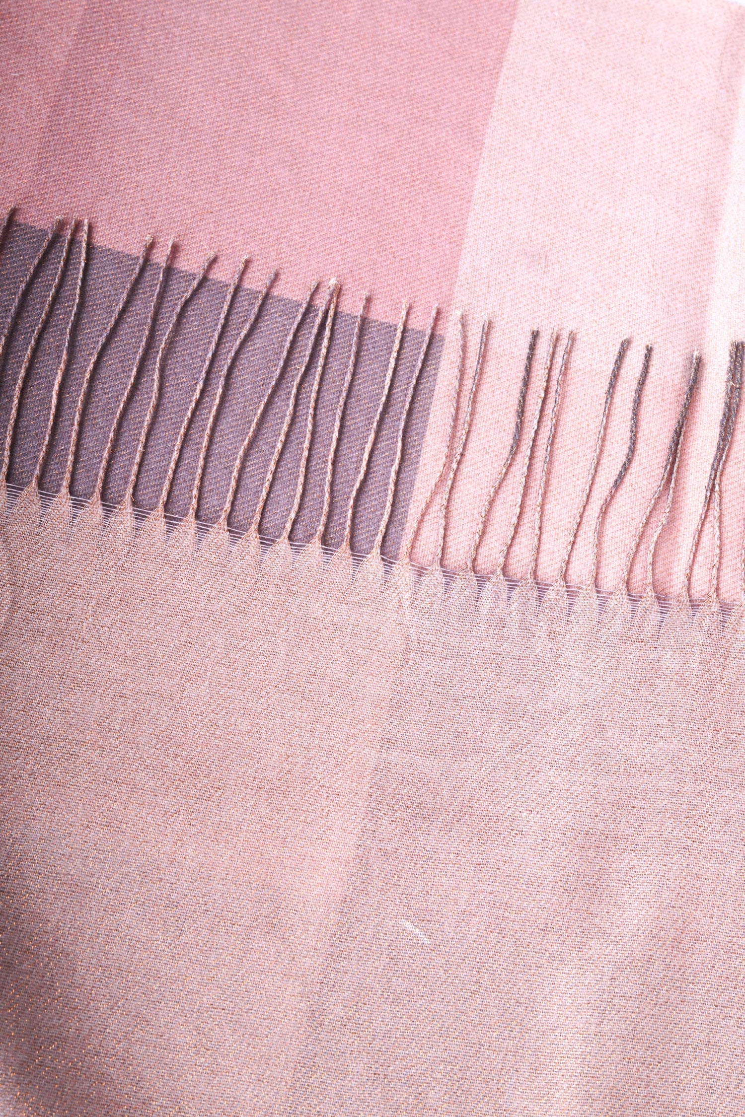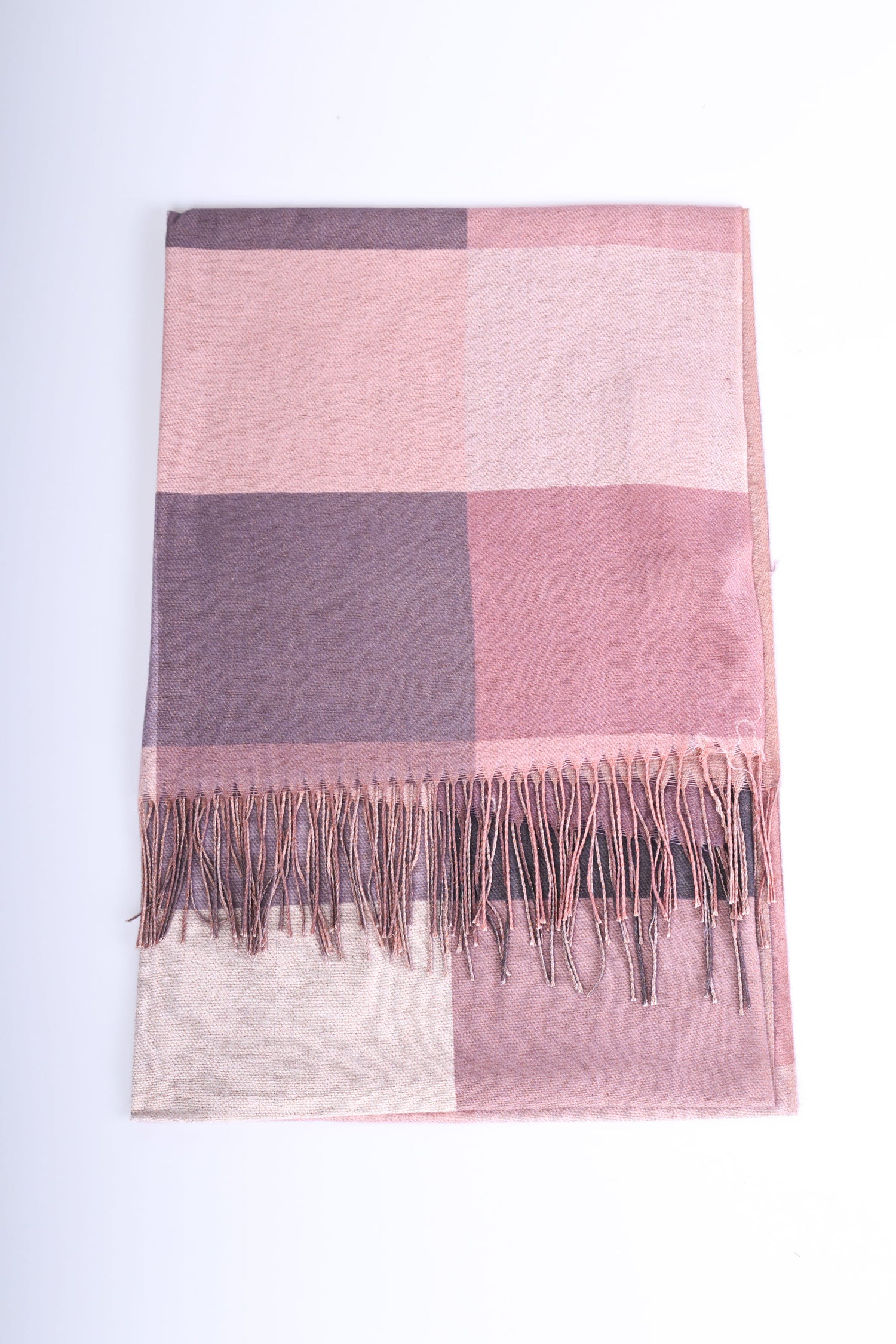Sciarpa in maglia lurex con motivo a quadri nei toni del rosa e viola e finiture a frange.