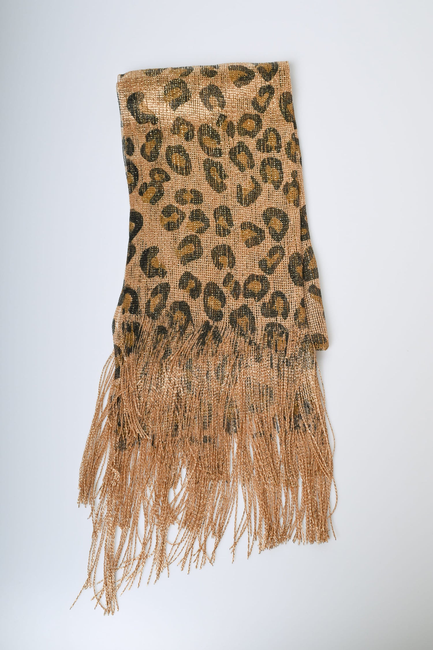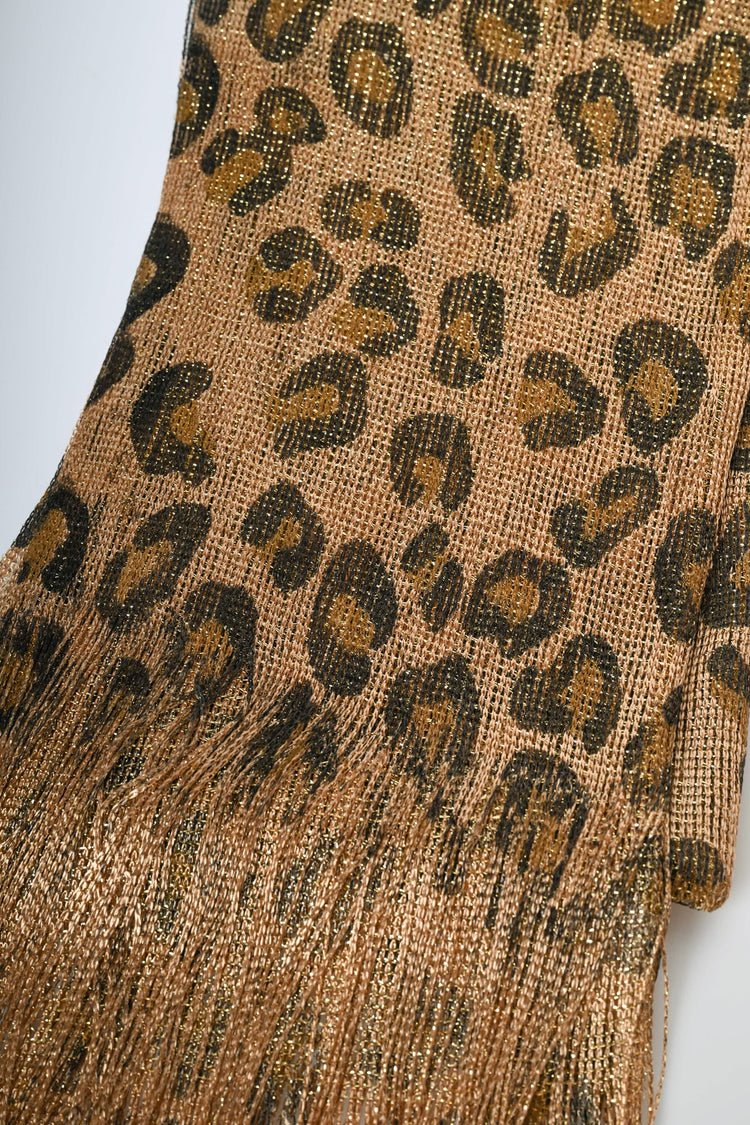 Sciarpa in tessuto lamé con motivo leopardato nei toni del beige, oro e nero e lunghe frange.
