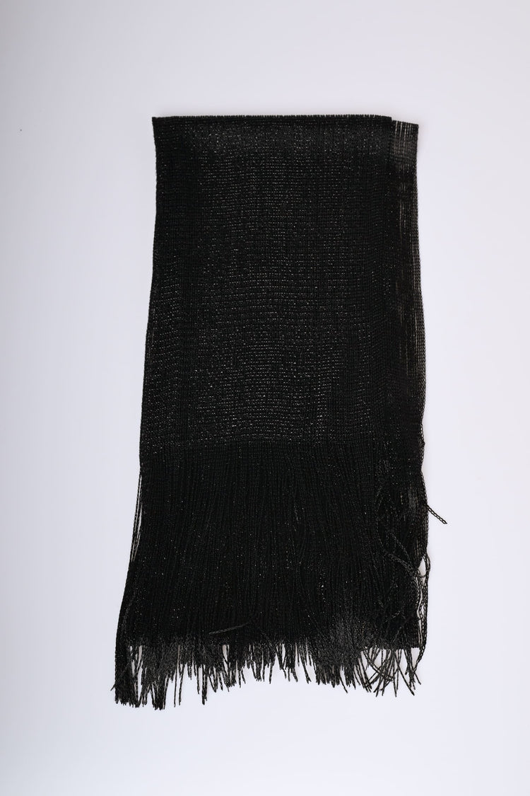 Sciarpa in maglia lamé nera con motivo traforato e frange allorlo.