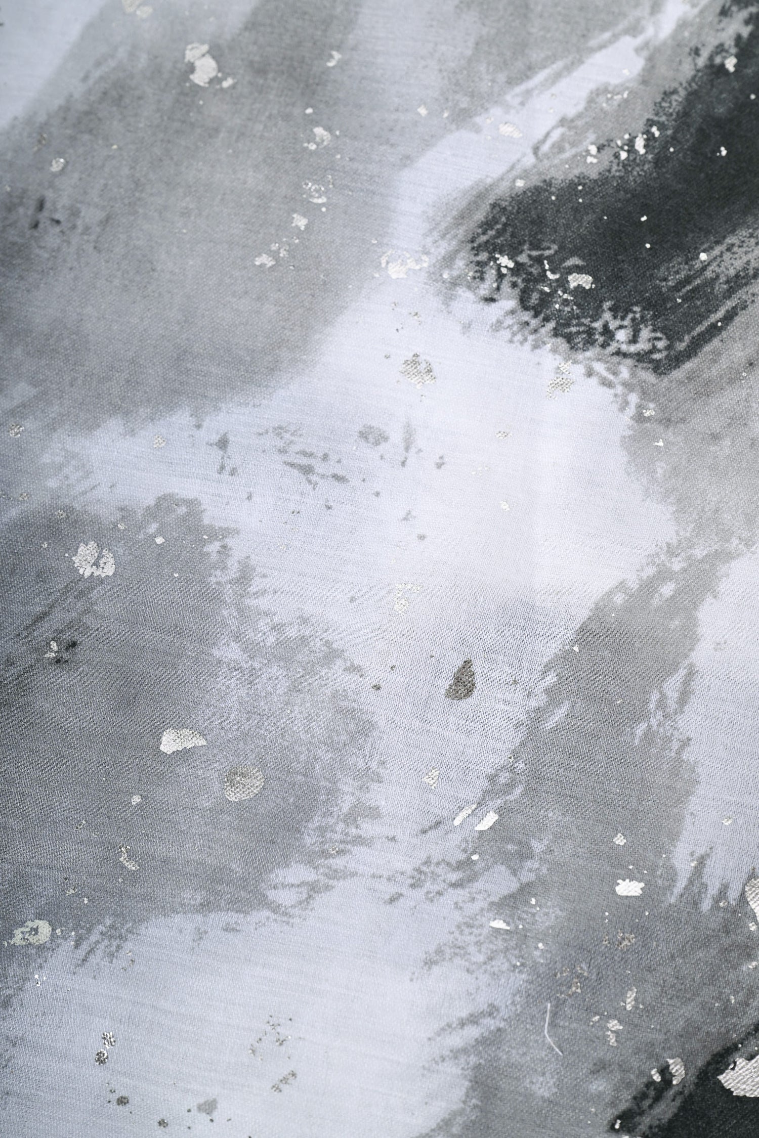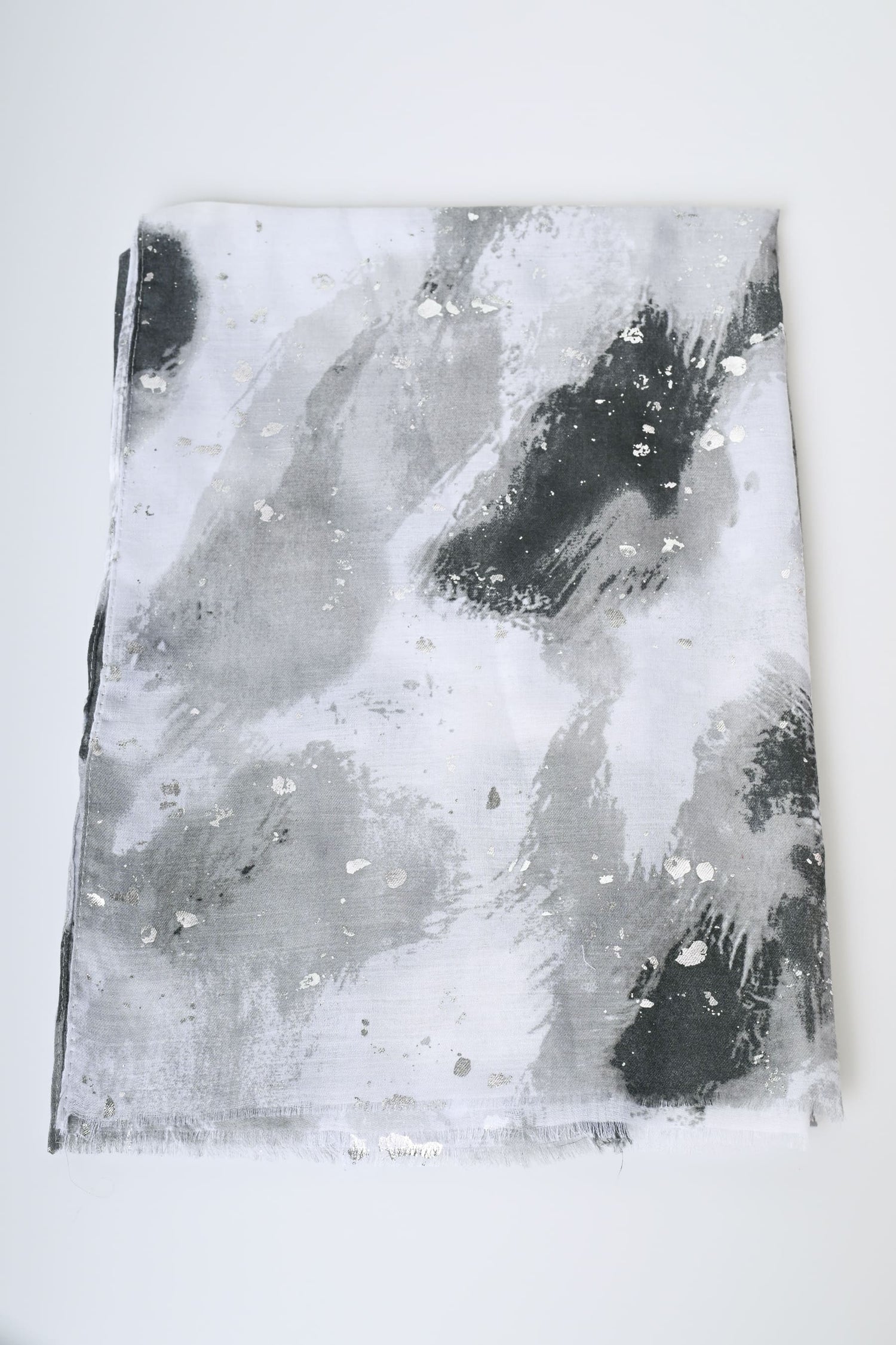 Sciarpa a stampa astratta nei toni del grigio, nero e bianco con finiture a frange.