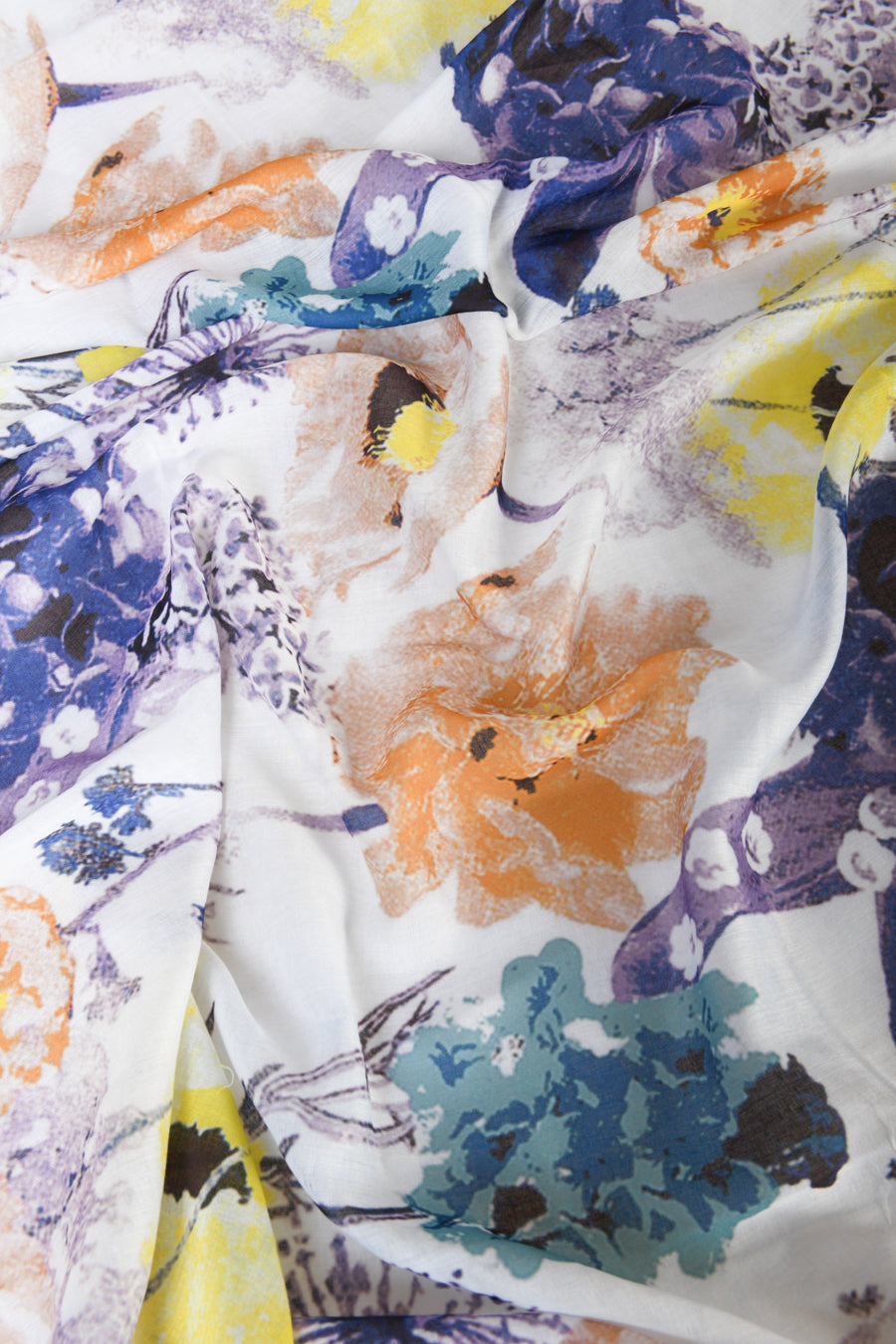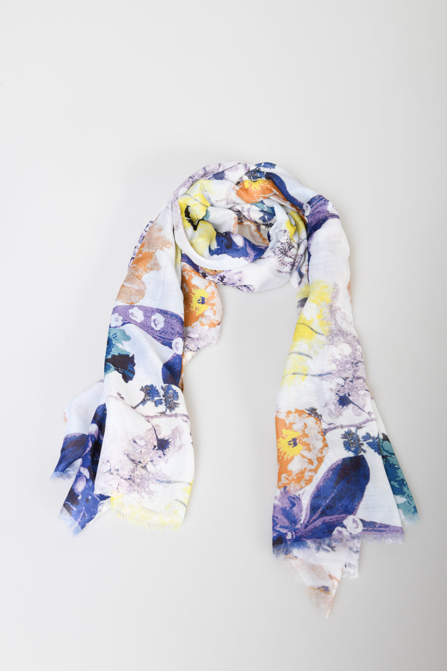 Sciarpa a stampa floreale multicolor su fondo bianco con finiture sfrangiate.