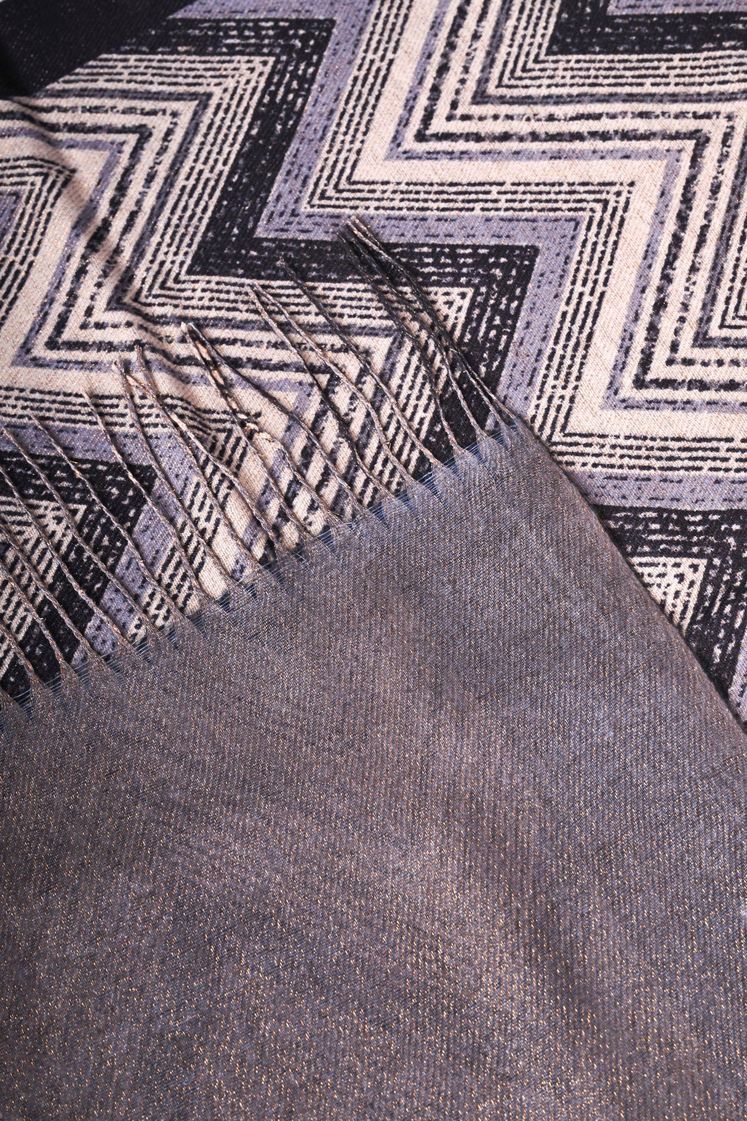 Sciarpa in maglia lurex con motivo chevron nei toni del viola, beige e nero e finiture a frange.