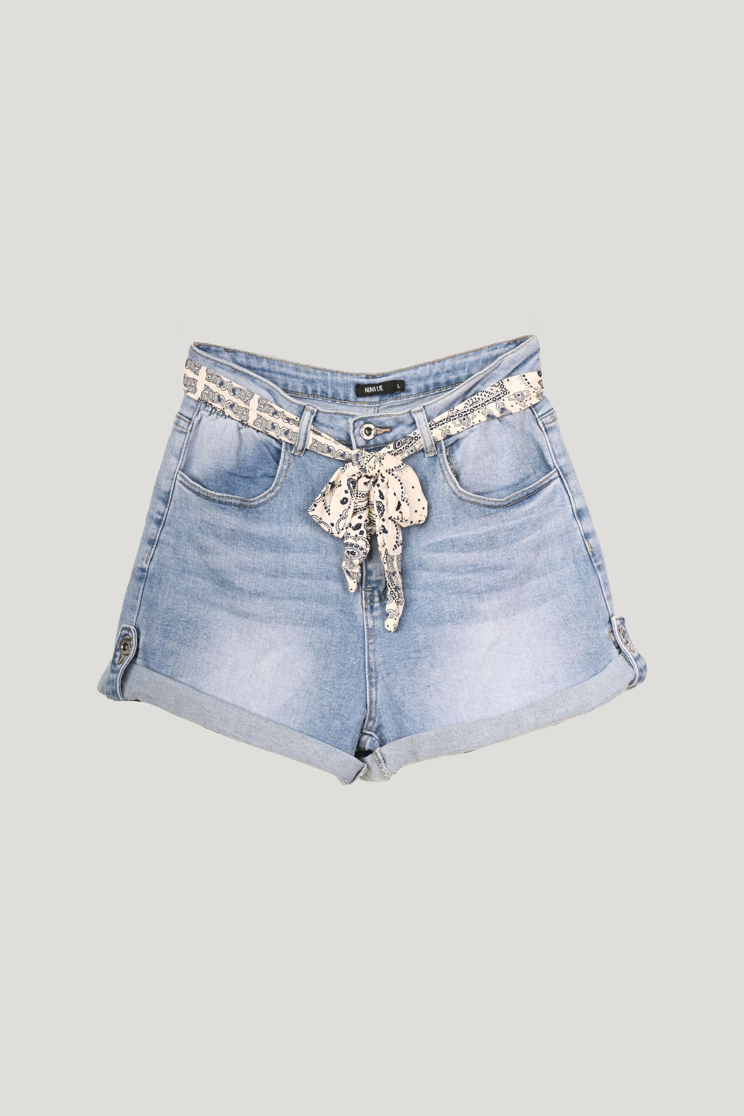 Shorts in denim stretch azzurro con passanti per cintura, foulard-cintura a nastro con stampa etnica multicolor, chiusura con bottone e zip, inserti elasticizzati laterali, taglio quattro tasche e risvolto allorlo con cinturini laterali.