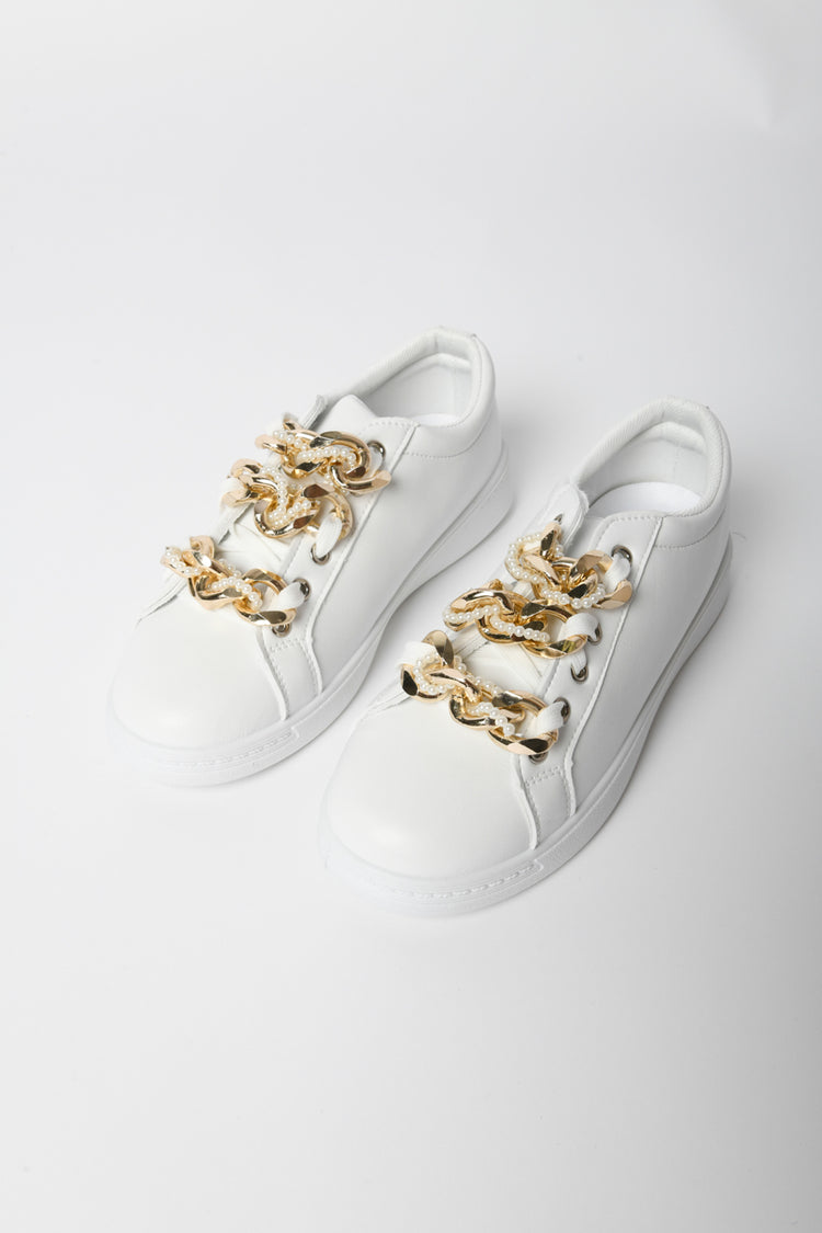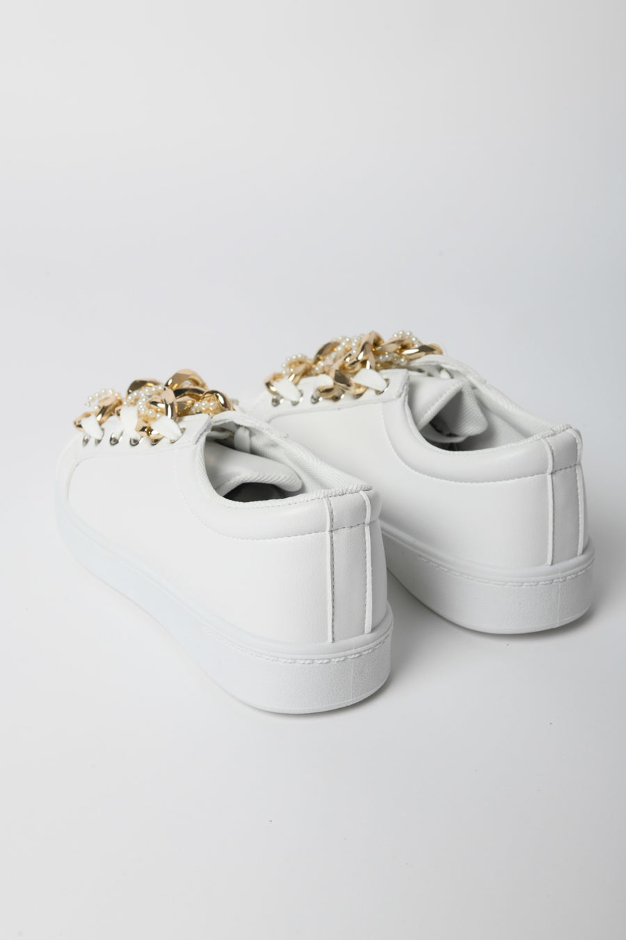 Sneakers in similpelle bianca con punta tonda, lacci impreziositi da decorazione a catena in metallo dorato e perle e suola in gomma.