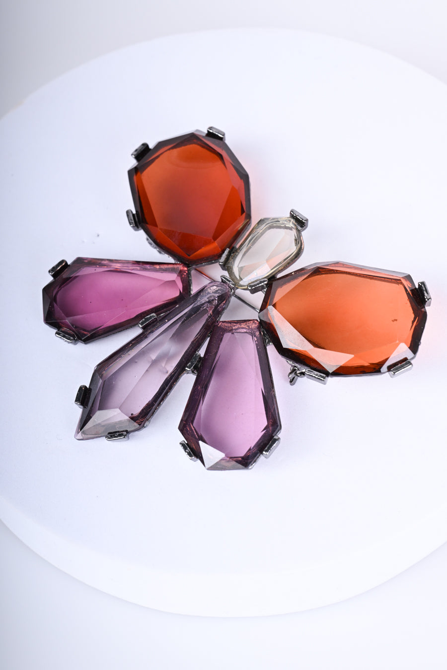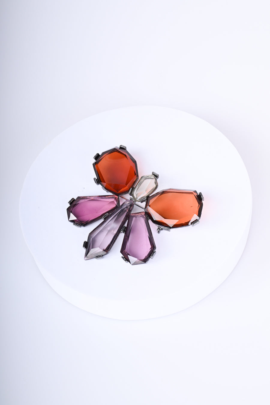 Spilla oversize a libellula in pietre nei toni del rosso, lilla e viola e con montatura in metallo argentato.