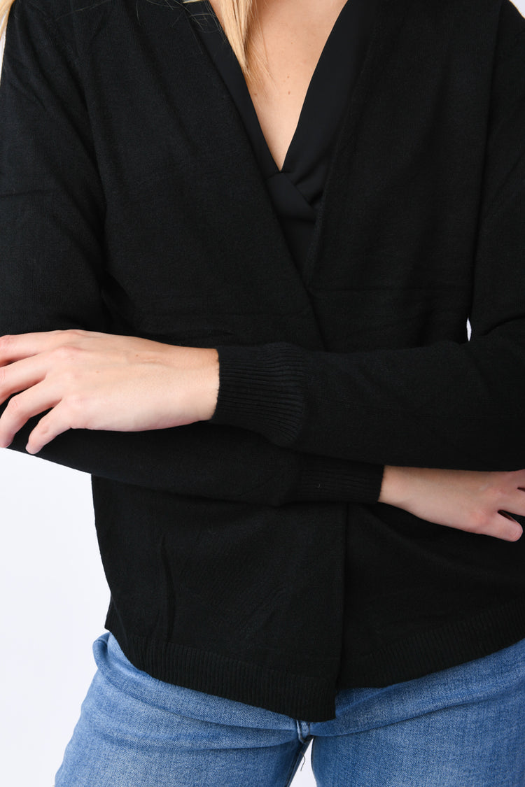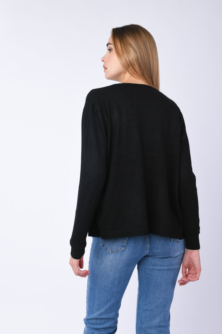 Cardigan in maglia misto viscosa nera con finiture a costine e nessuna chiusura.