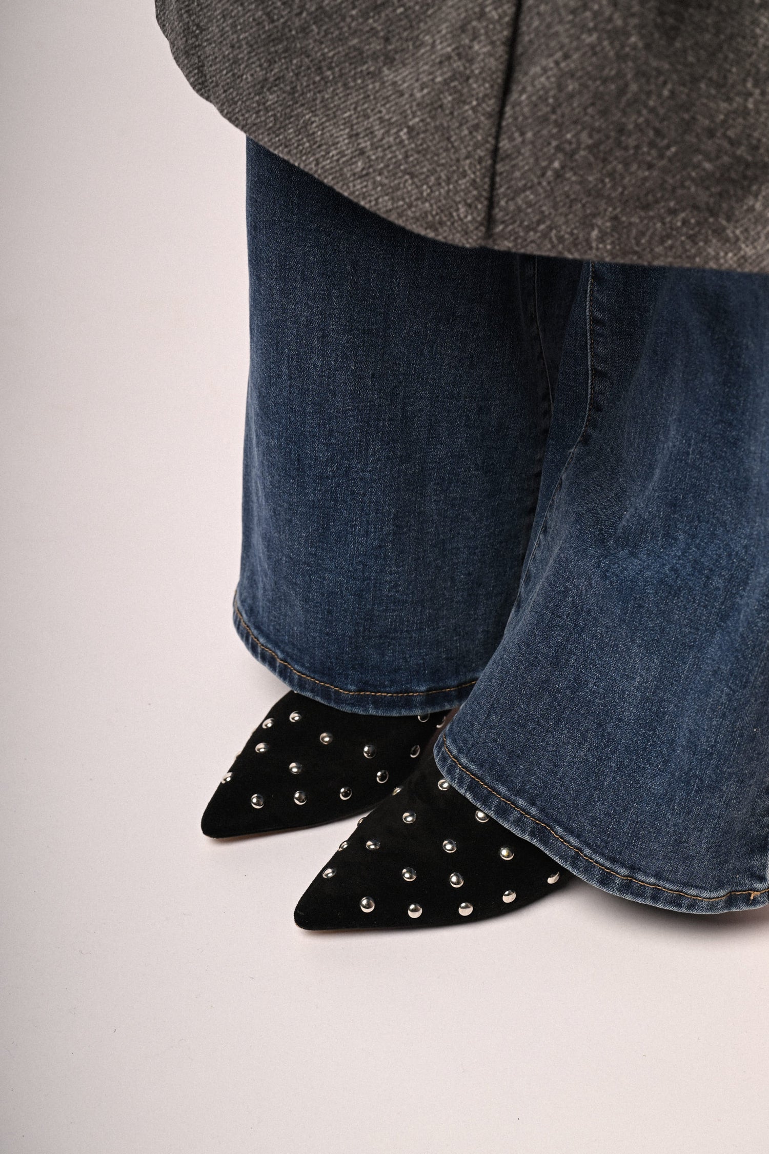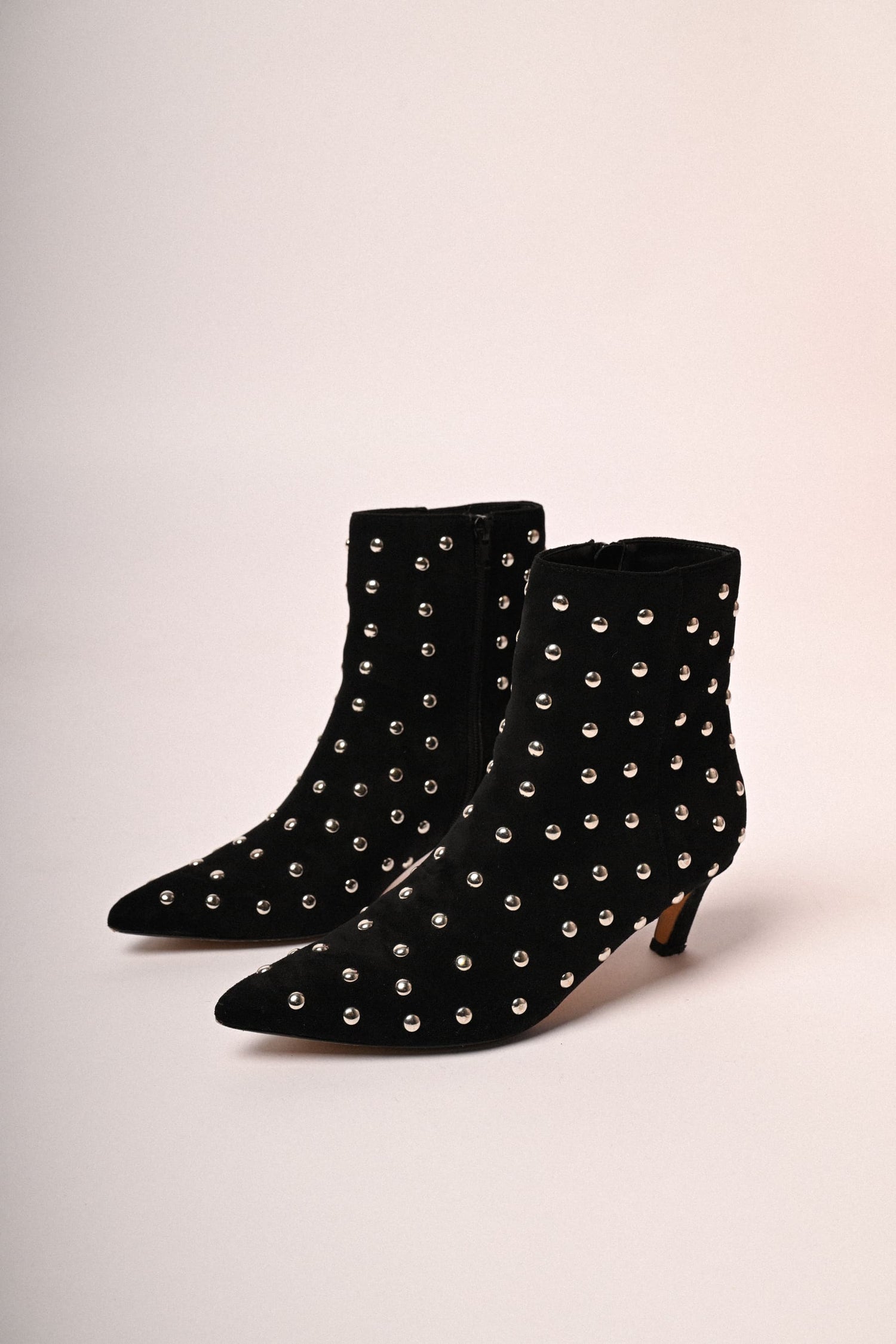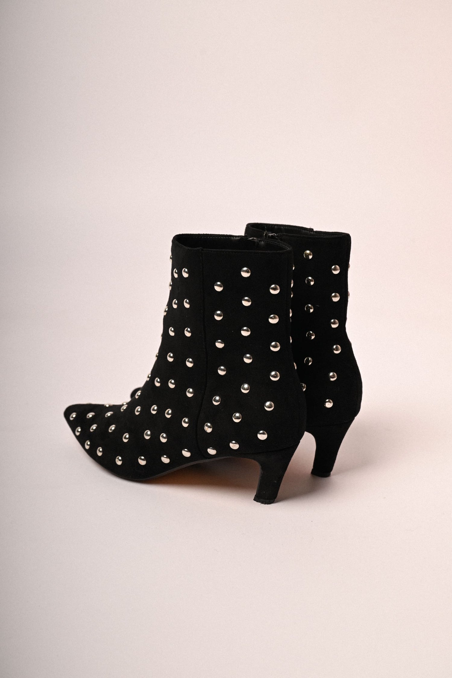Stivaletti in similpelle scamosciata nera con punta affusolata, decorazione con borchie argentate all-over, chiusura laterale con zip e tacco alto.
