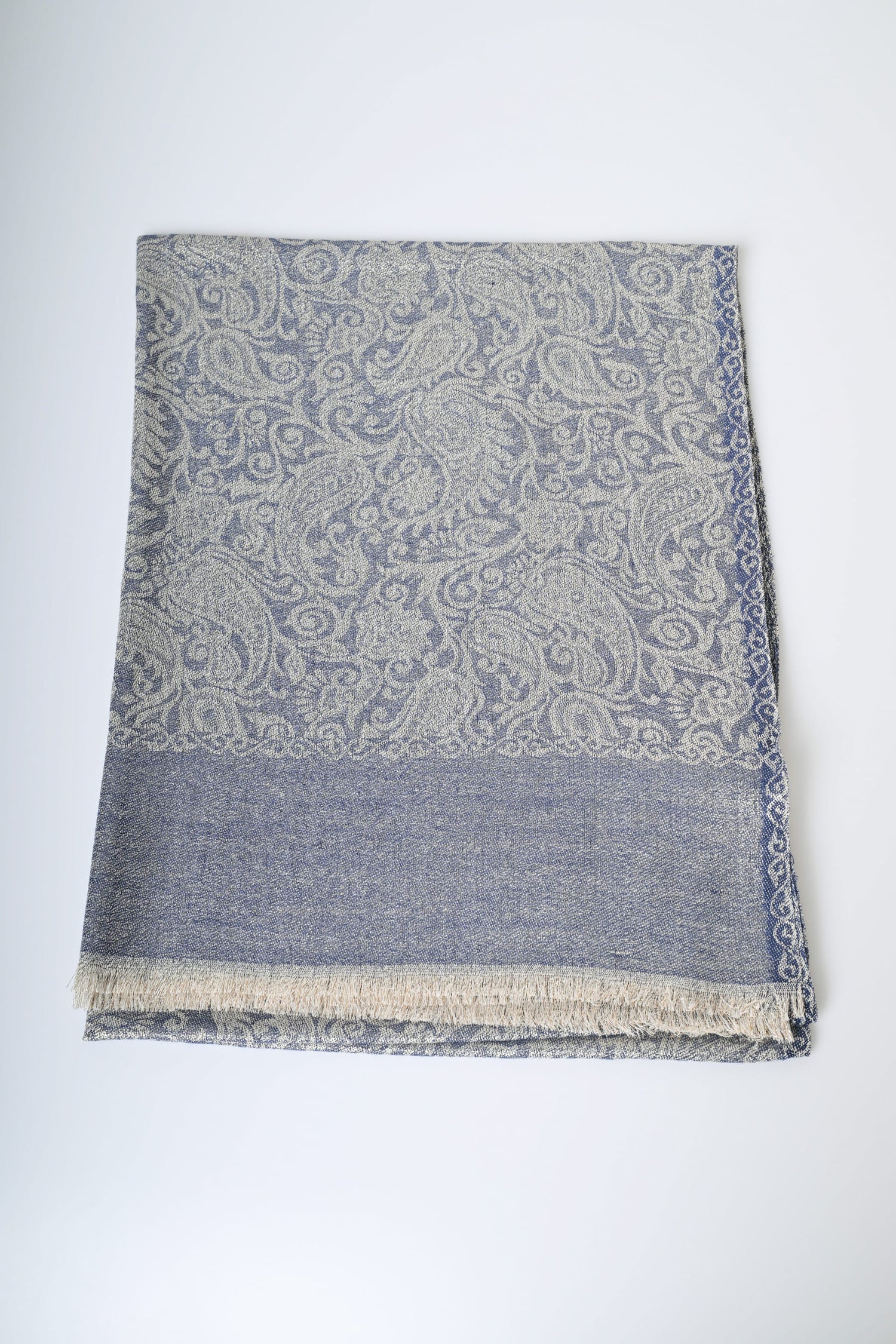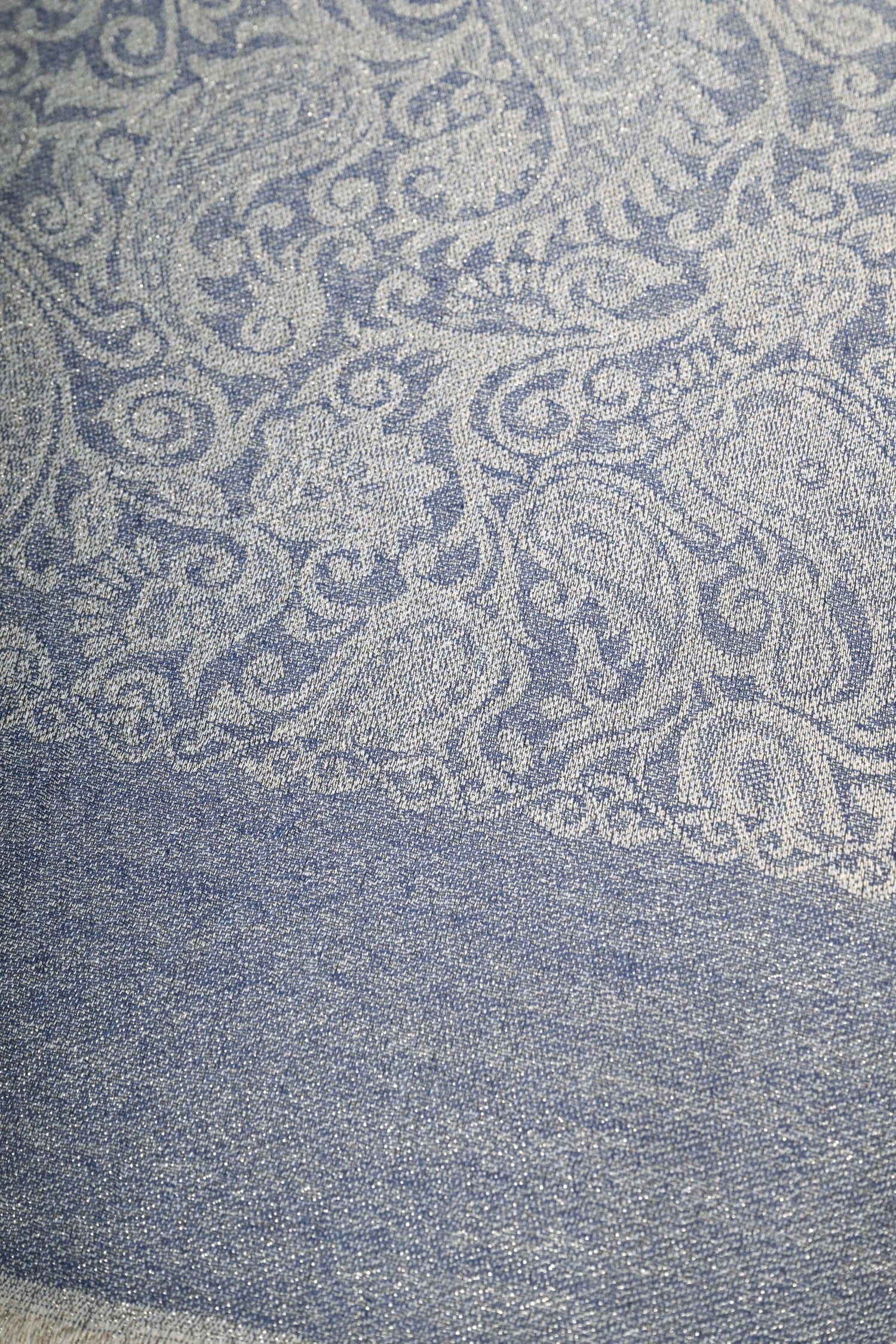Stola in tessuto jacquard lurex blu con motivo etnico e bordi a frange.
