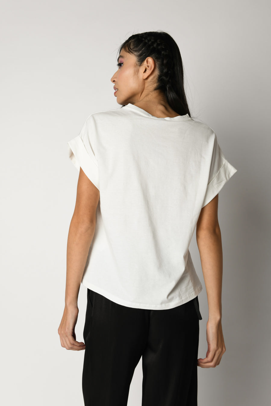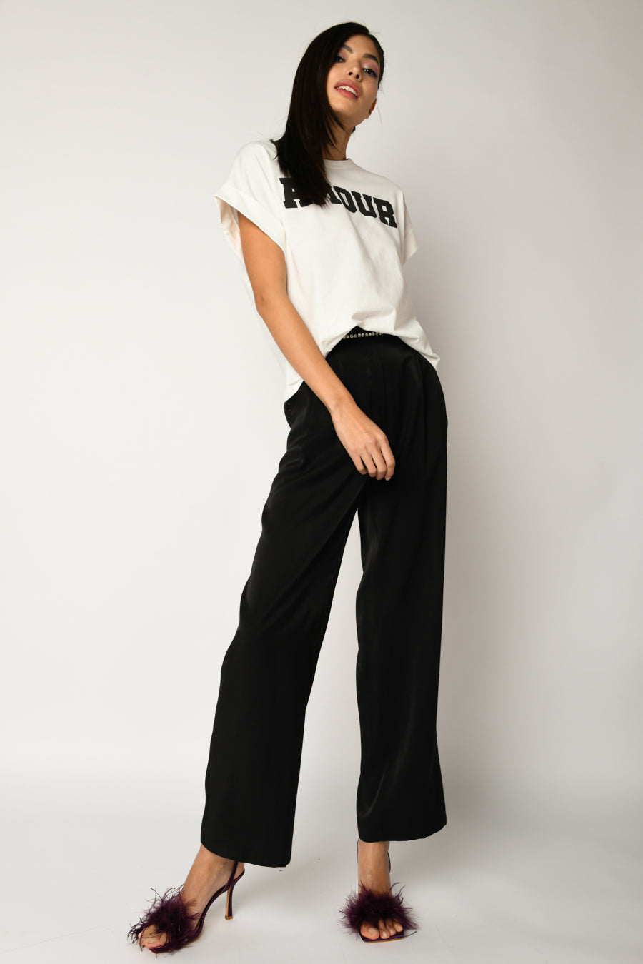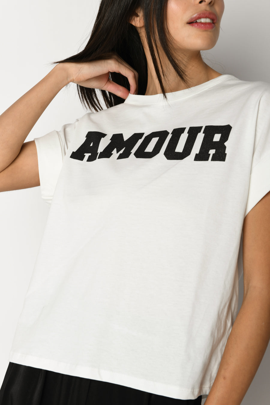 T-shirt in cotone bianco con scollo tondo, stampa Amour nera sul petto e maniche ad aletta con risvolto.