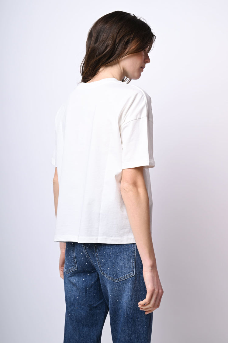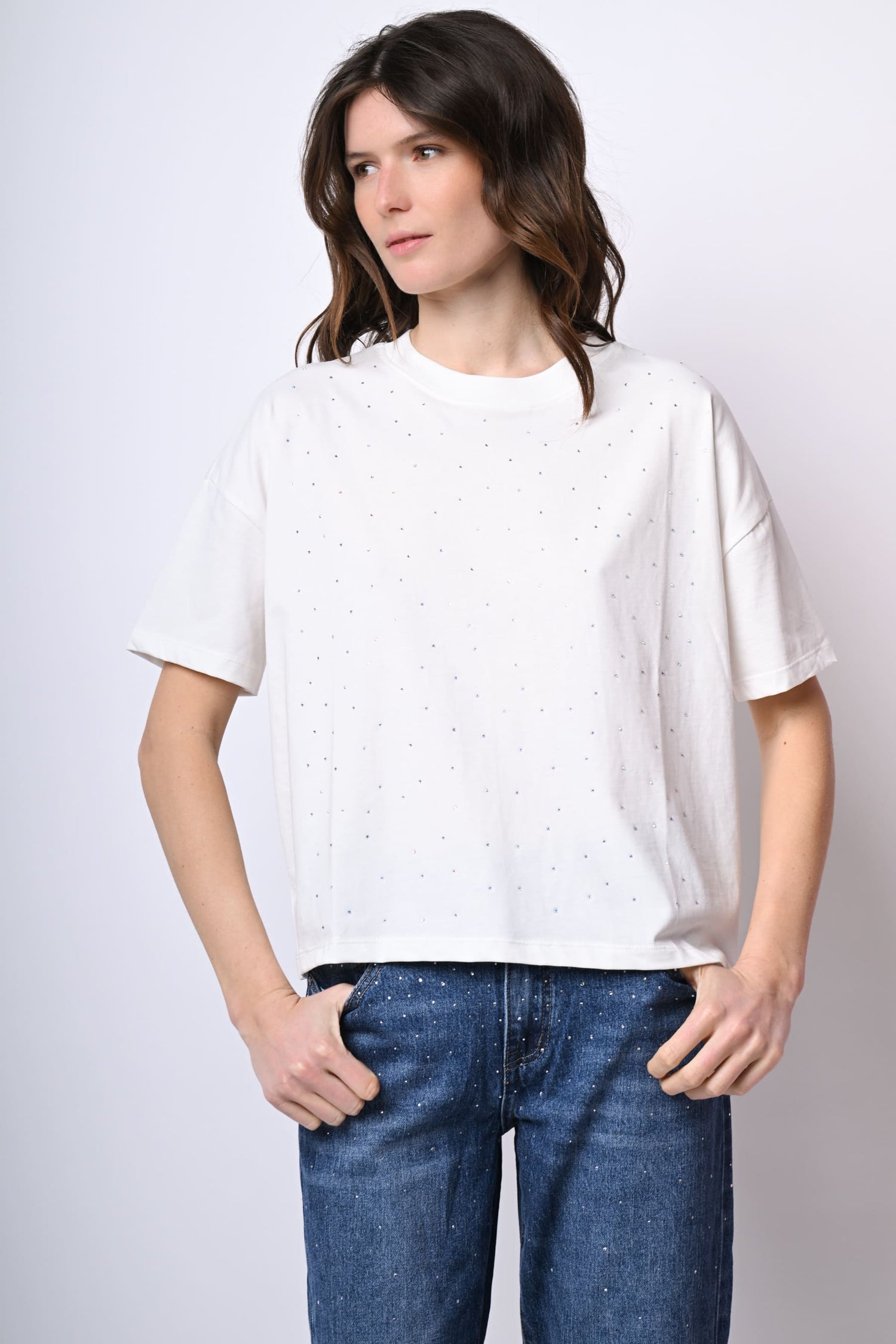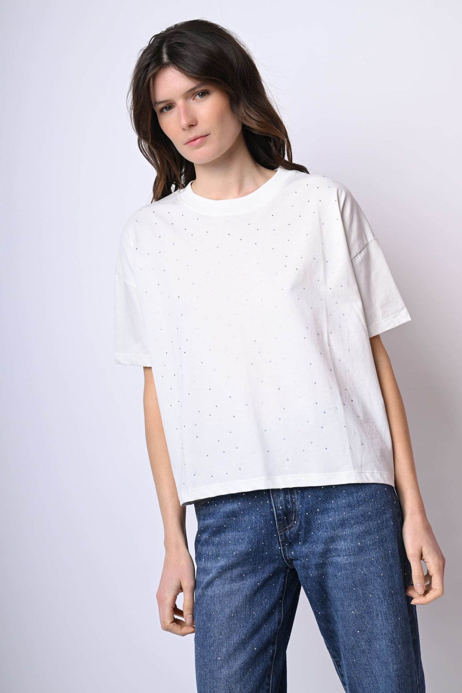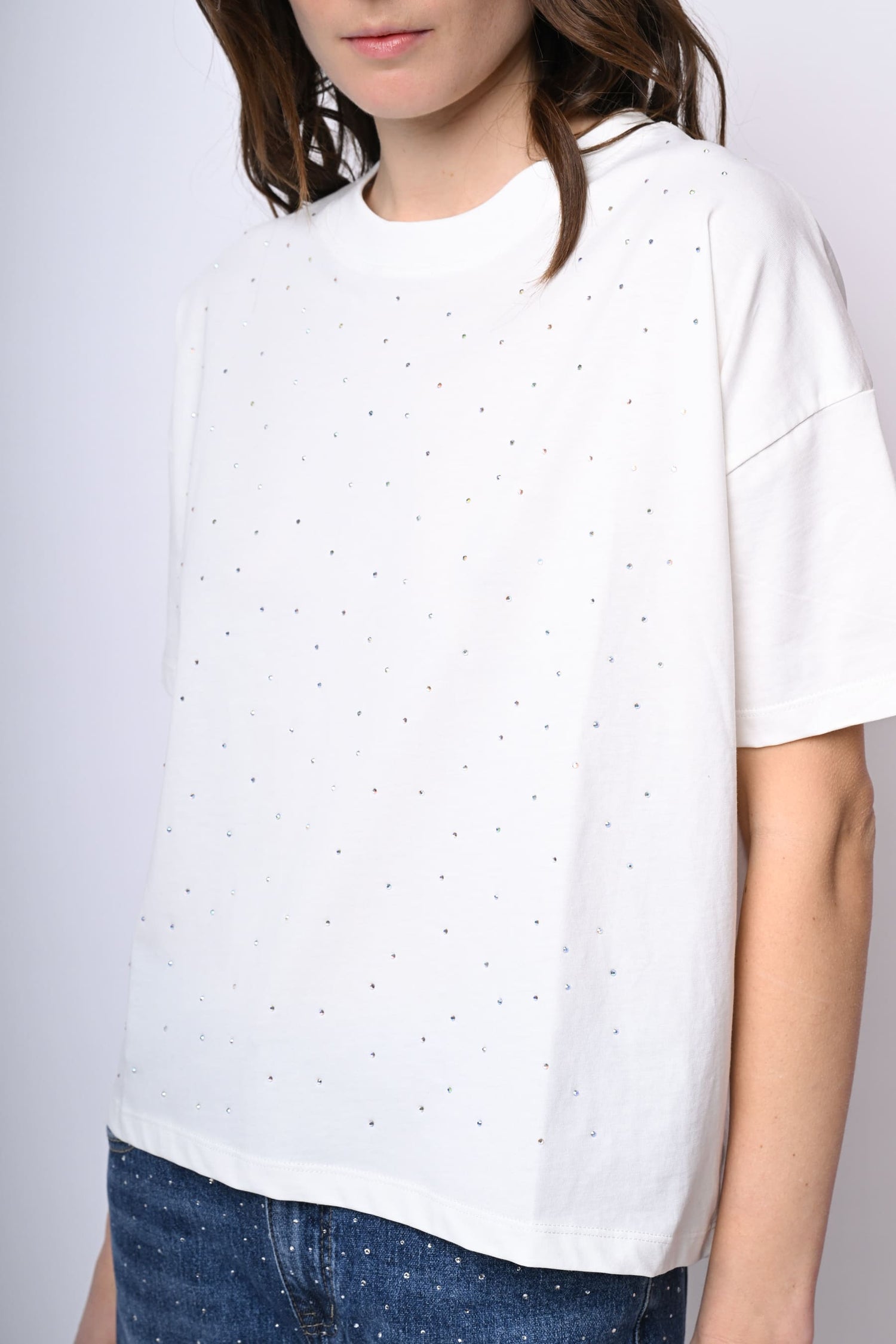 T-shirt in cotone bianco con scollo tondo, spalle scese e decorazione strass sul davanti.