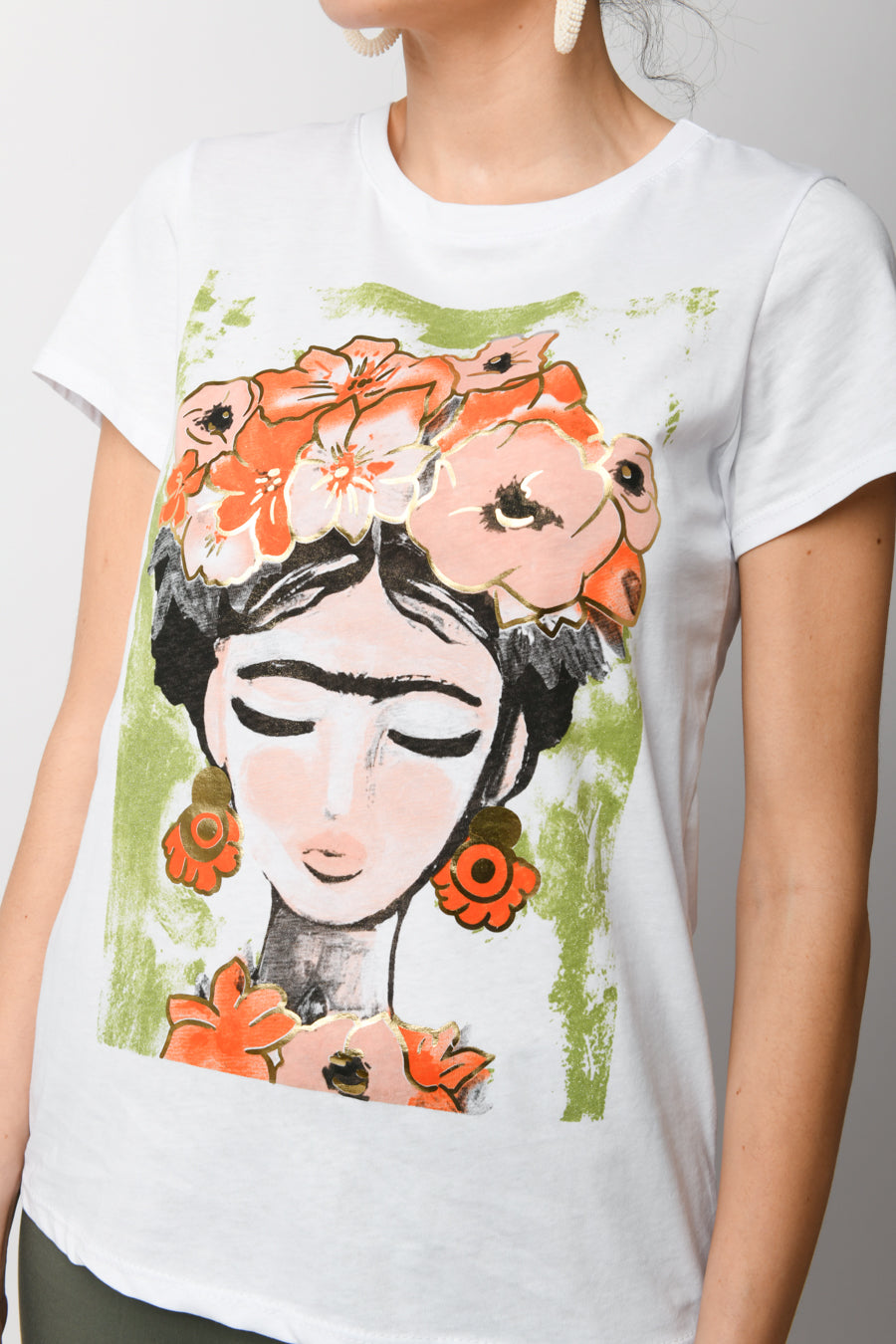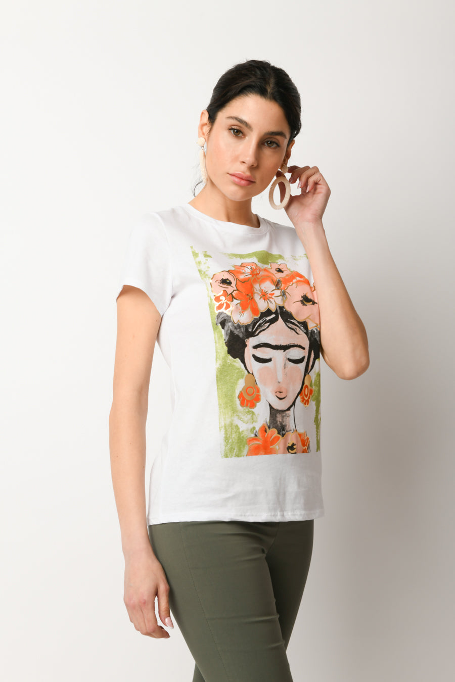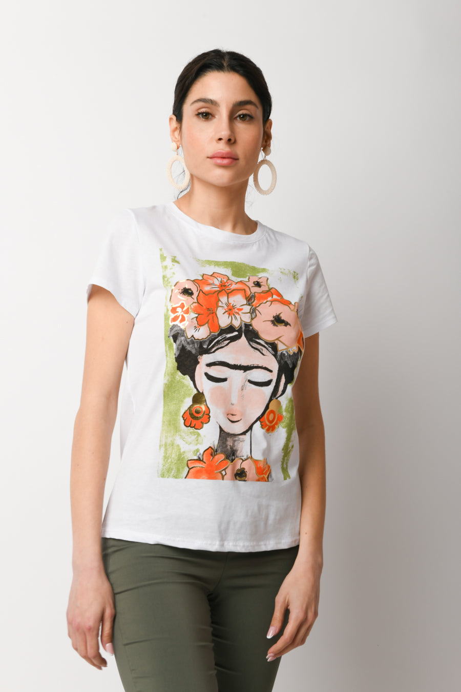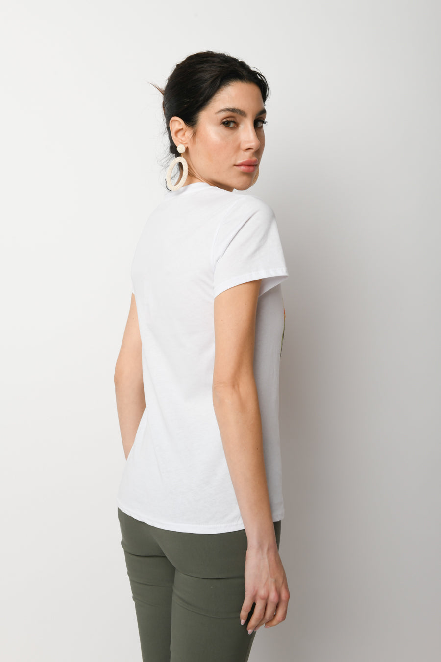T-shirt in cotone stretch bianco con scollo tondo e stampa frontale multicolor.
