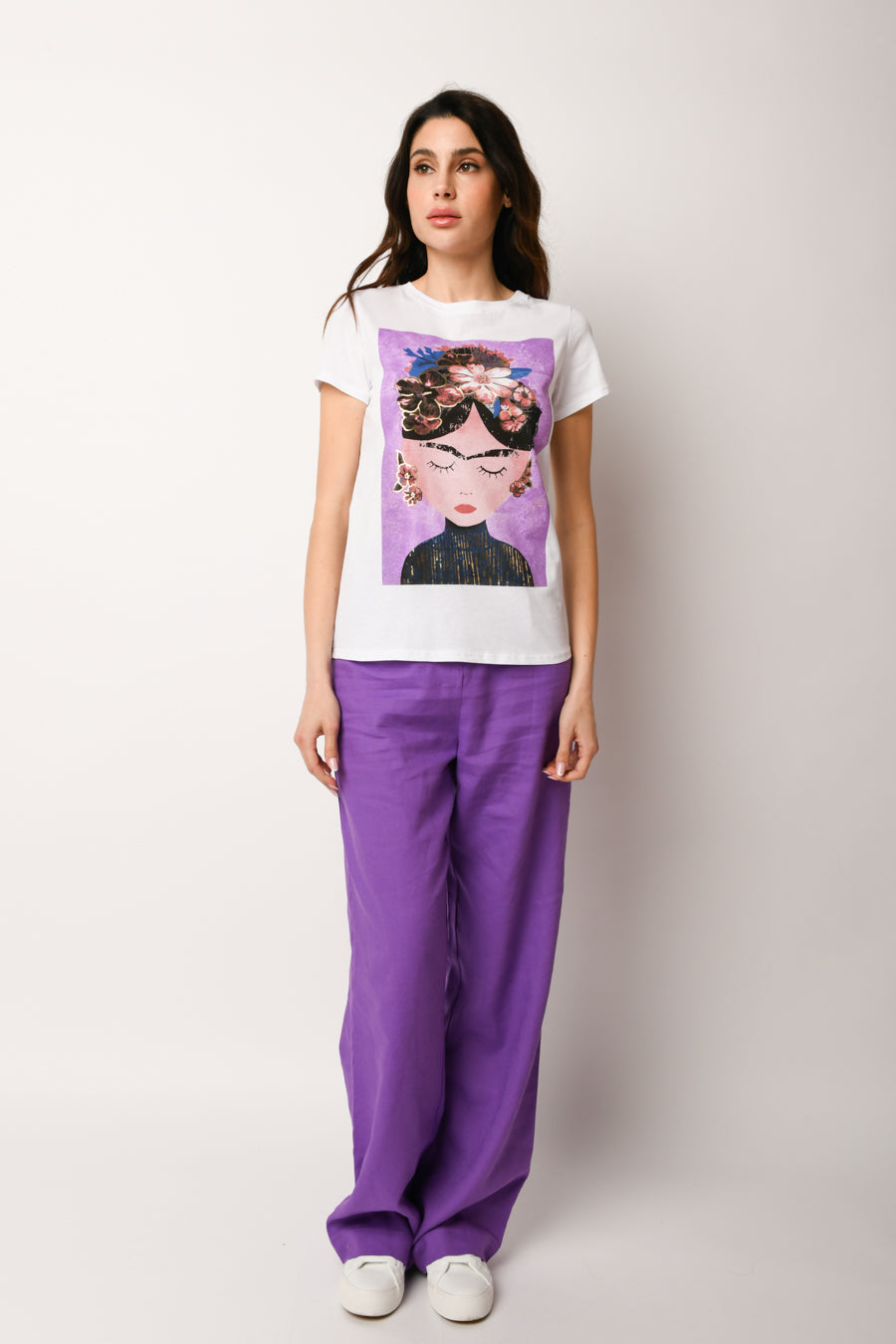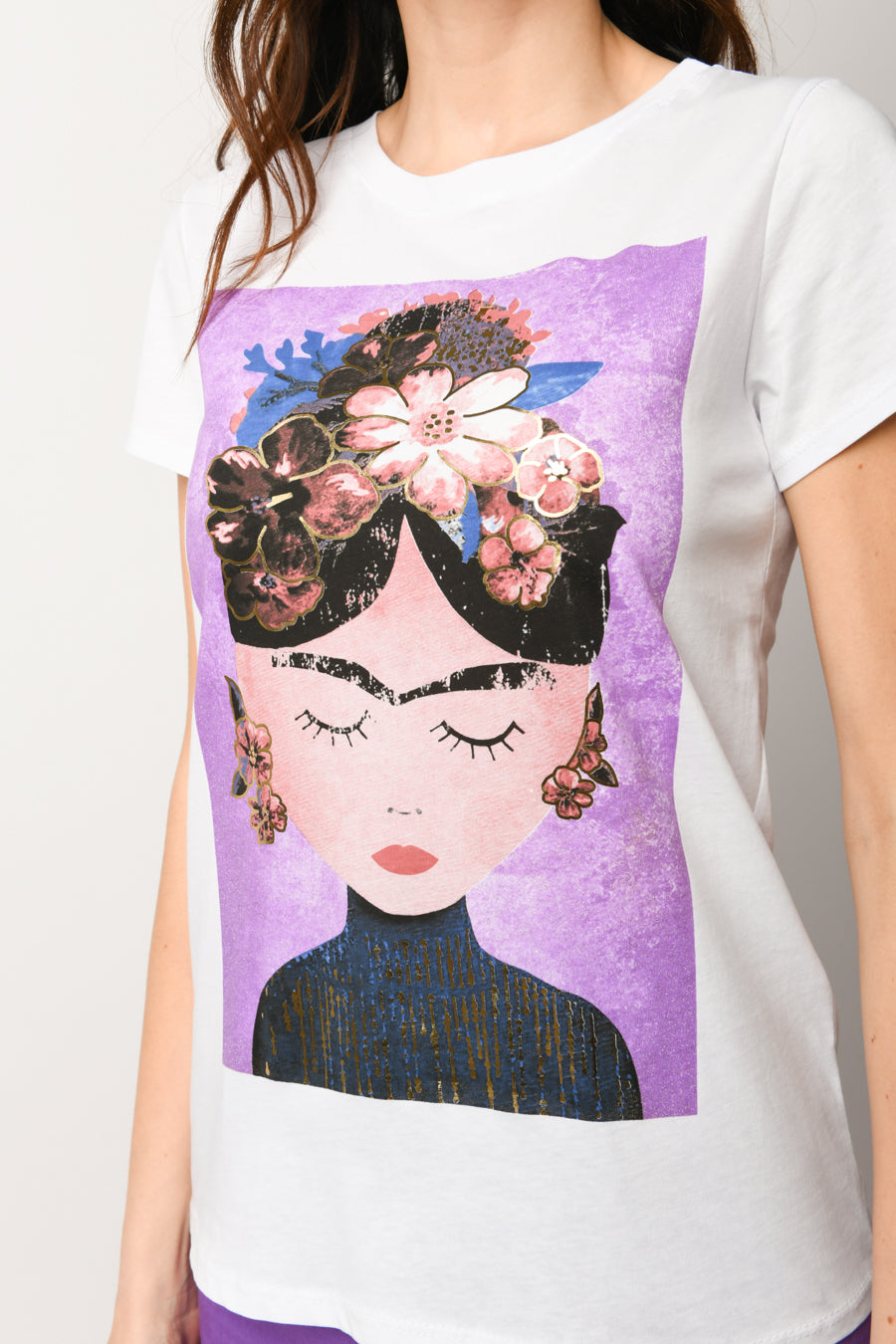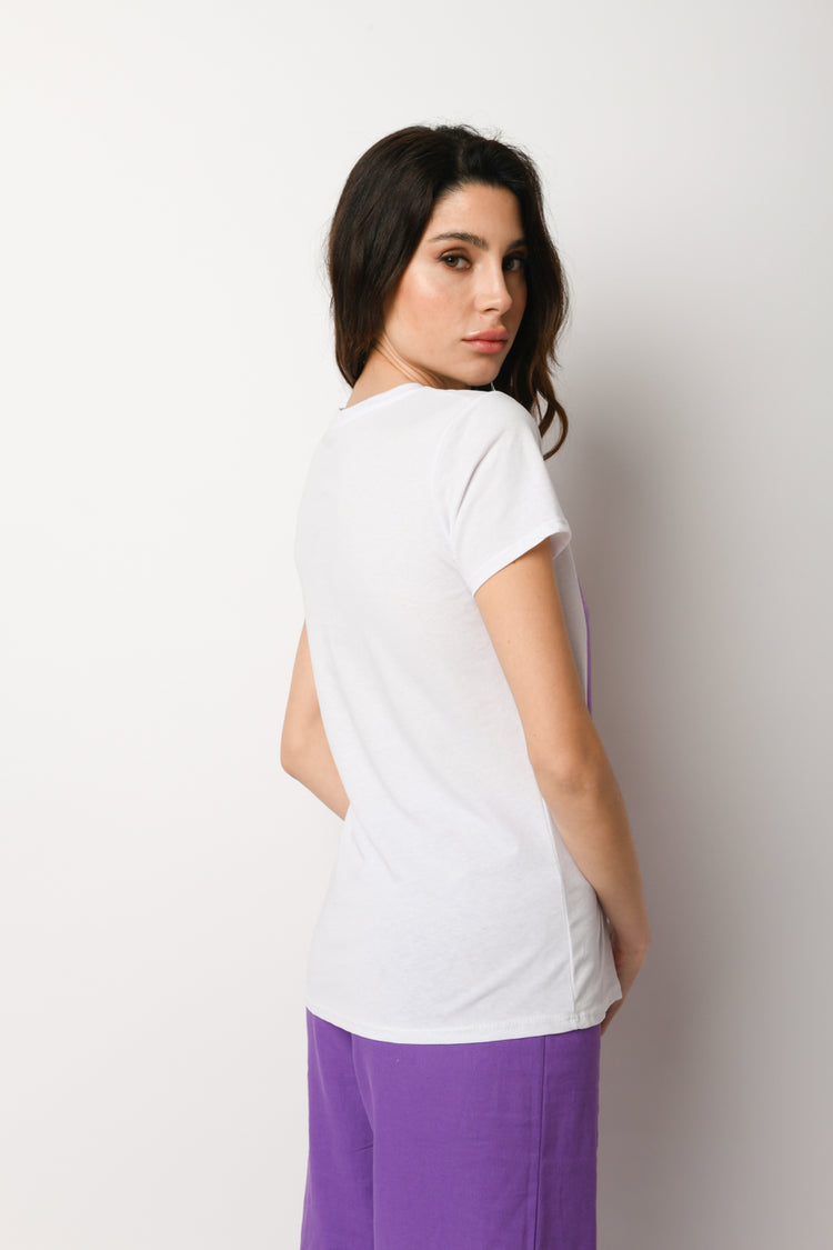 T-shirt in cotone stretch bianco con scollo tondo e stampa frontale multicolor.