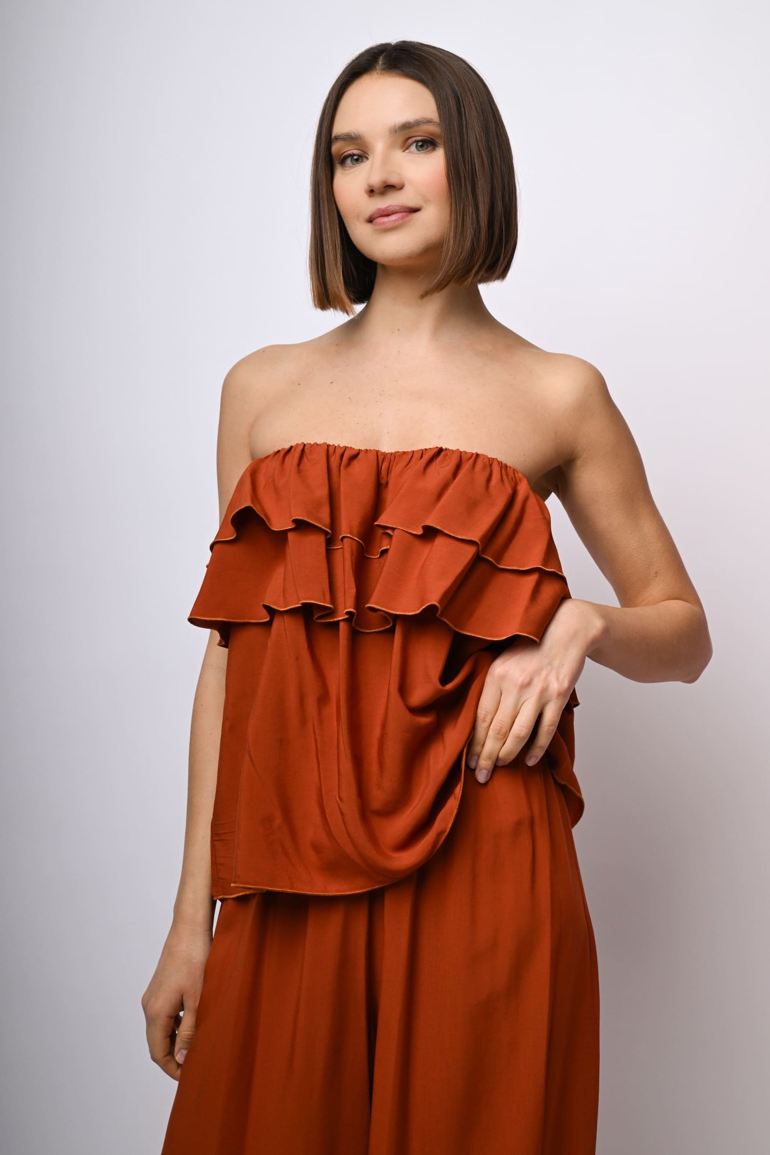 Top senza spalline in viscosa nuance coccio con scollo elasticizzato impreziosito da doppia balza e orlo stondato sul retro.