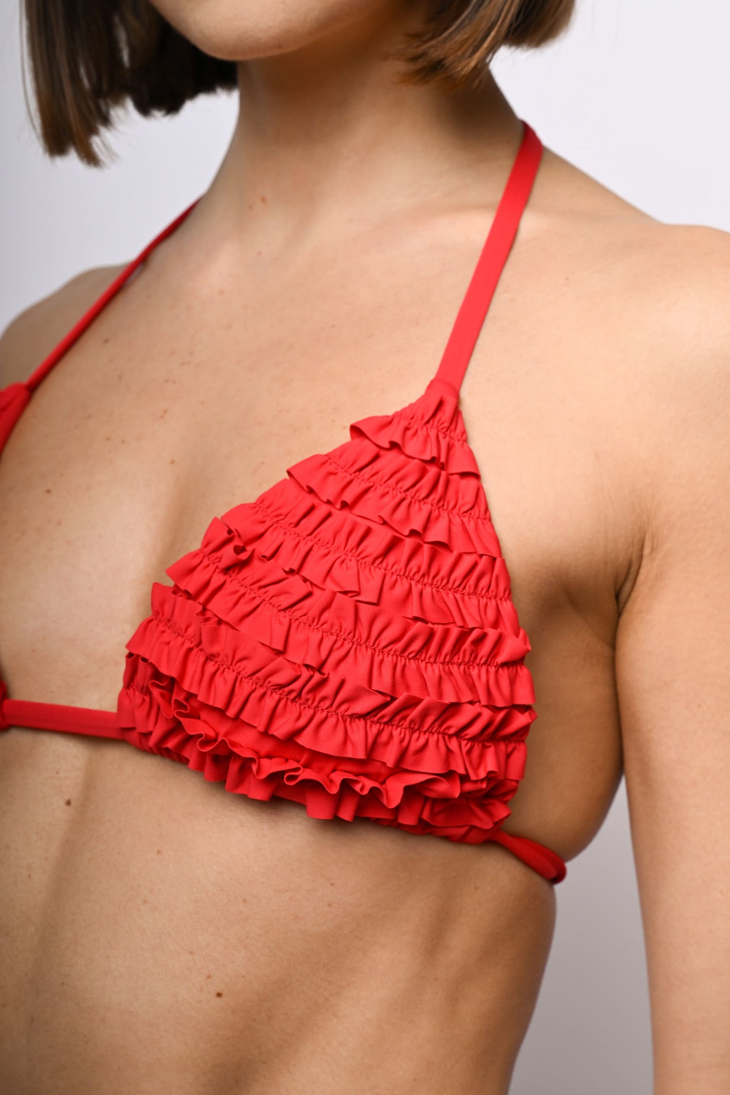 Top per bikini rosso con coppe a triangolo impreziosite da rouches e laccetti da annodare sul retro.