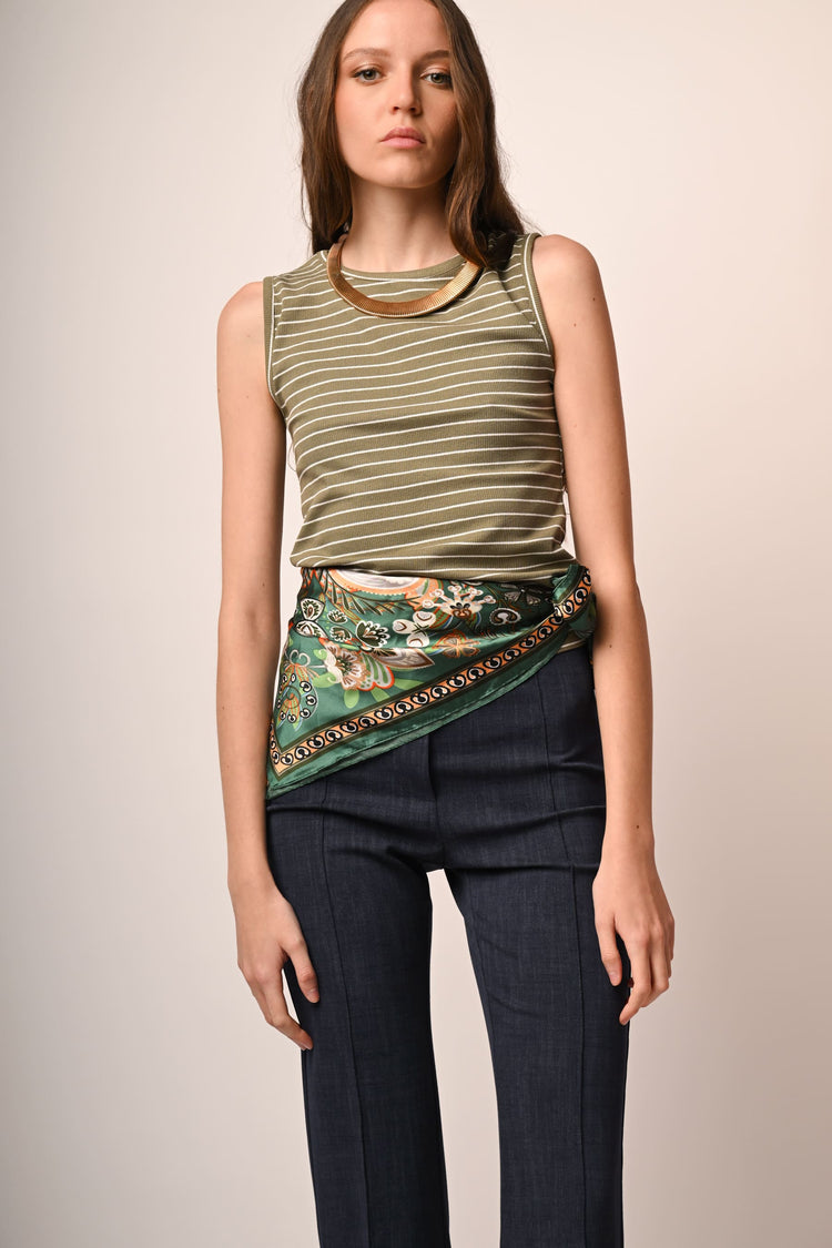 Canotta in maglia misto viscosa con righe bianche su fondo verde, scollo tondo e silhouette aderente.
