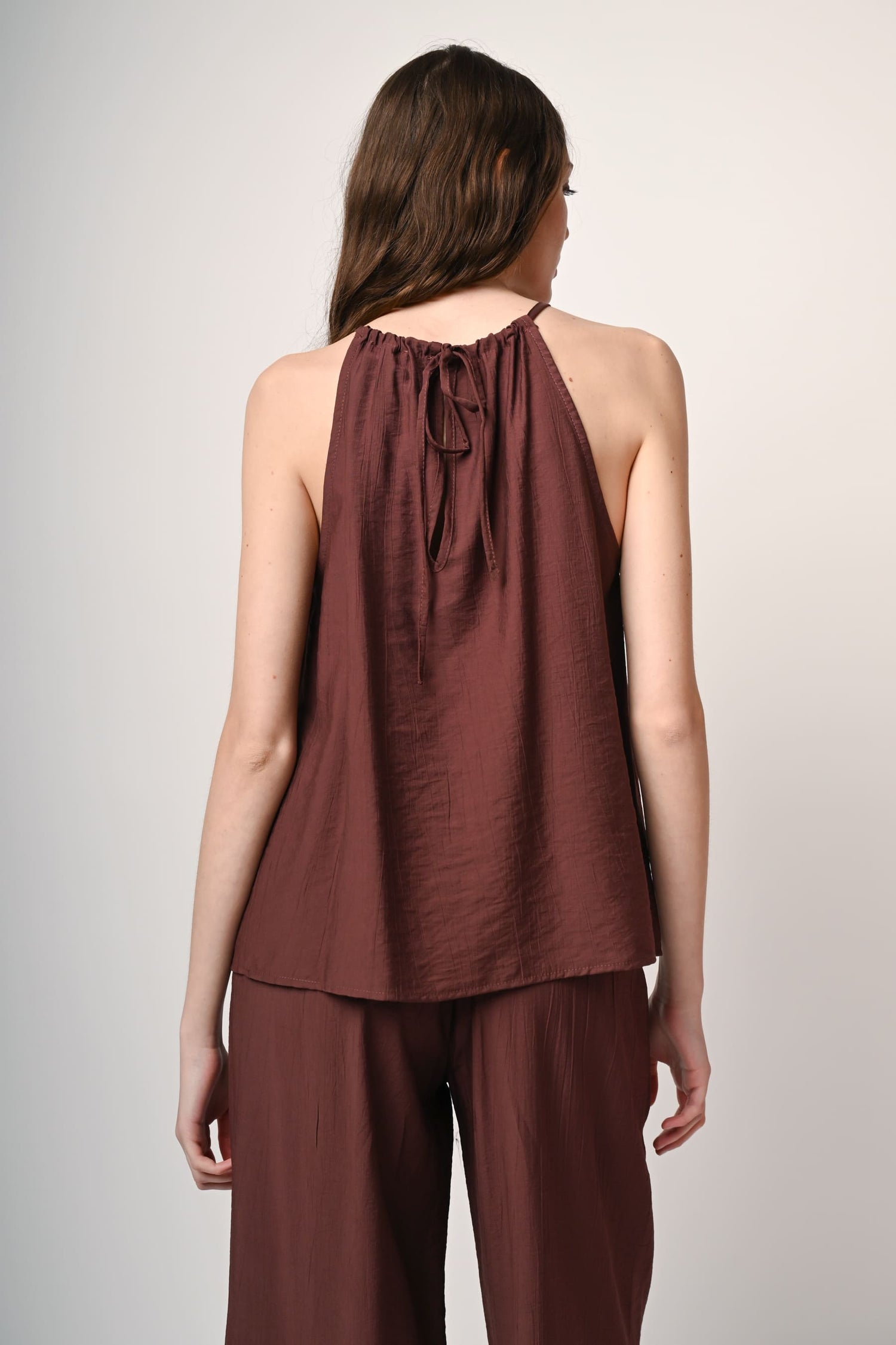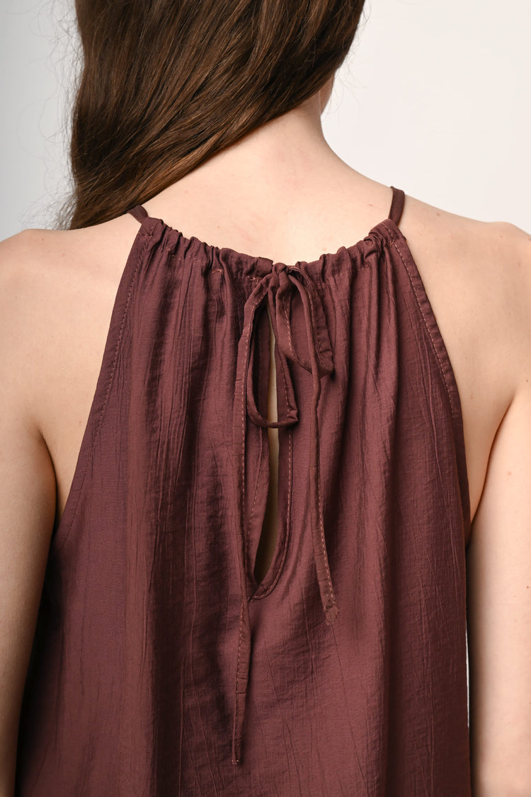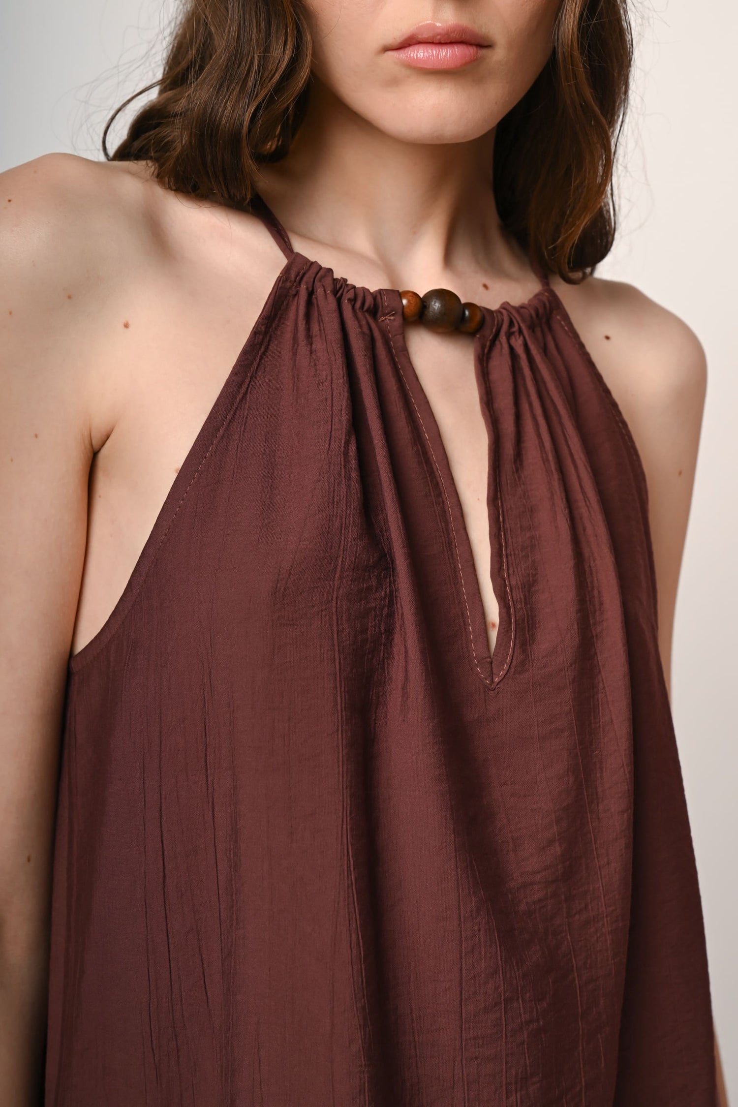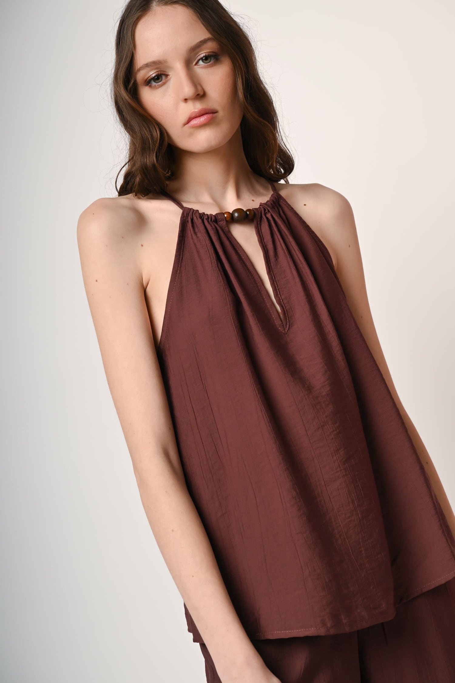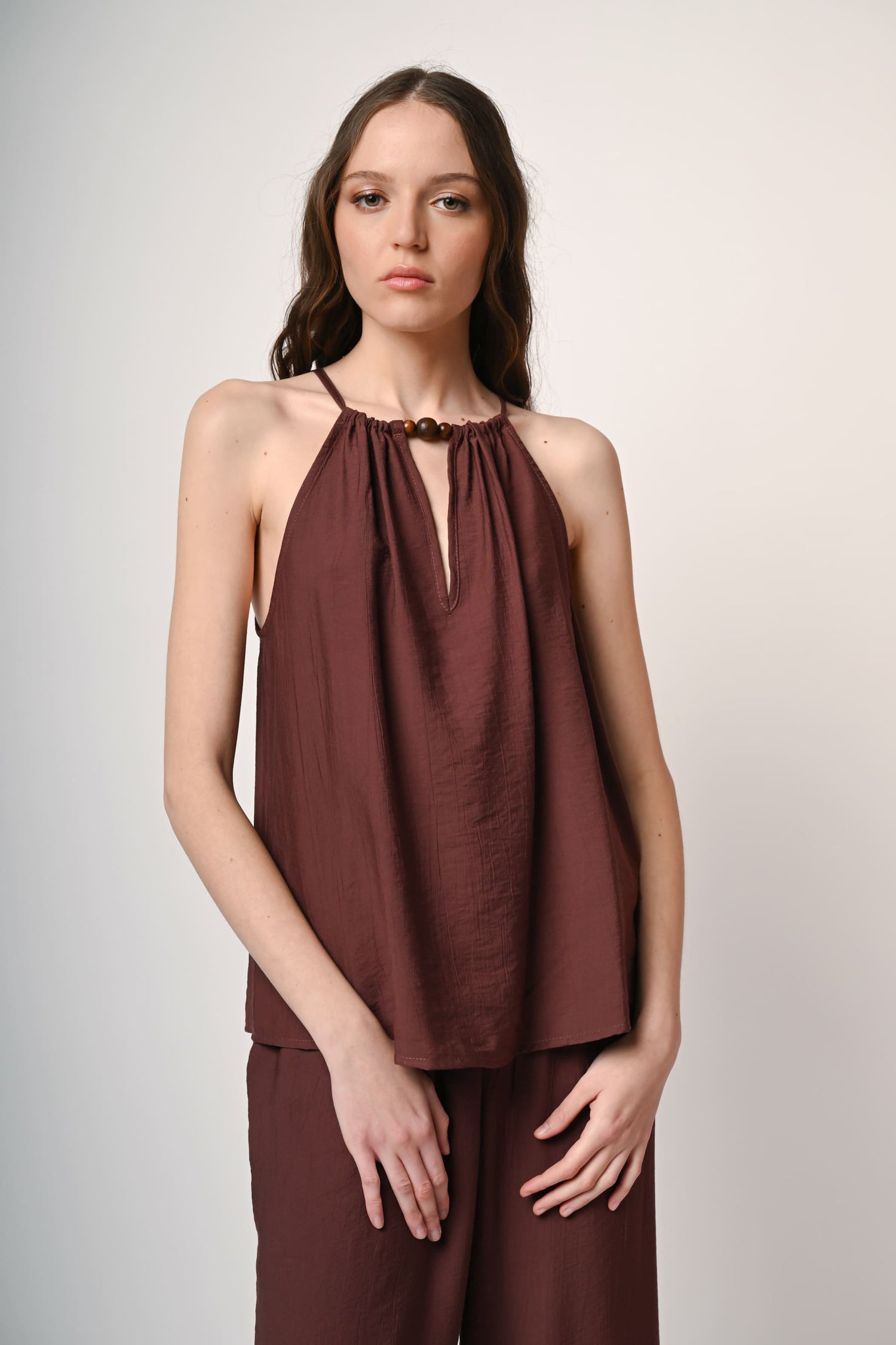 Top misto viscosa e nylon marrone con taglio allamericana, laccetti da annodare allo scollo con perline decorative in legno e cut-out a goccia.