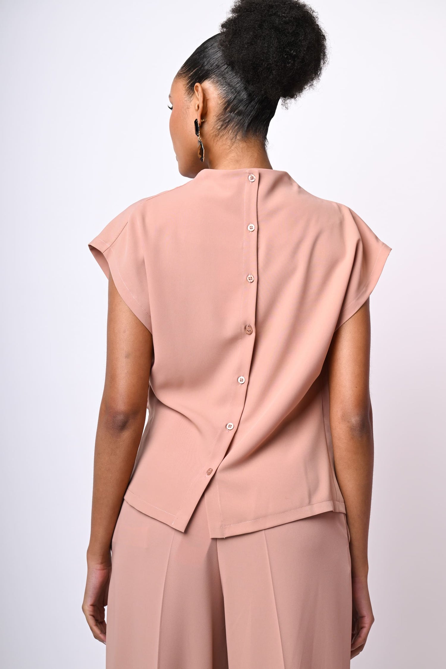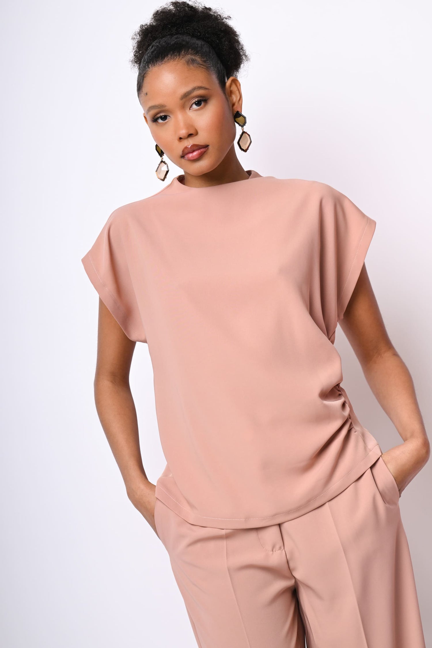 Top in crêpe stretch rosa con scollo tondo, maniche ad aletta, arricciatura laterale, abbottonatura al centro dietro e orlo stondato.