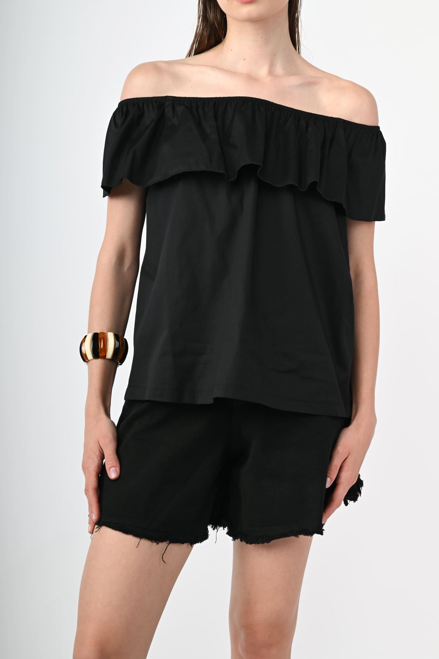 Top in cotone stretch nero con spalle scoperte, scollo elasticizzato con volant e taglio dritto.