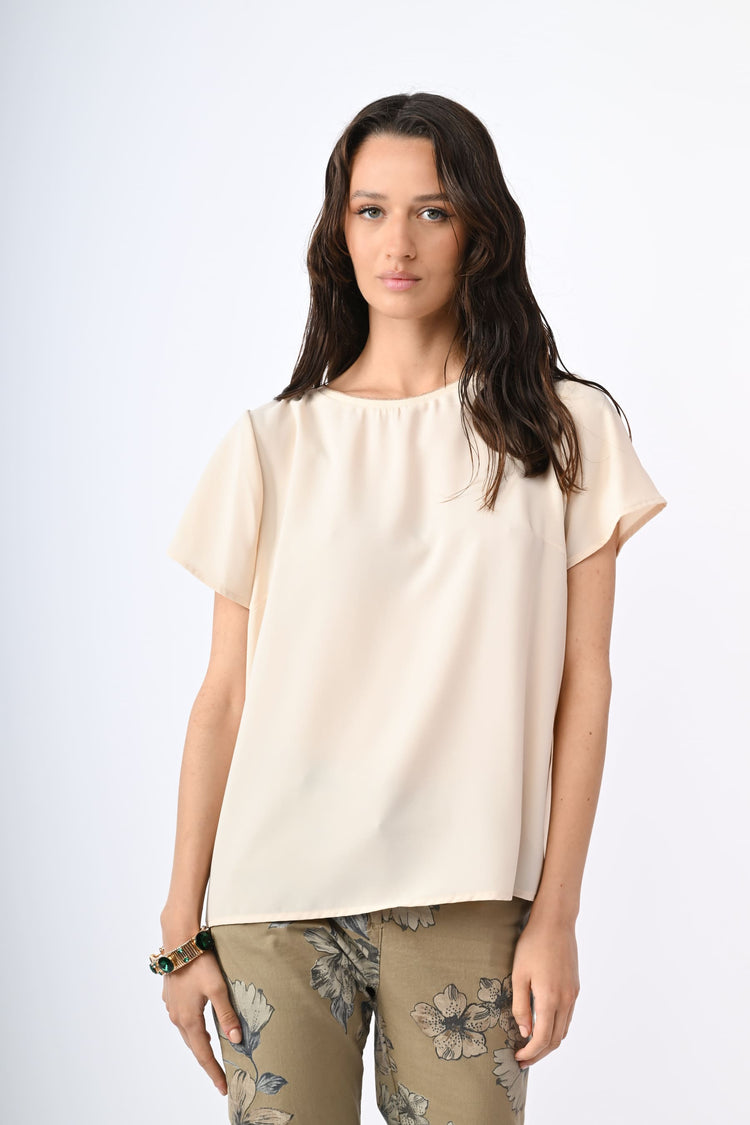 T-shirt in tessuto beige con profilo in maglia lurex argentata allo scollo tondo.