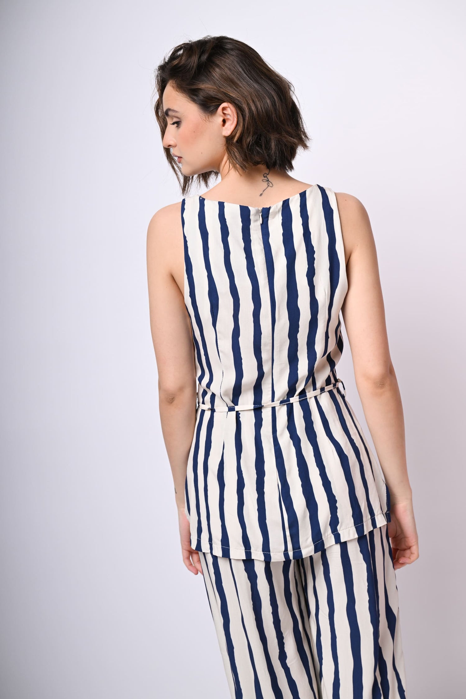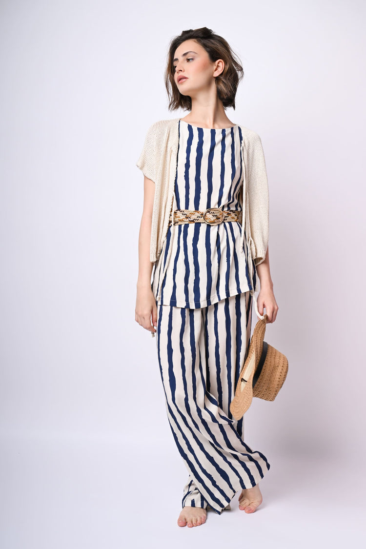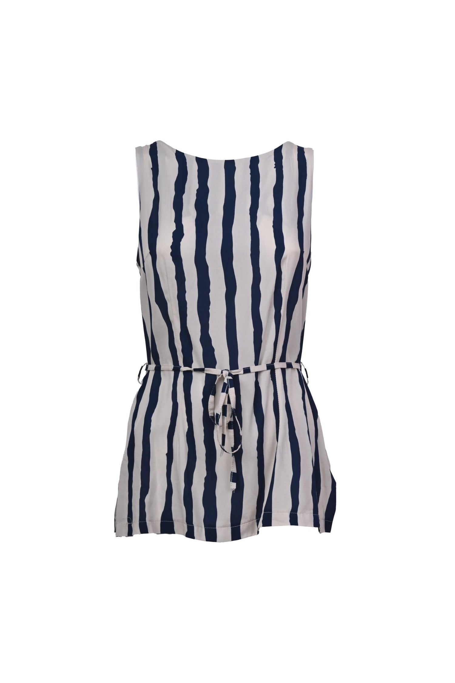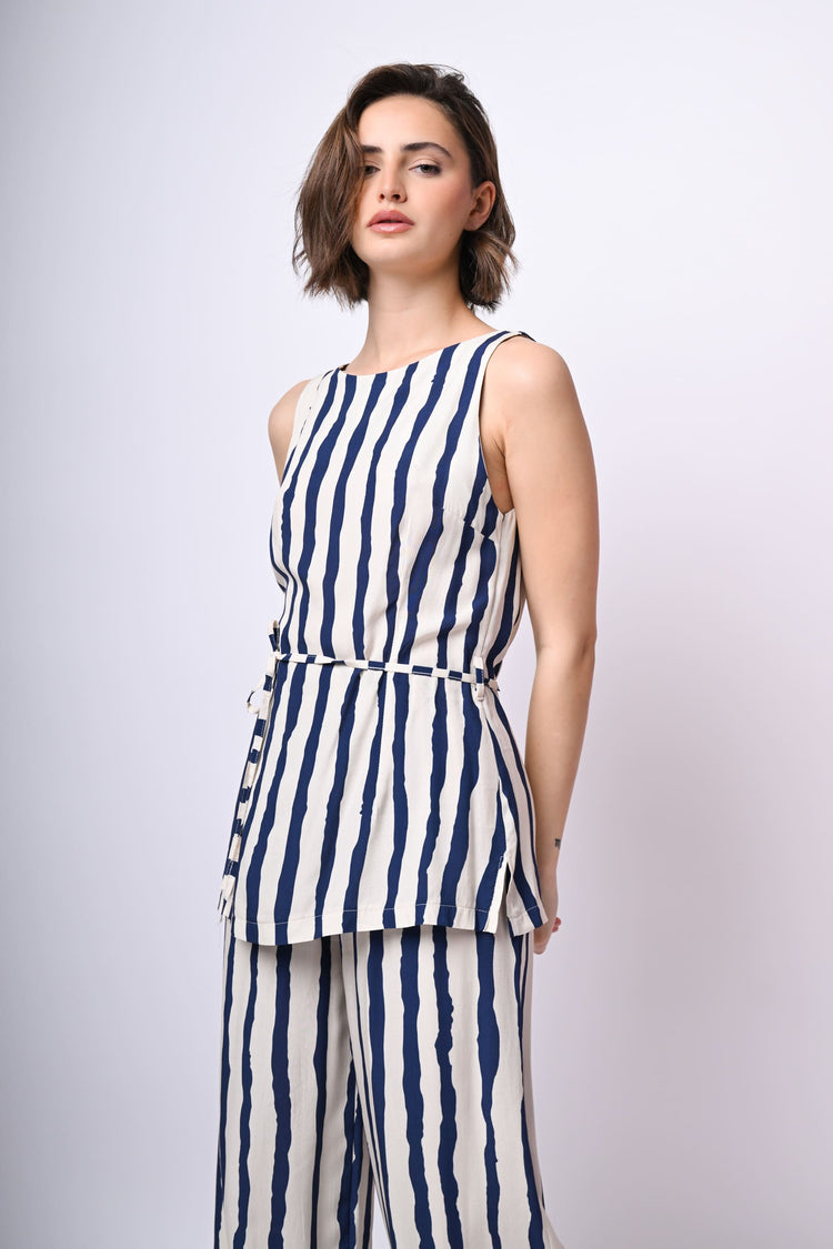 Top lungo in viscosa a stampa righe blu su fondo bianco con scollo a barchetta, cintura sottile coordinata da annodare alla vita, chiusura con zip al centro dietro e orlo stondato.