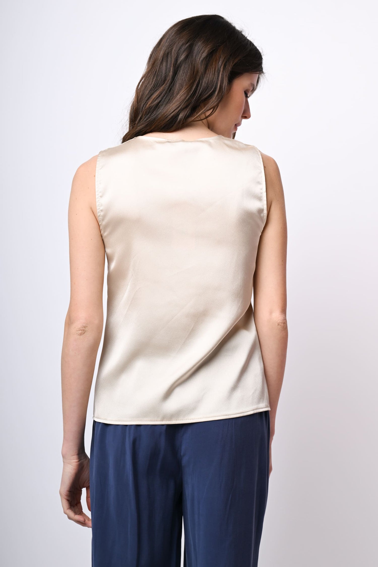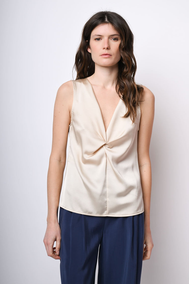 Top in raso beige con scollo a V e nodo drappeggiato centrale.