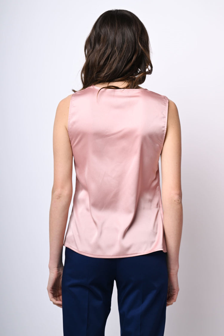 Top in raso rosa con scollo a V e nodo drappeggiato centrale.