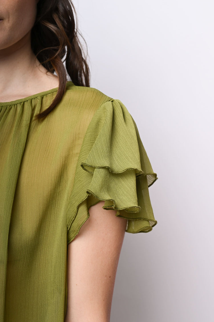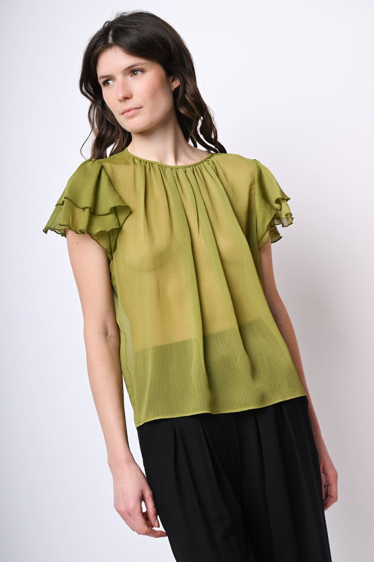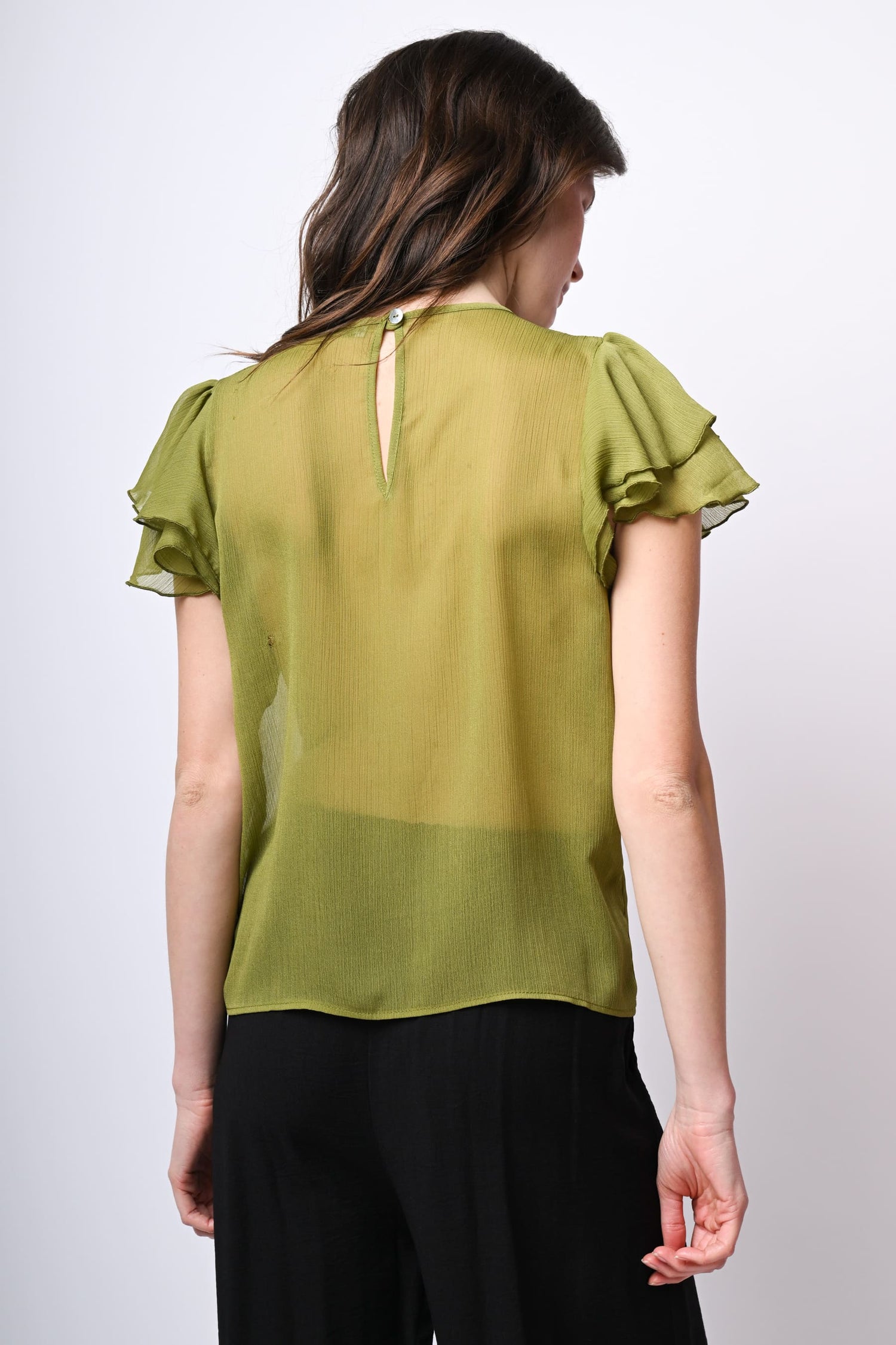 Top in tulle verde semi-trasparente con scollo tondo, drappeggi sul davanti, goccia sul retro con bottone di chiusura e maniche corte a balze.