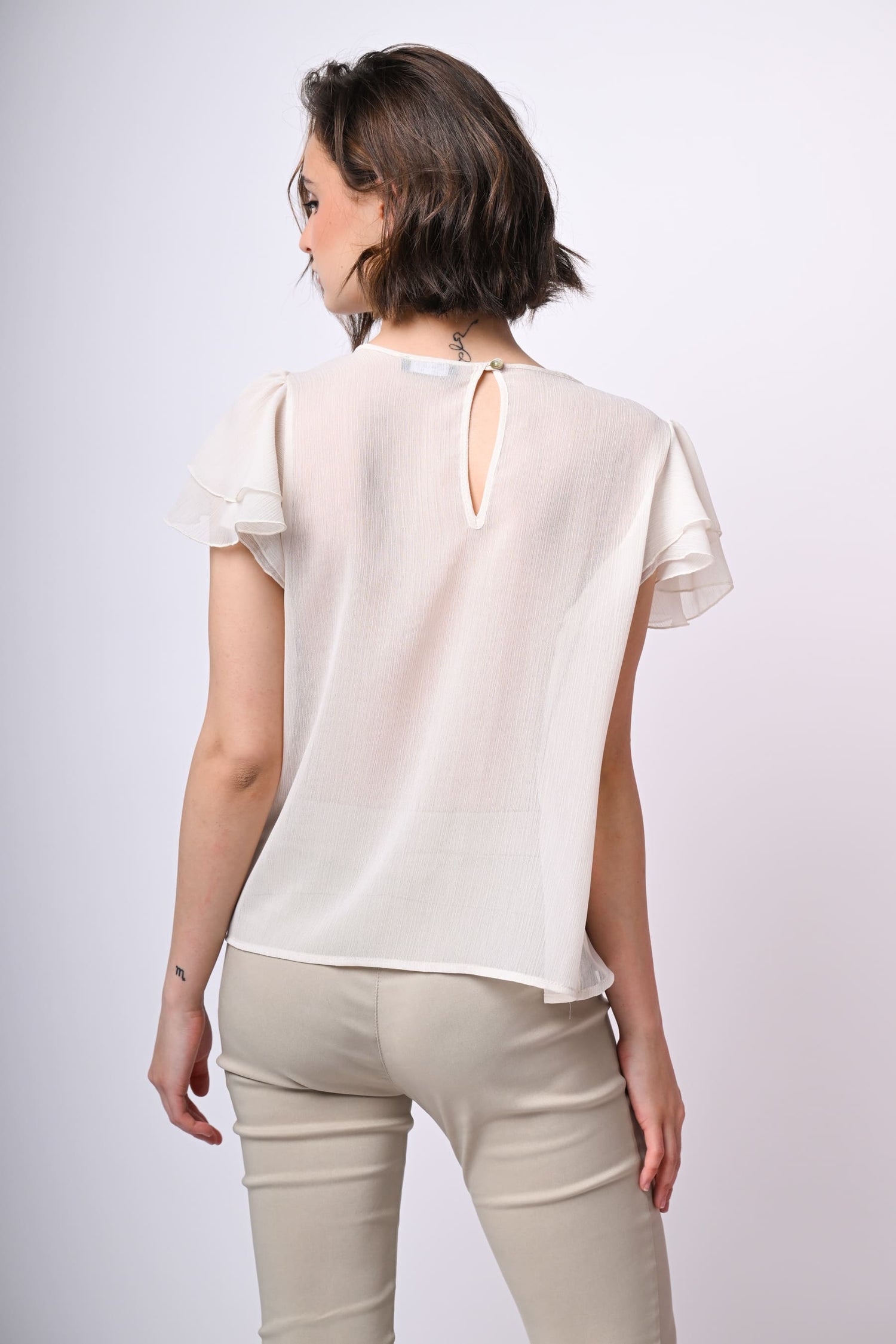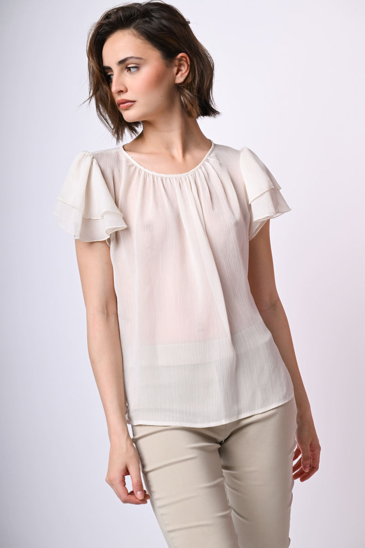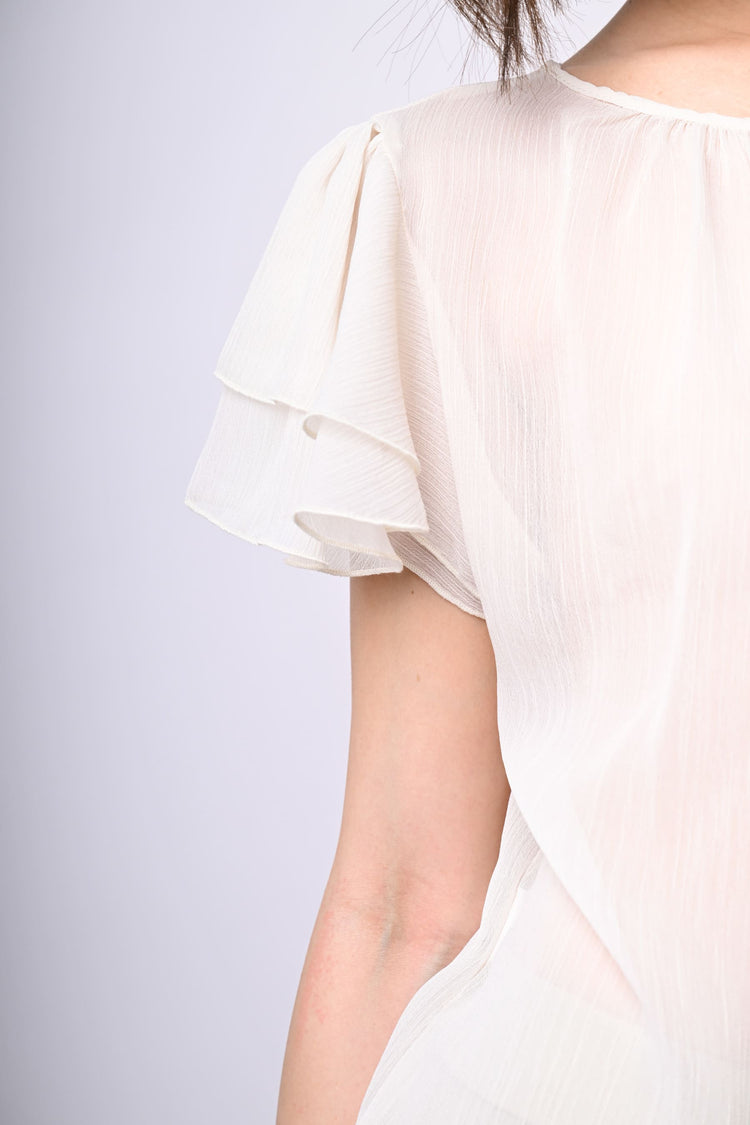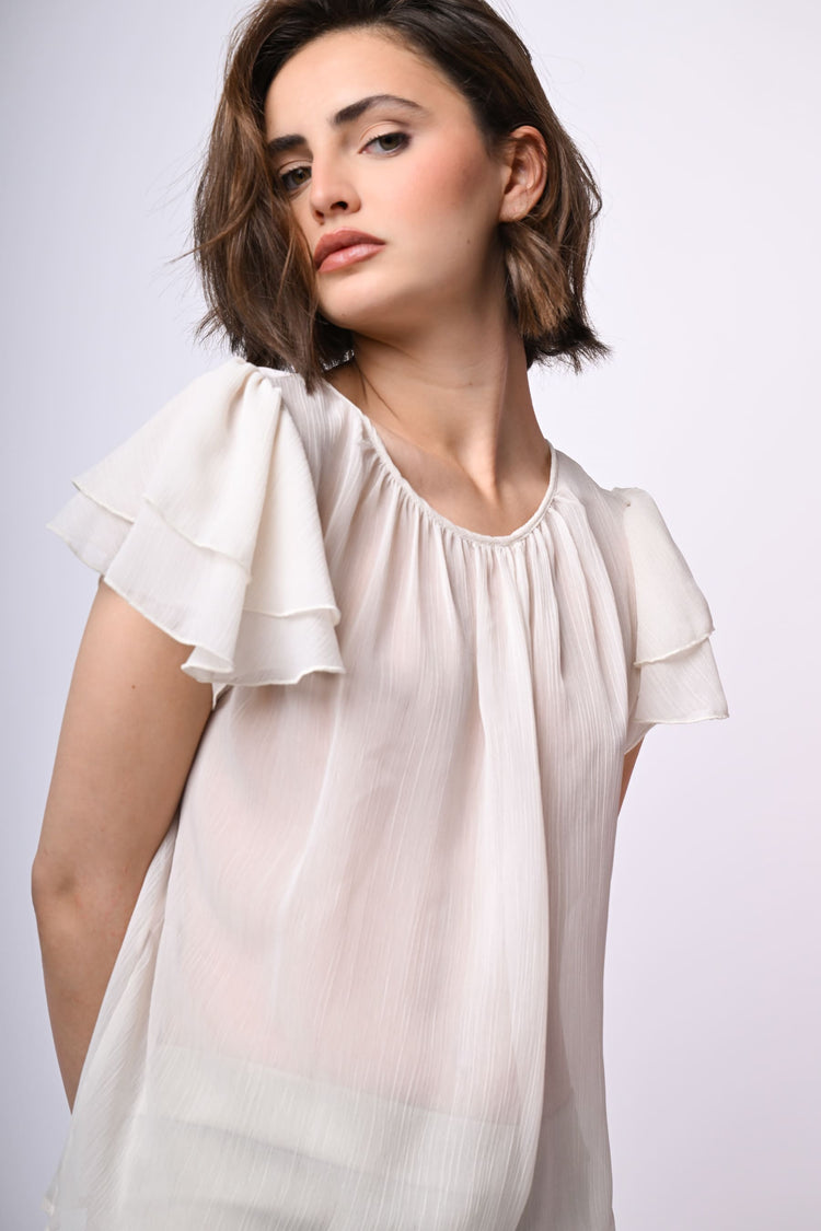Top in tulle bianco semi-trasparente con scollo tondo, drappeggi sul davanti, goccia sul retro con bottone di chiusura e maniche corte a balze.